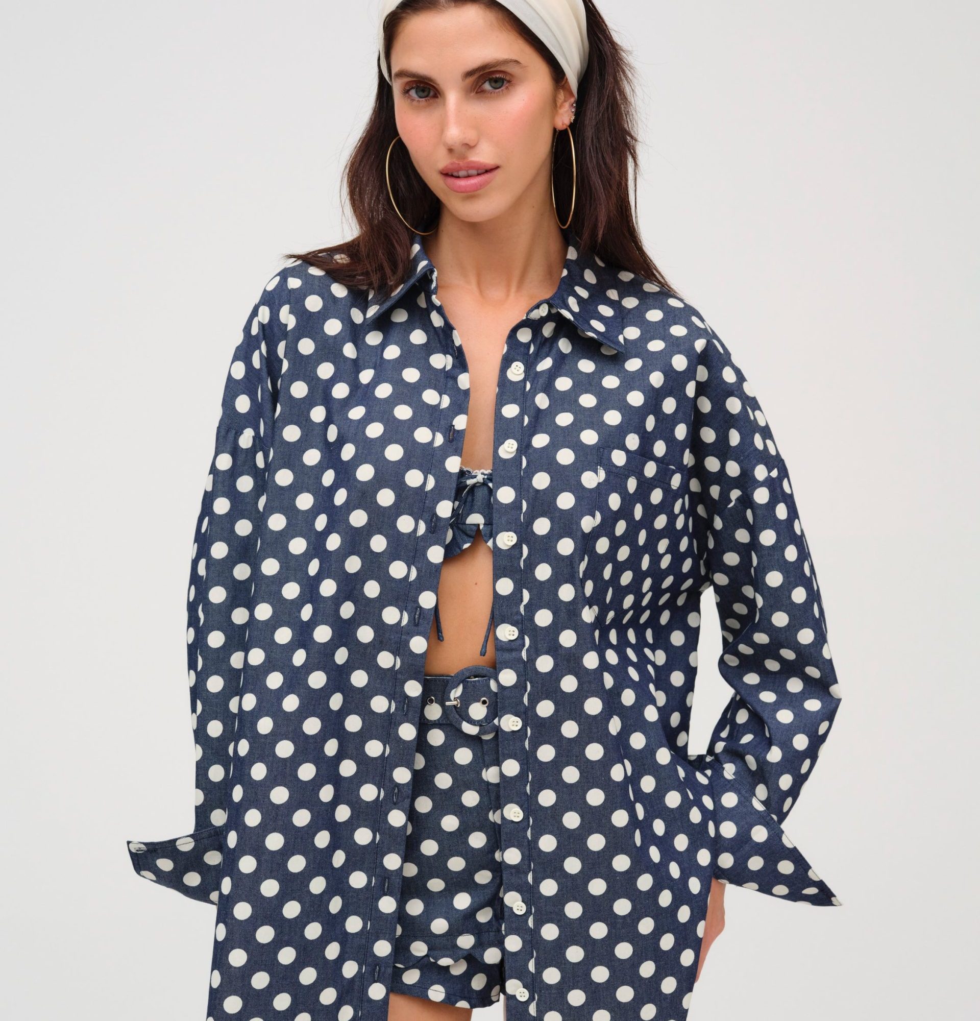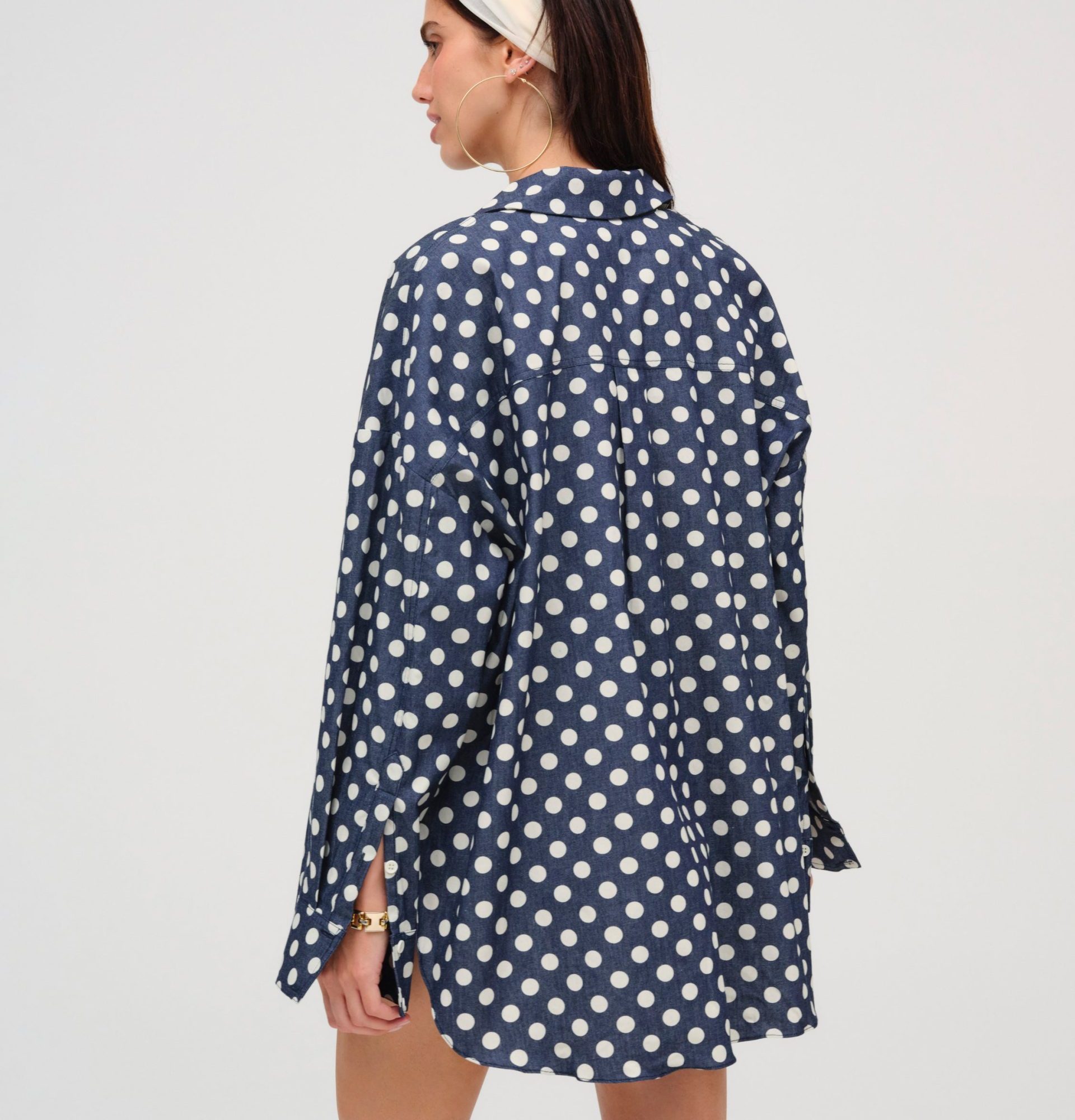 dolly dot denim button down top indigo