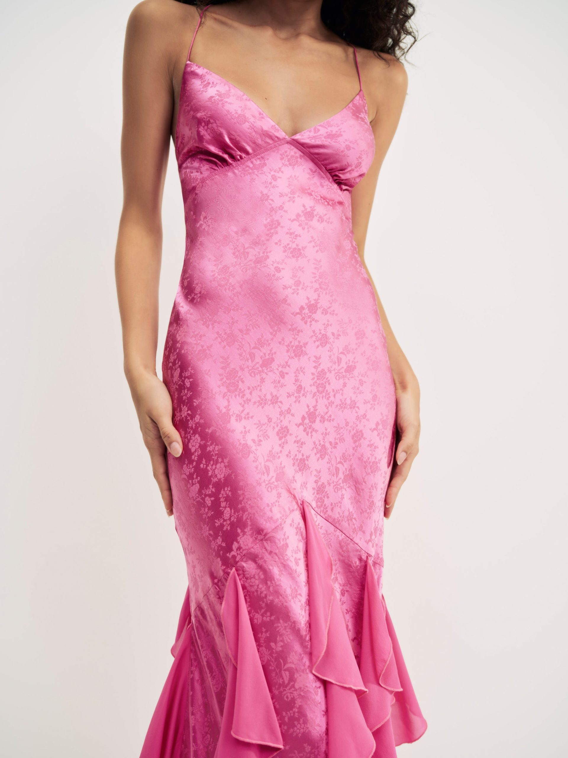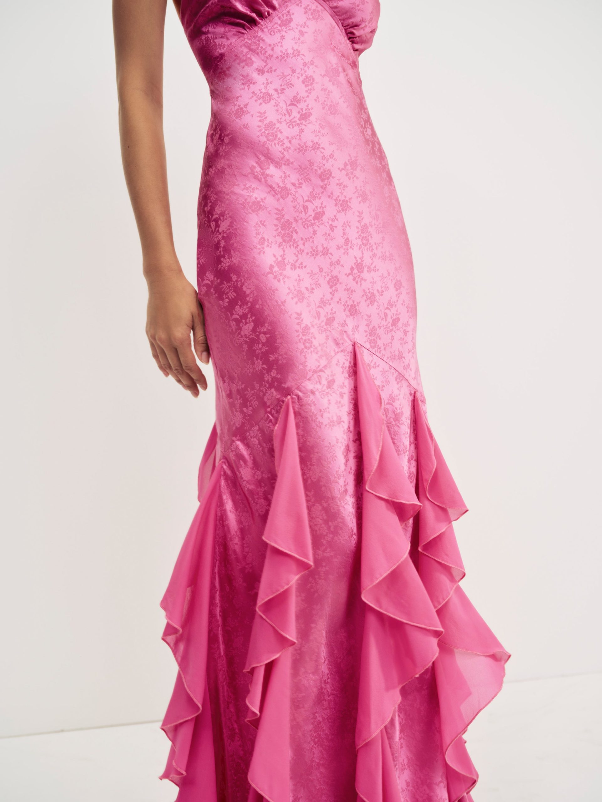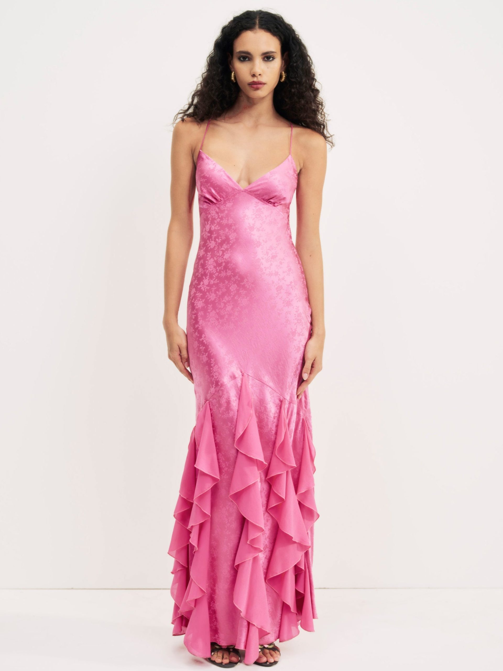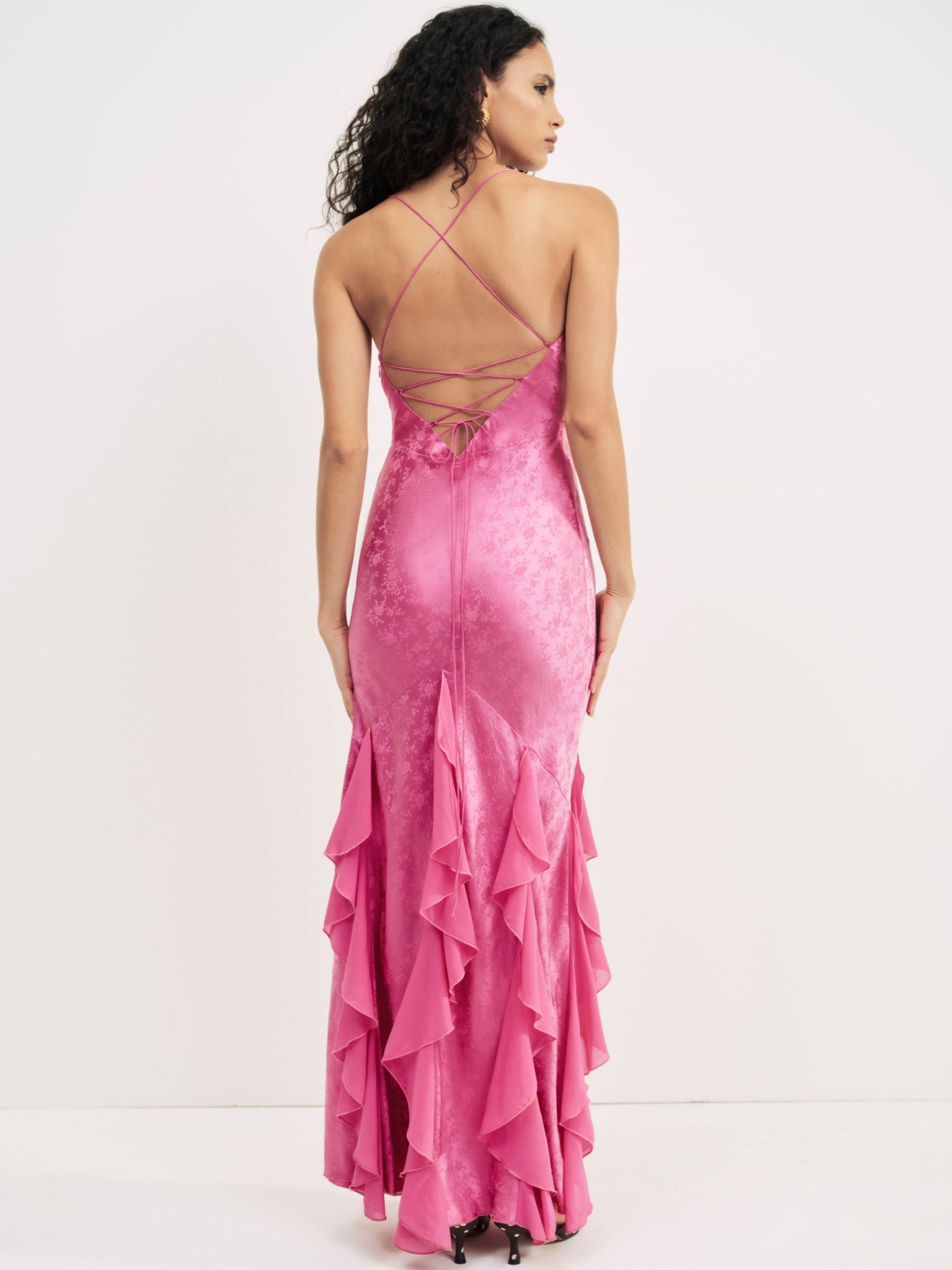 Inspired by timeless ‘90s silhouettes, the Silk ruffled maxi dress is crafted in 100% silk and spotlights a figure-flattering silhouette. This pink gown features a lace-up open back and a ruffled skirt—an elegant evening gown that makes for perfect bridesmaids dress.