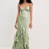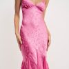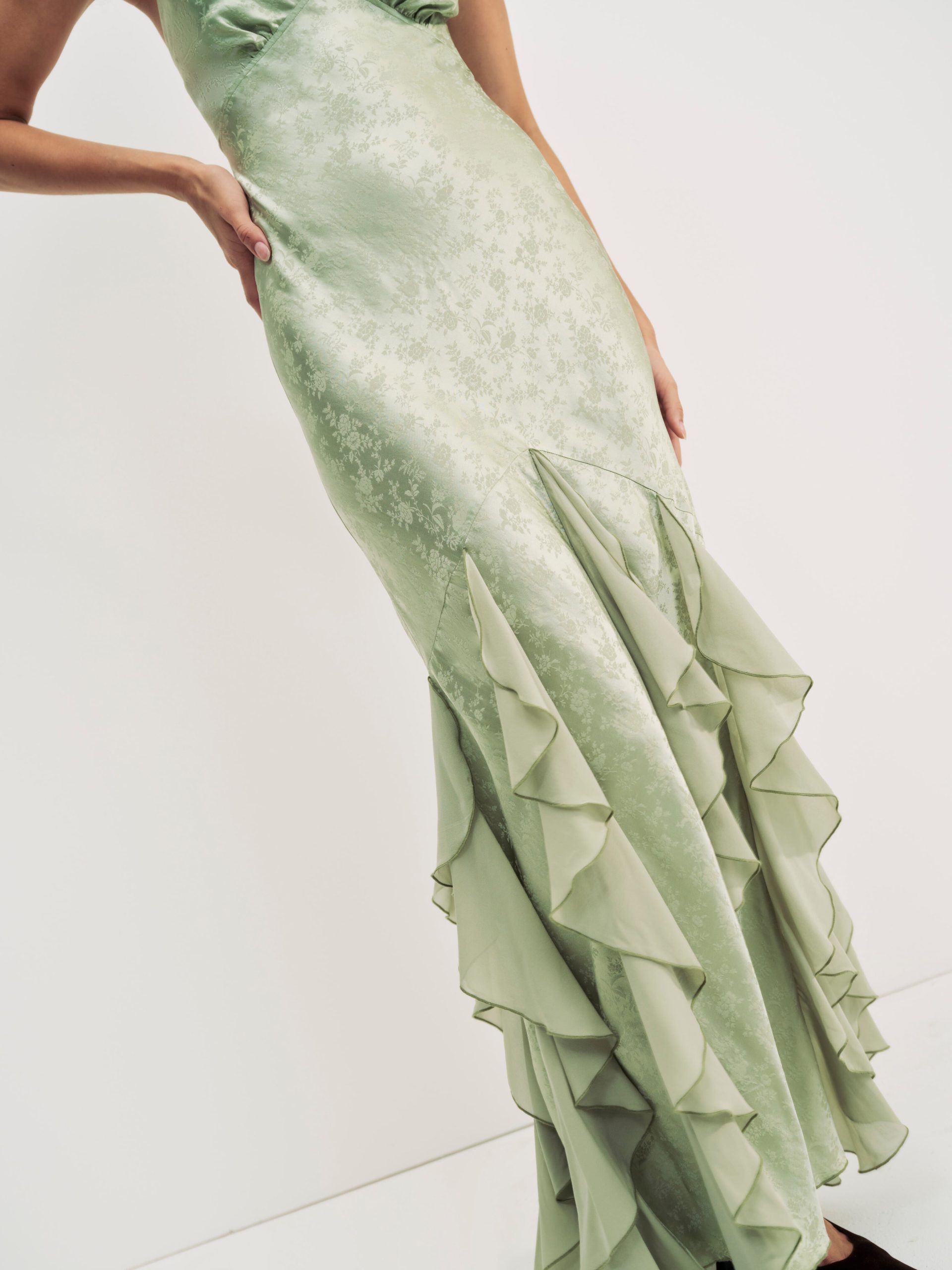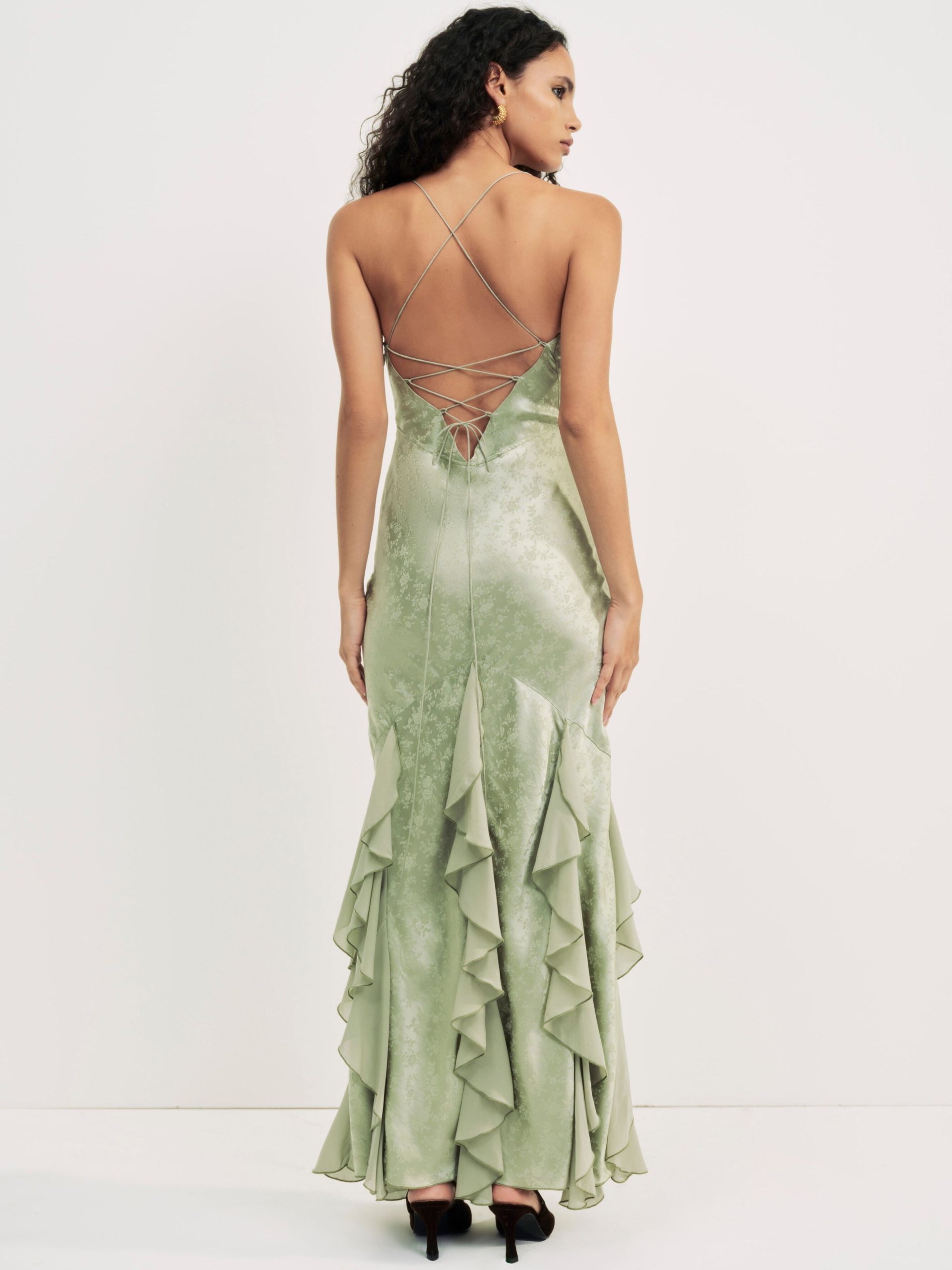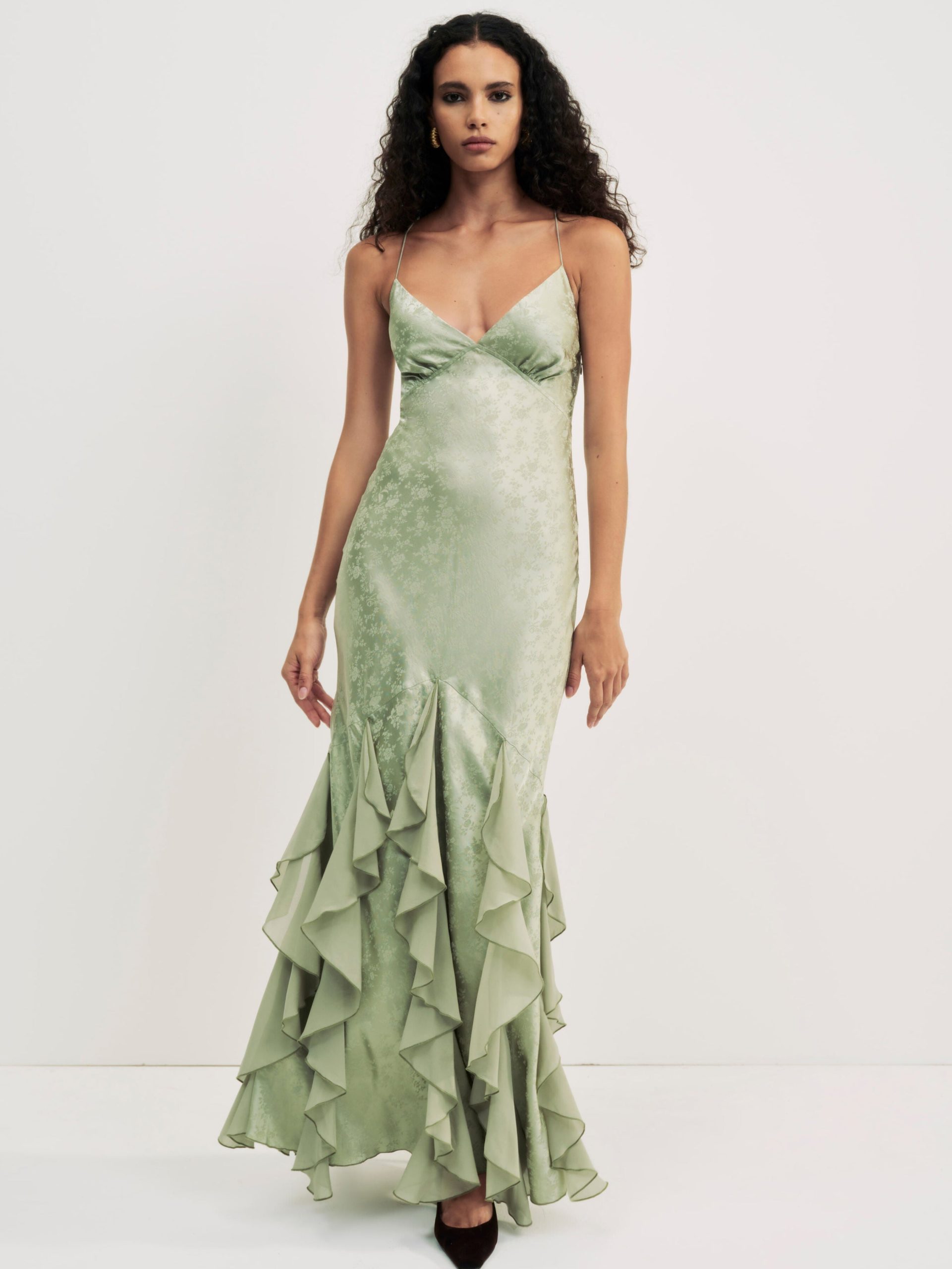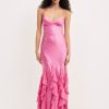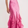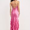 Inspired by timeless ‘90s silhouettes, the Silk ruffled maxi dress is crafted in 100% silk and spotlights a figure-flattering silhouette. This pink gown features a lace-up open back and a ruffled skirt—an elegant evening gown that makes for perfect bridesmaids dress.