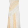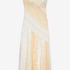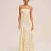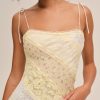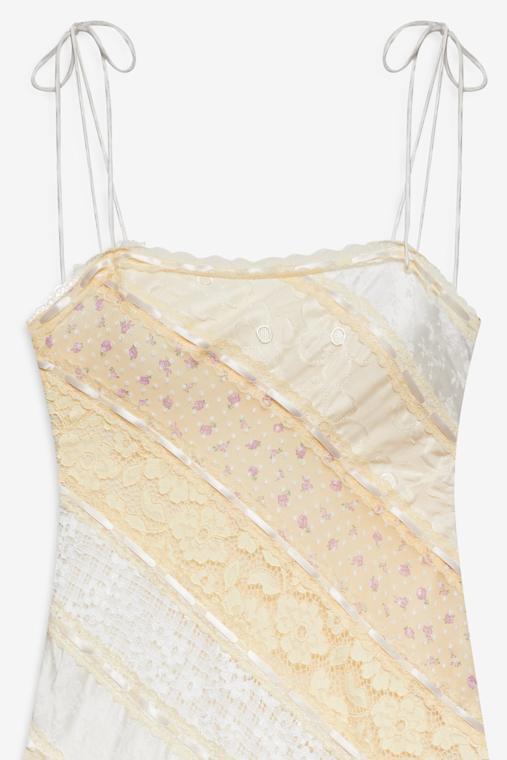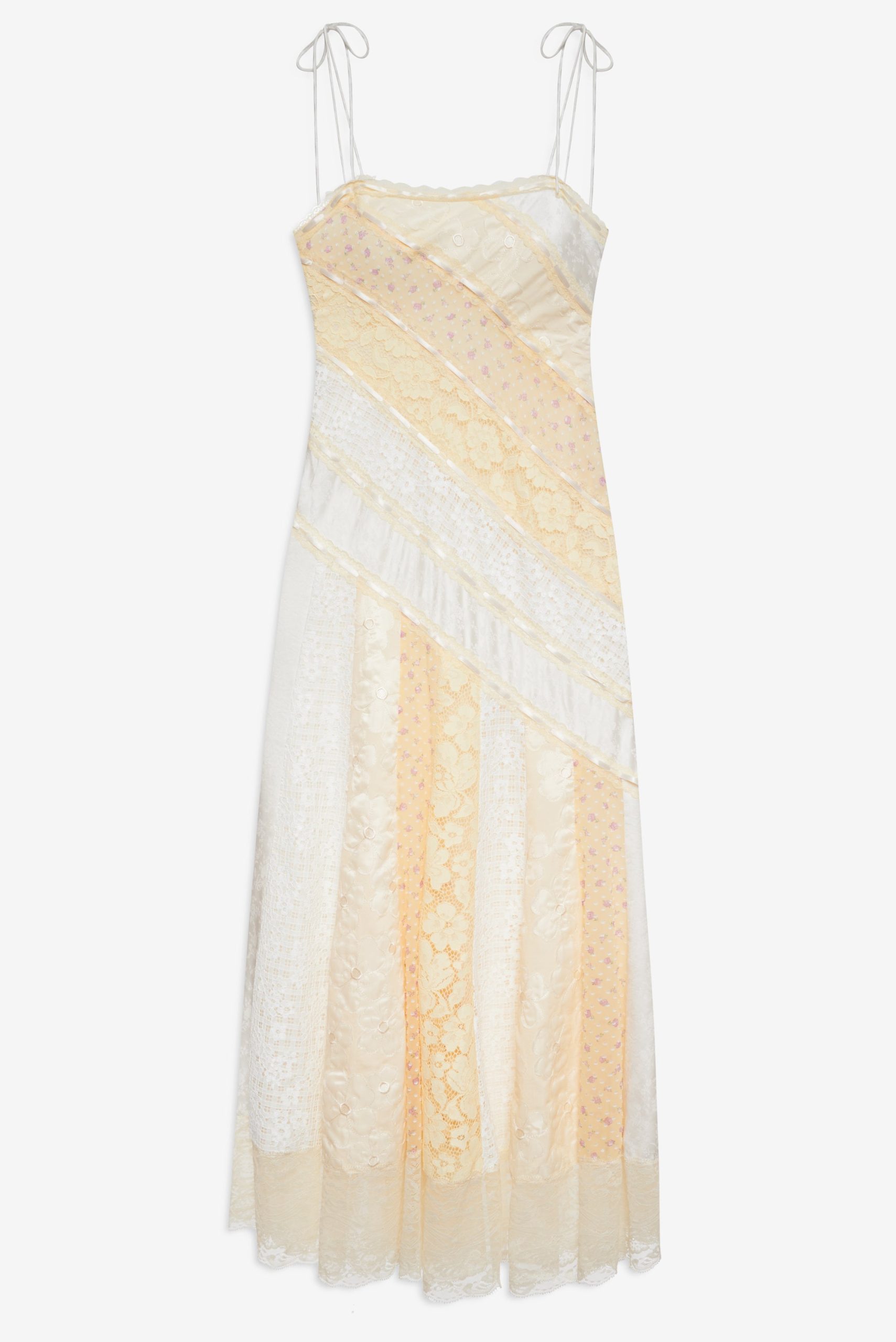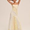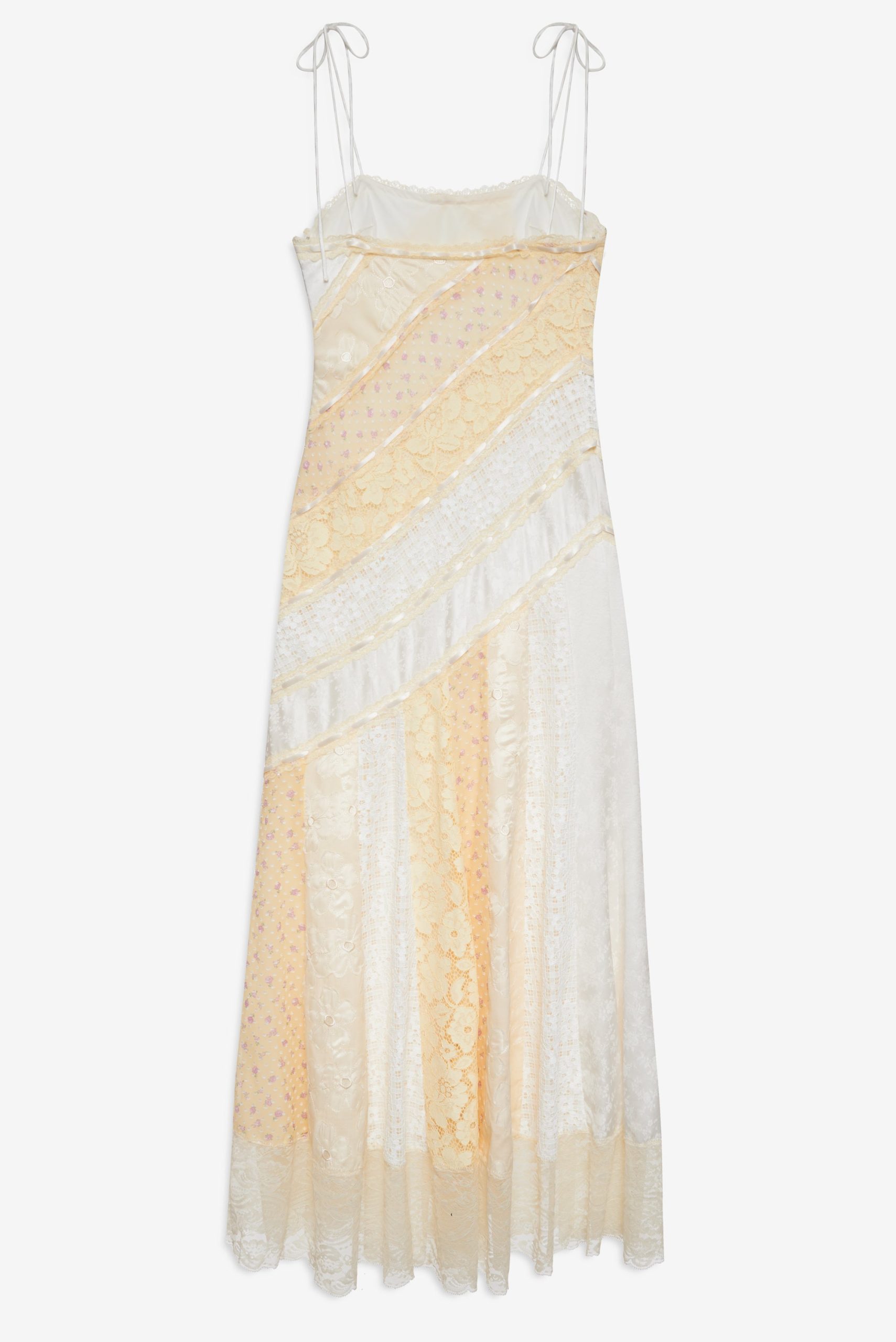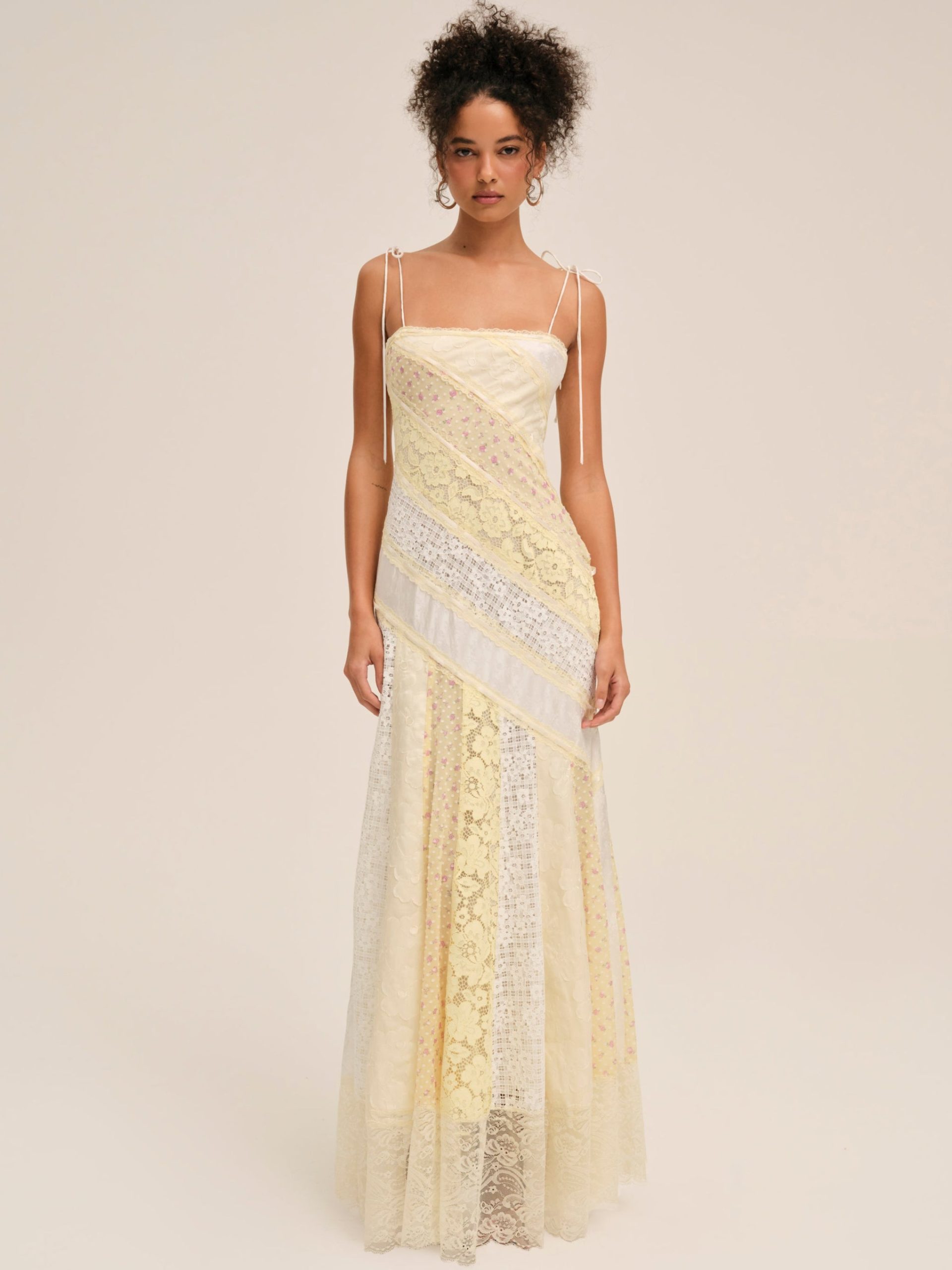 FOR LOVE & LEMONS KEEPSAKES: Inspired by heirloom vintage gowns, the Abigail yellow lace dress possesses an exquisite old-time charm. This patchwork dress is cut on the bias for a flattering silhouette, crafted with an intricate paneled mixed lace and floral fabrication, and adorned with delicate slotted lace and ribbon trims.