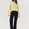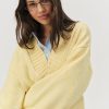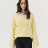Embrace cozy days ahead with the Amelia oversized sweater—a yellow sweater crafted in a chunky knit with a low cut V-neck, dropped shoulder, and tall ribbed trims at the neckline, sleeve ends, and hem.