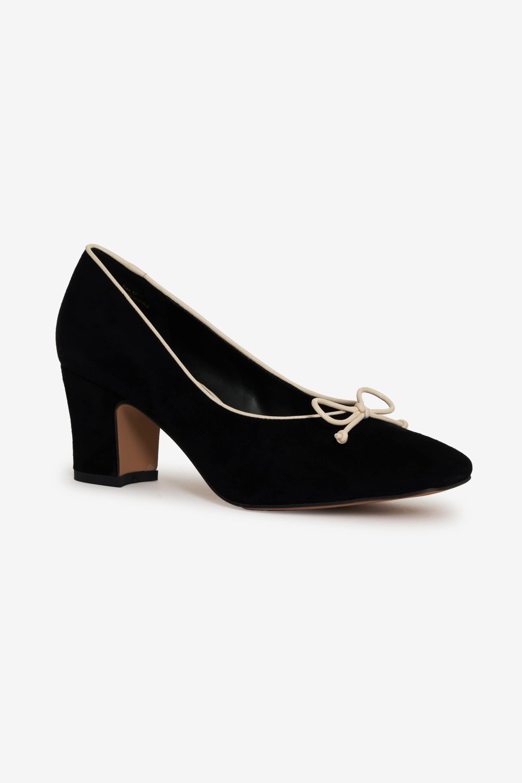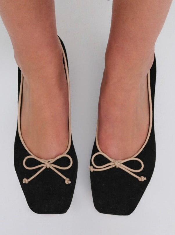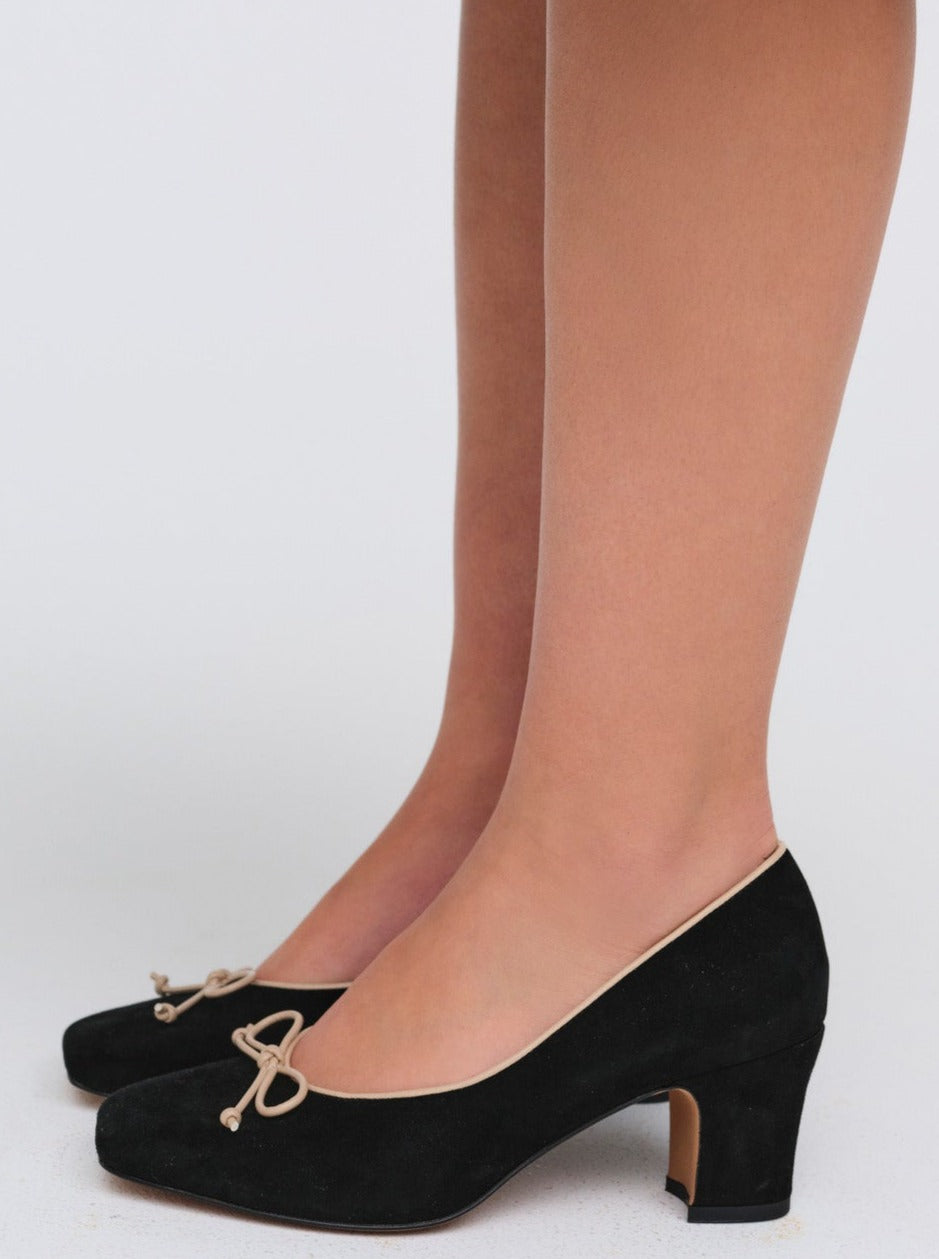 Crafted in leather suede, the Angelina black heel is an ultra-chic take on the classic ballet pump. Its block heel and tan bow make these ballerina heels perfect for the romantic minimalist.
