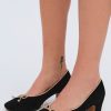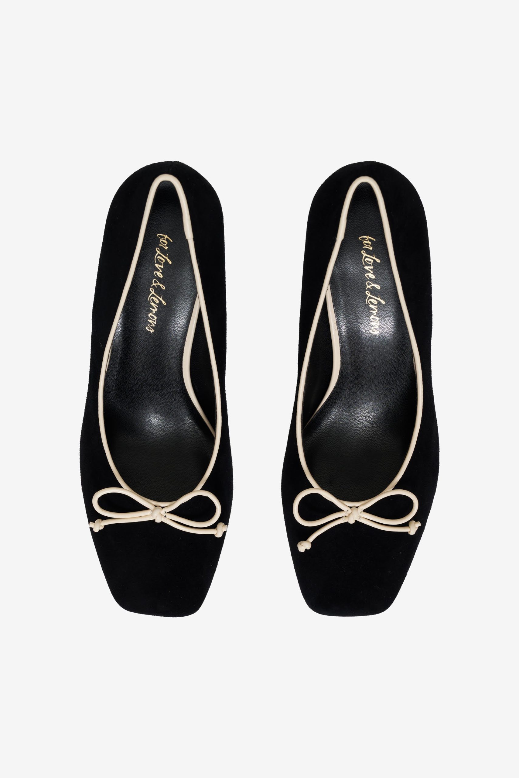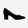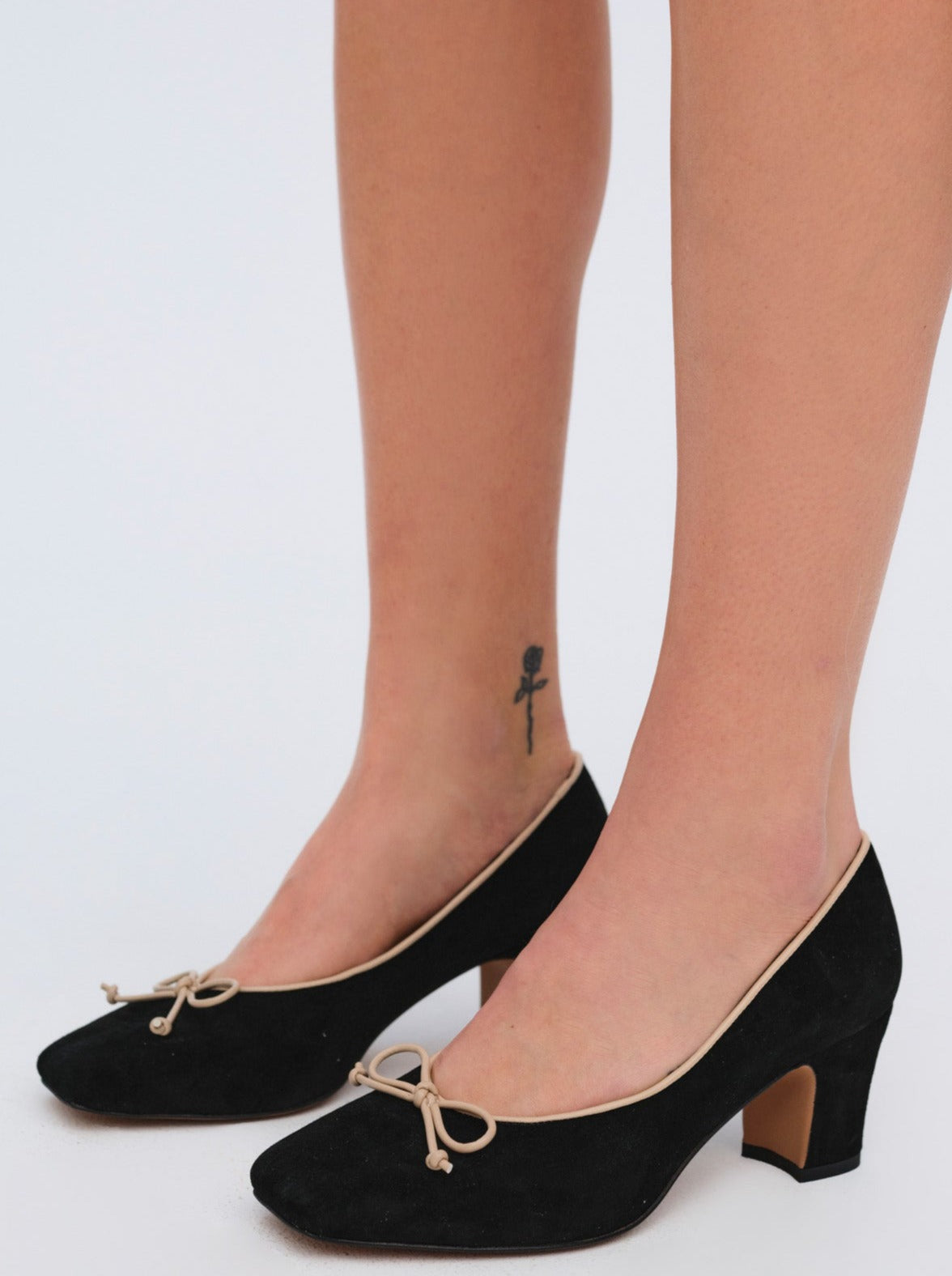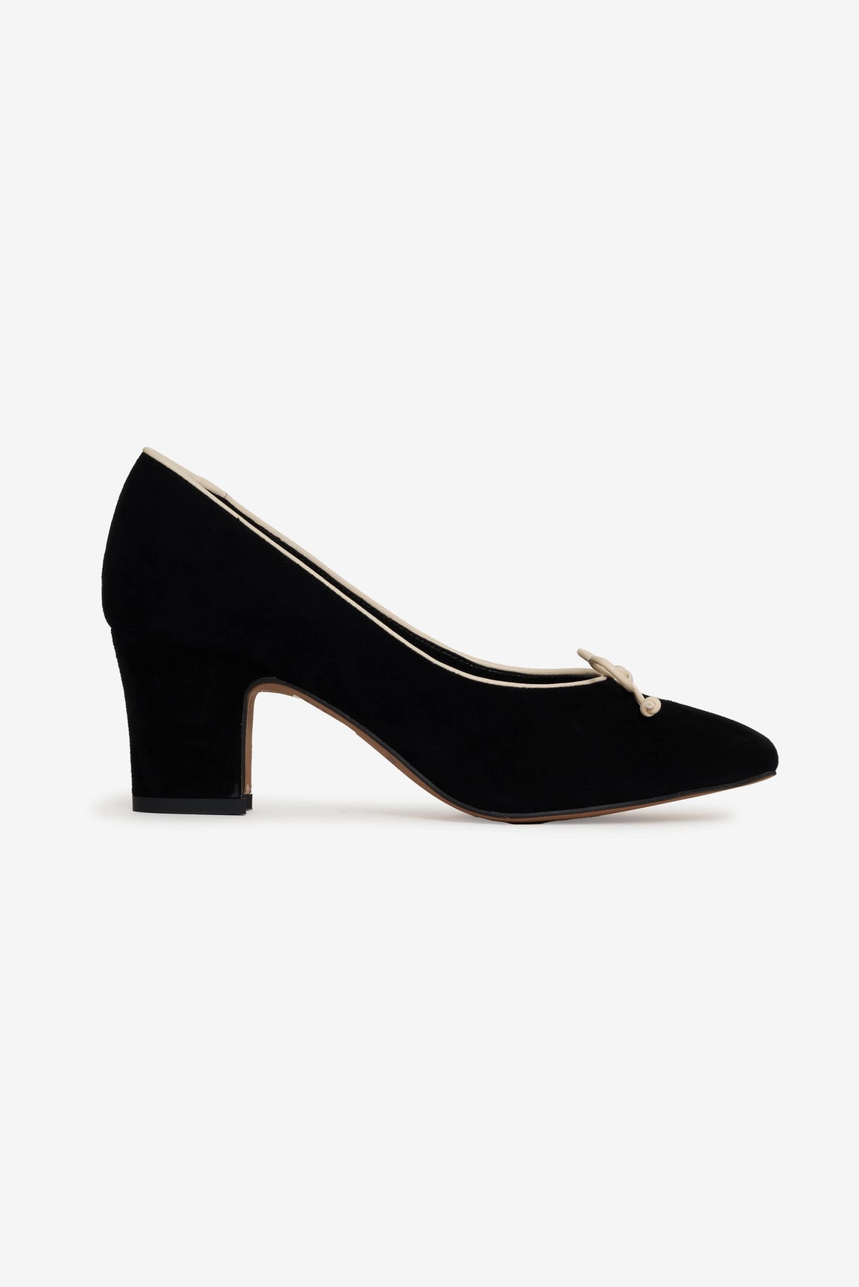 Crafted in leather suede, the Angelina black heel is an ultra-chic take on the classic ballet pump. Its block heel and tan bow make these ballerina heels perfect for the romantic minimalist.