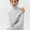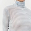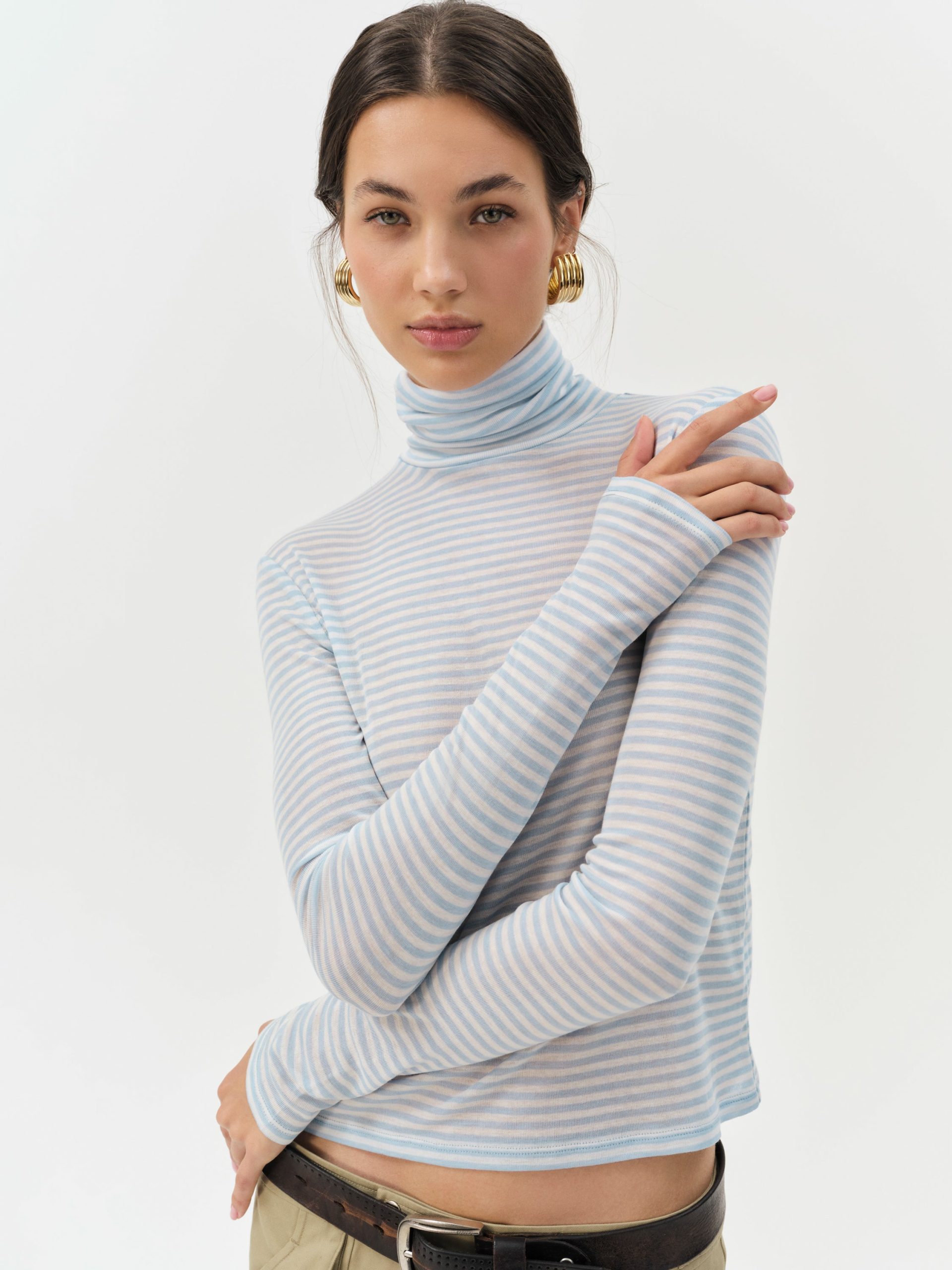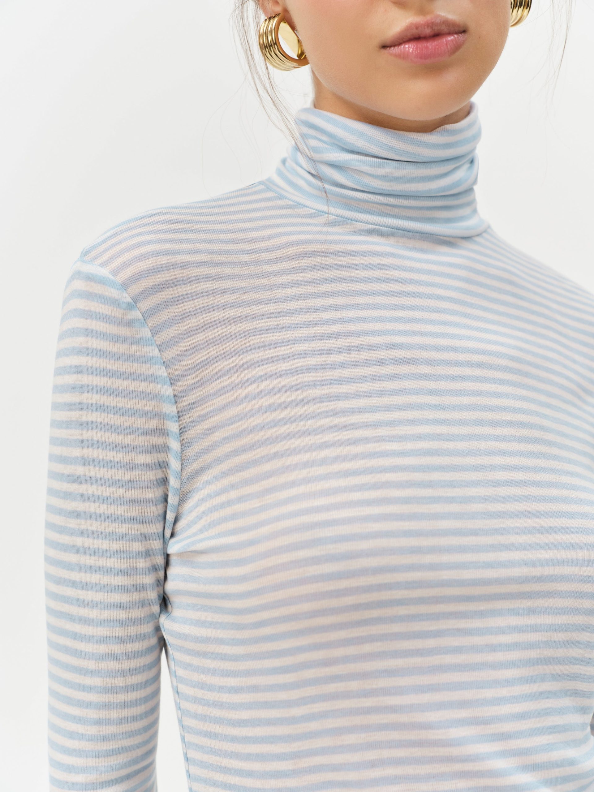 Update your closet staples this season with the Athena turtle neck top, crafted in a cozy jersey. This blue and white striped long sleeve is cut to a body skimming fit—perfect for layering or lounging.