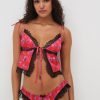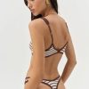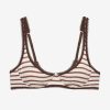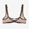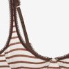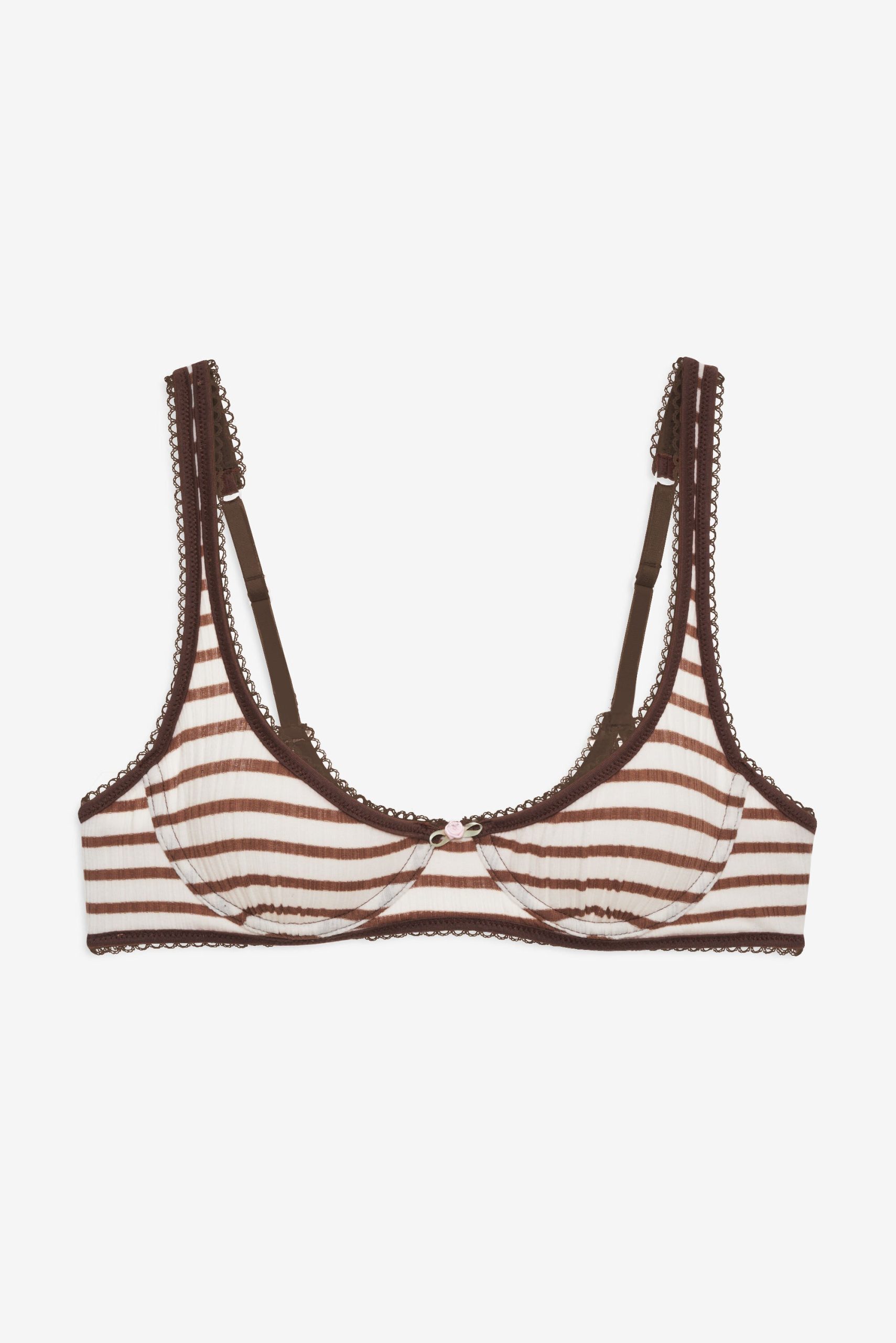 For a look that feels like home, the Bella unlined bra was designed for lounging, layering, and everything in between. Crafted in a brown and cream stripe, this underwire bra spotlights a contoured scooped cup shape and is adorned with scalloped picot trims and a rosette at front. Pair with the Bella Thong Panty for the complete lingerie set.