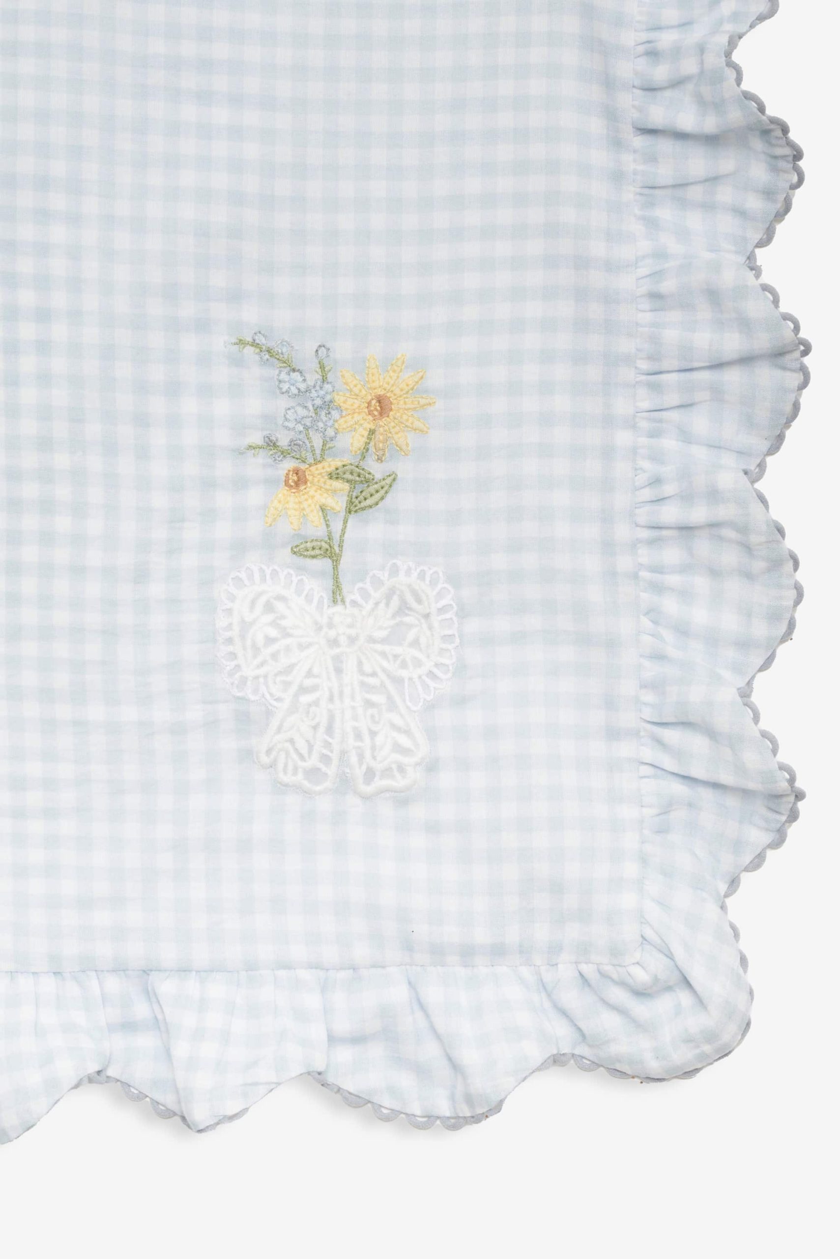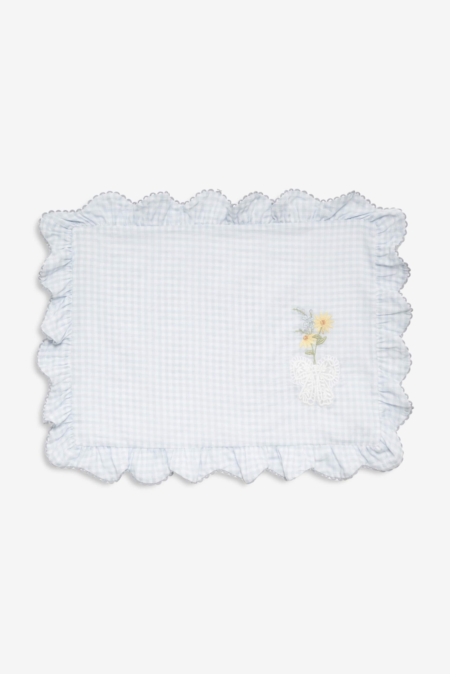Inspired by antique linens, the Bluebell Gingham Placemats are crafted in 100% cotton. Adorned with a ruffled picot trim, daisy embroidery, and decorative bow—these blue placemats are essential for summer hosting.