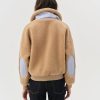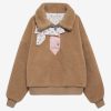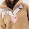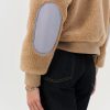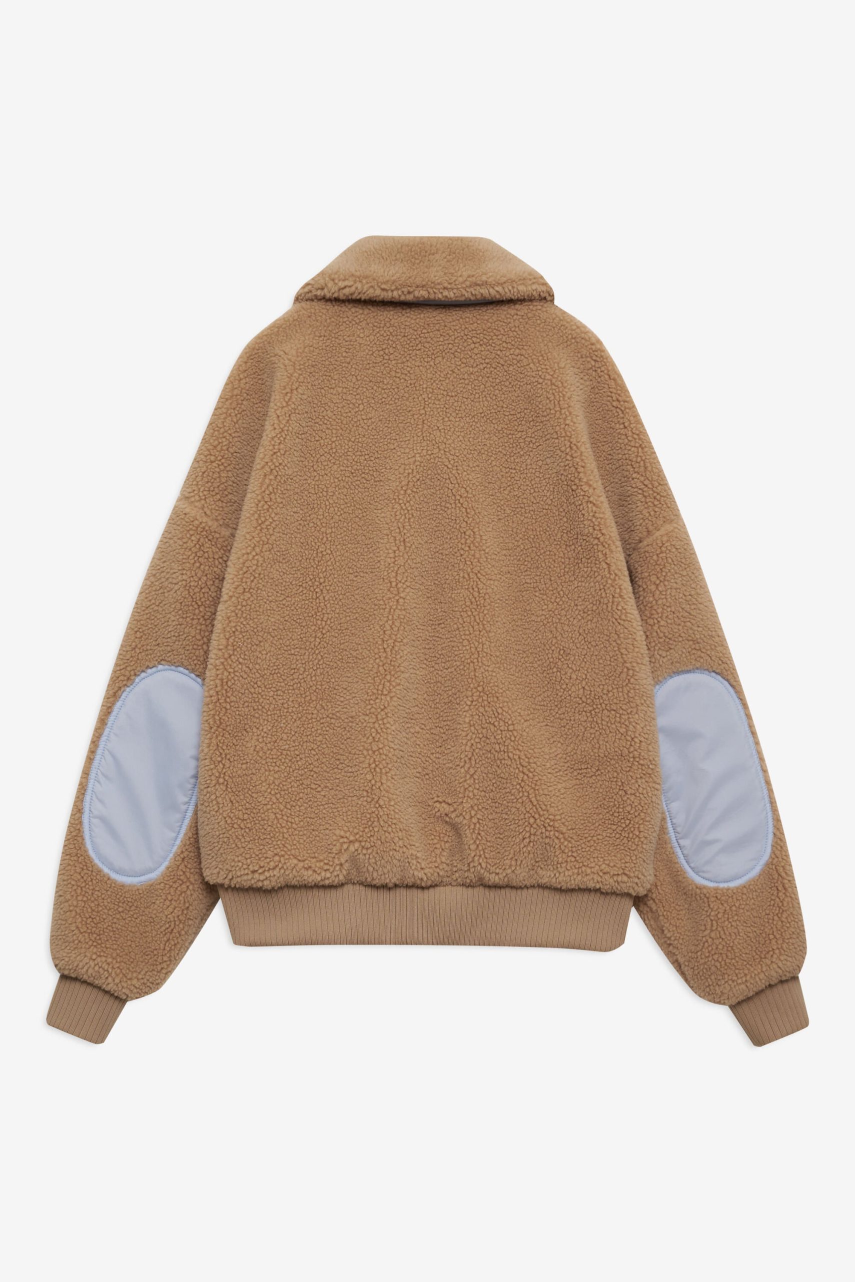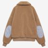 Embrace the cozy days ahead with the Caitlyn half zip pullover sweater. Crafted in a brown sherpa fabric and adorned with contrast elbow patches and double collar detail, this fleece jacket spotlights a half zipper neckline, and ribbed trim cuffs and hem.