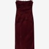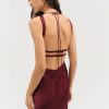 Made for late summer soireés, the Carla Jacquard burgundy midi dress is perfect for transitioning seasons. This open-back midi dress is bias-cut for a flattering fit and features an asymmetrical hem and thigh-high slit.