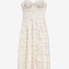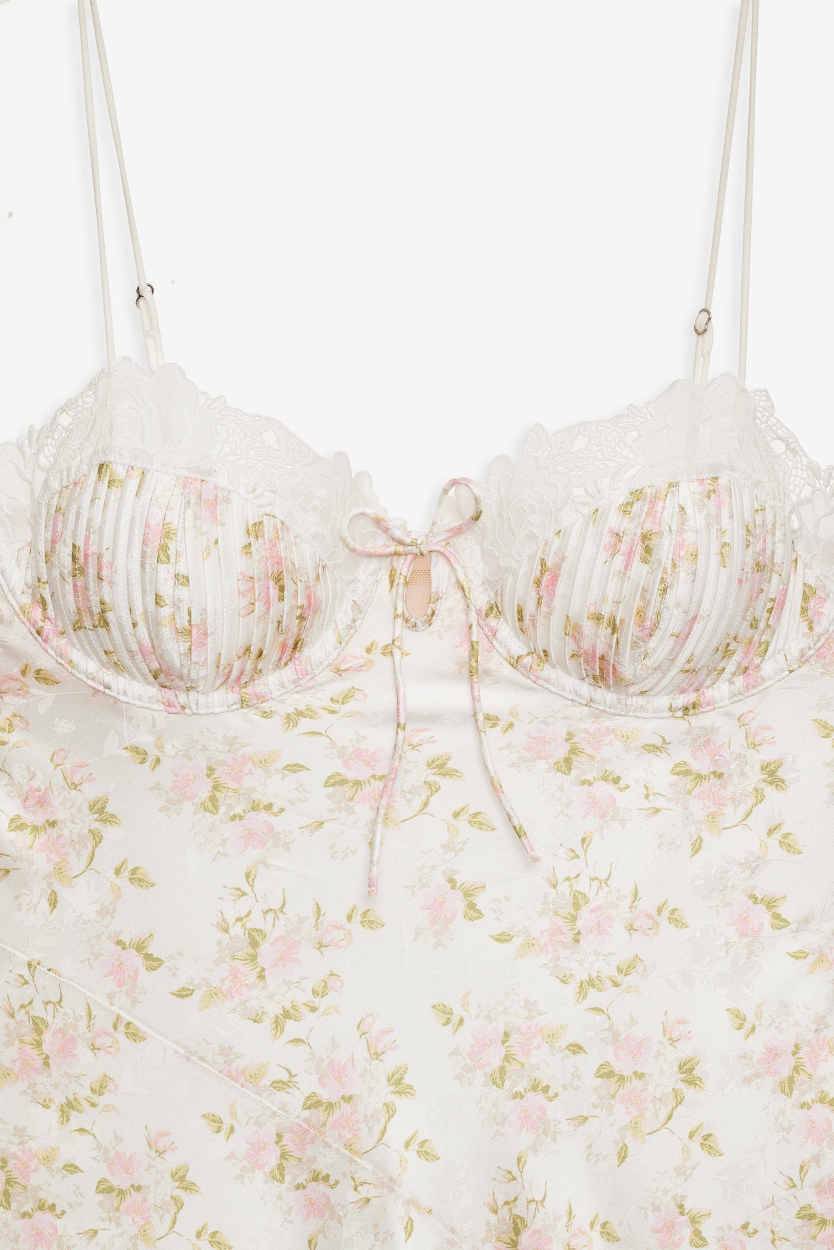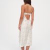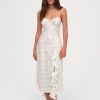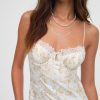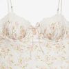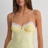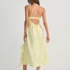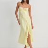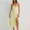 Celebrate fresh starts and spring blooms in the Chania yellow midi dress—an elegant slip dress printed with allover ditsy florals. This floral sundress is cut on the bias and features lace-trimmed cups, pin-tuck detailing, a slit at the left thigh, plus flounce ruffles at the skirt slit.