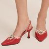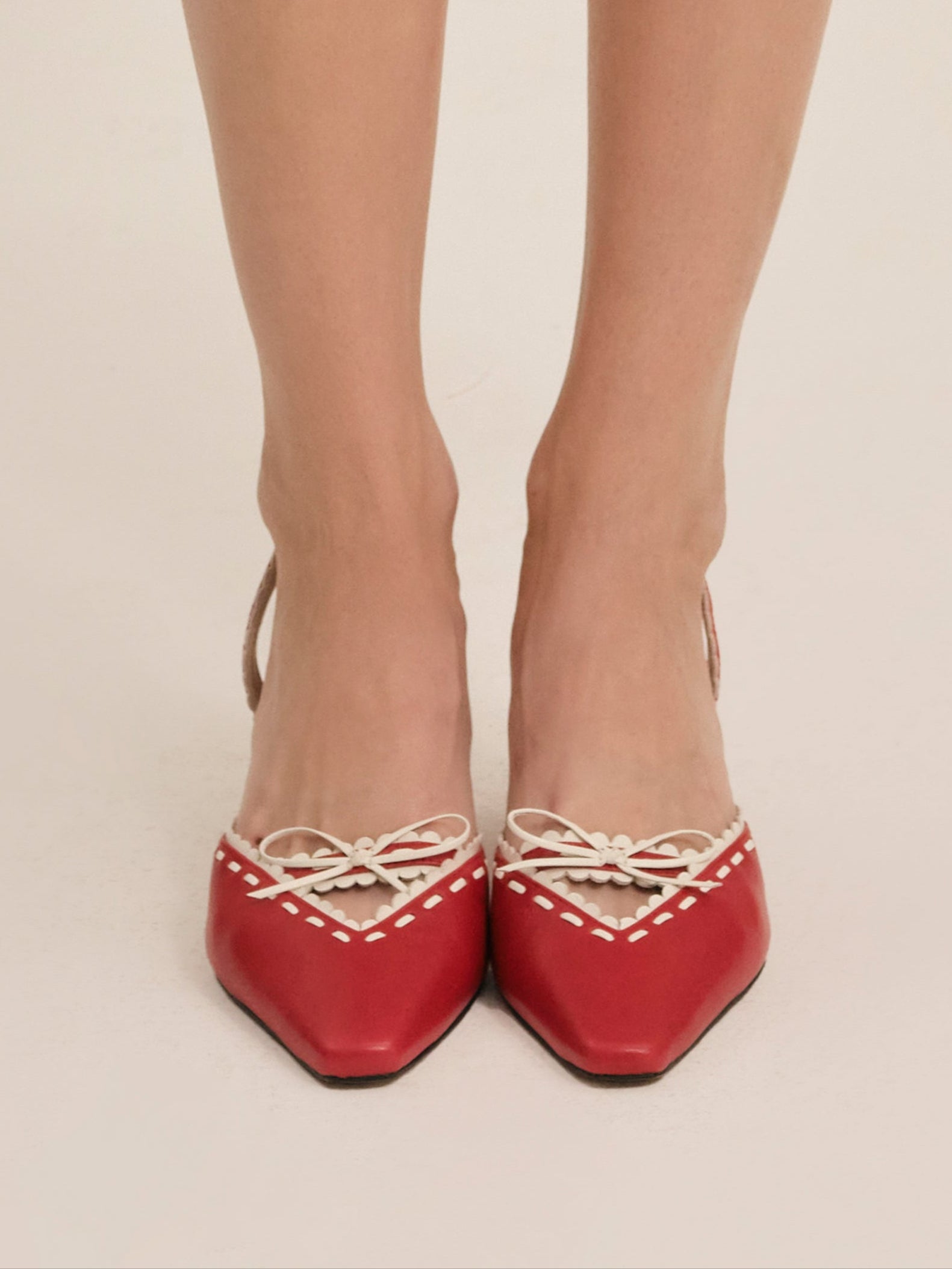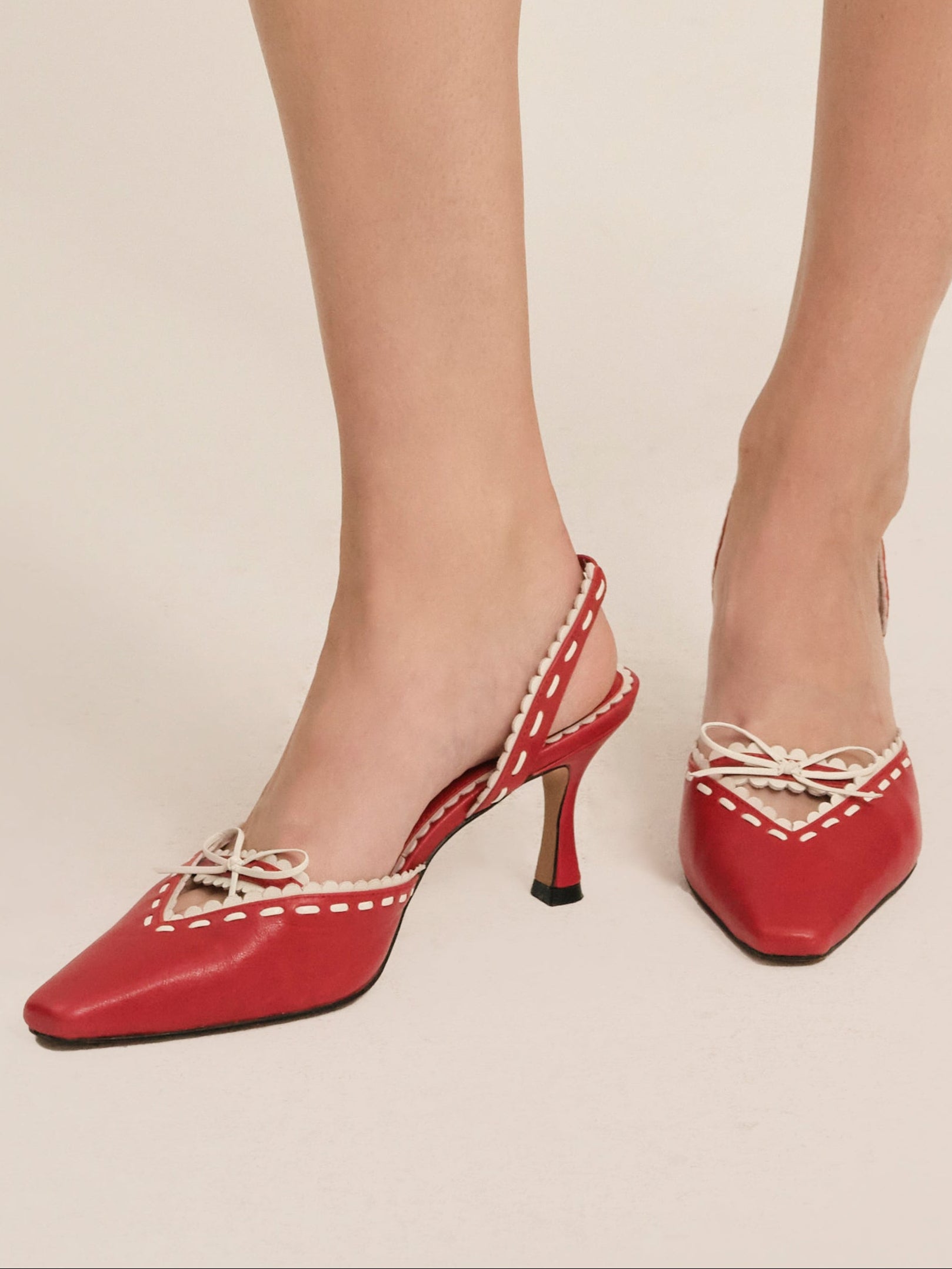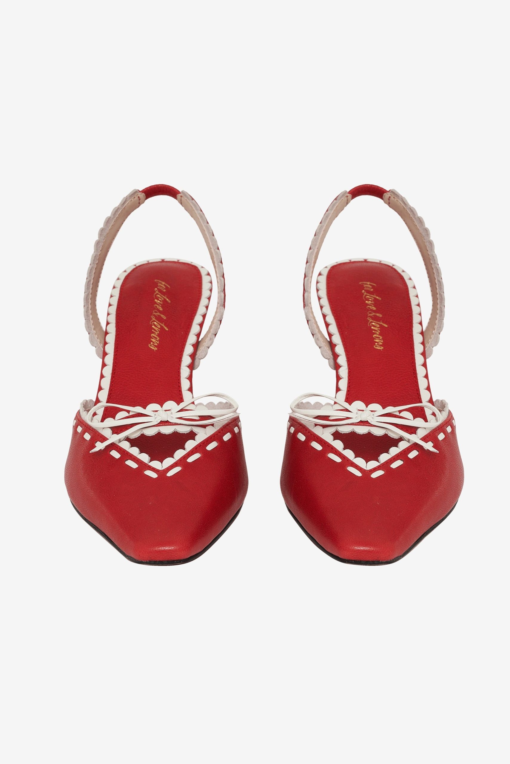 Make every step sweeter with the Charlie red heels–a pointed toe kitten heel adorned with a white scallop trim and center-front bow.Upper leather materialLined in PUHeel height: 70mm