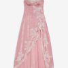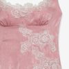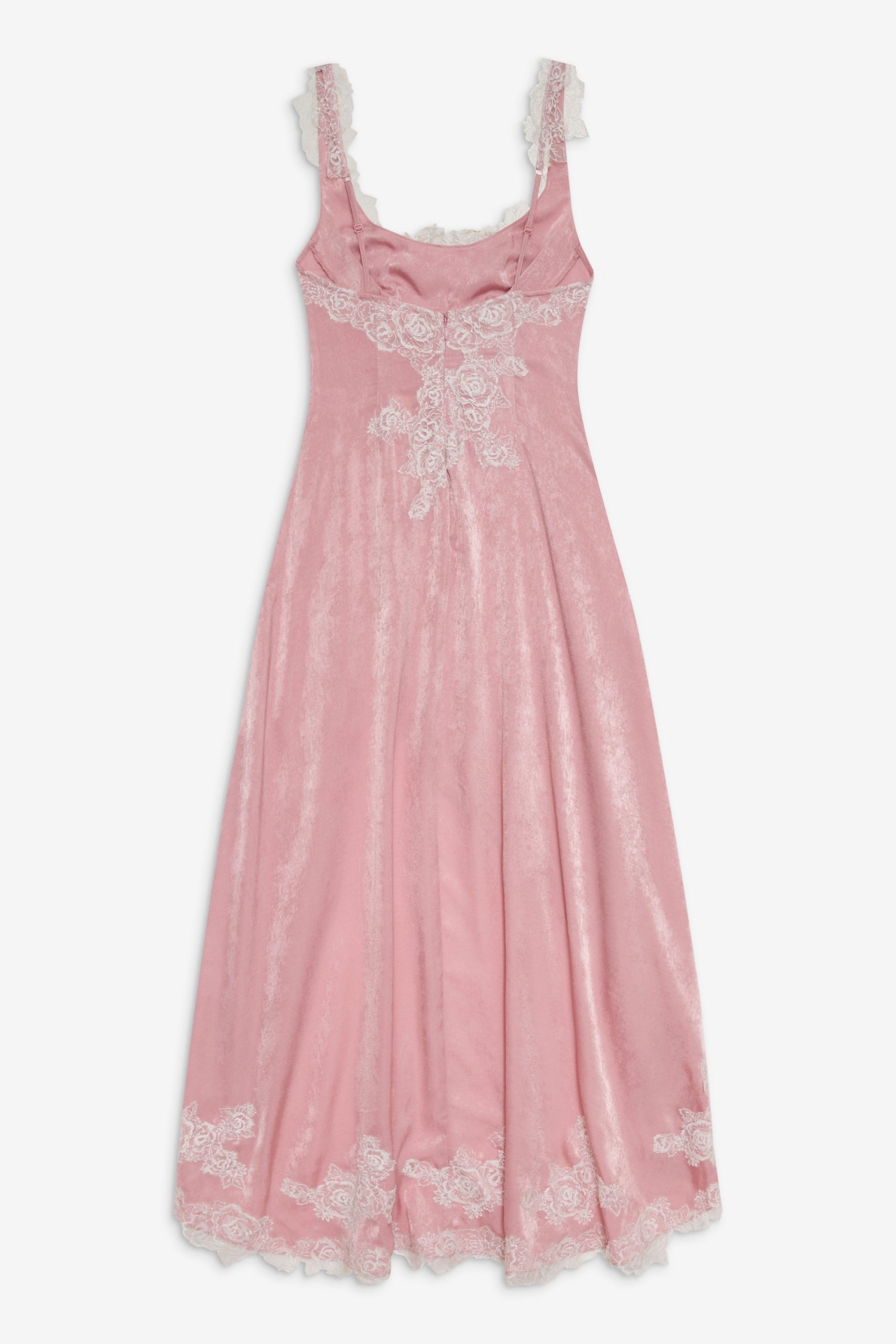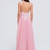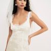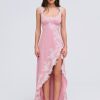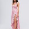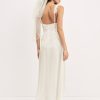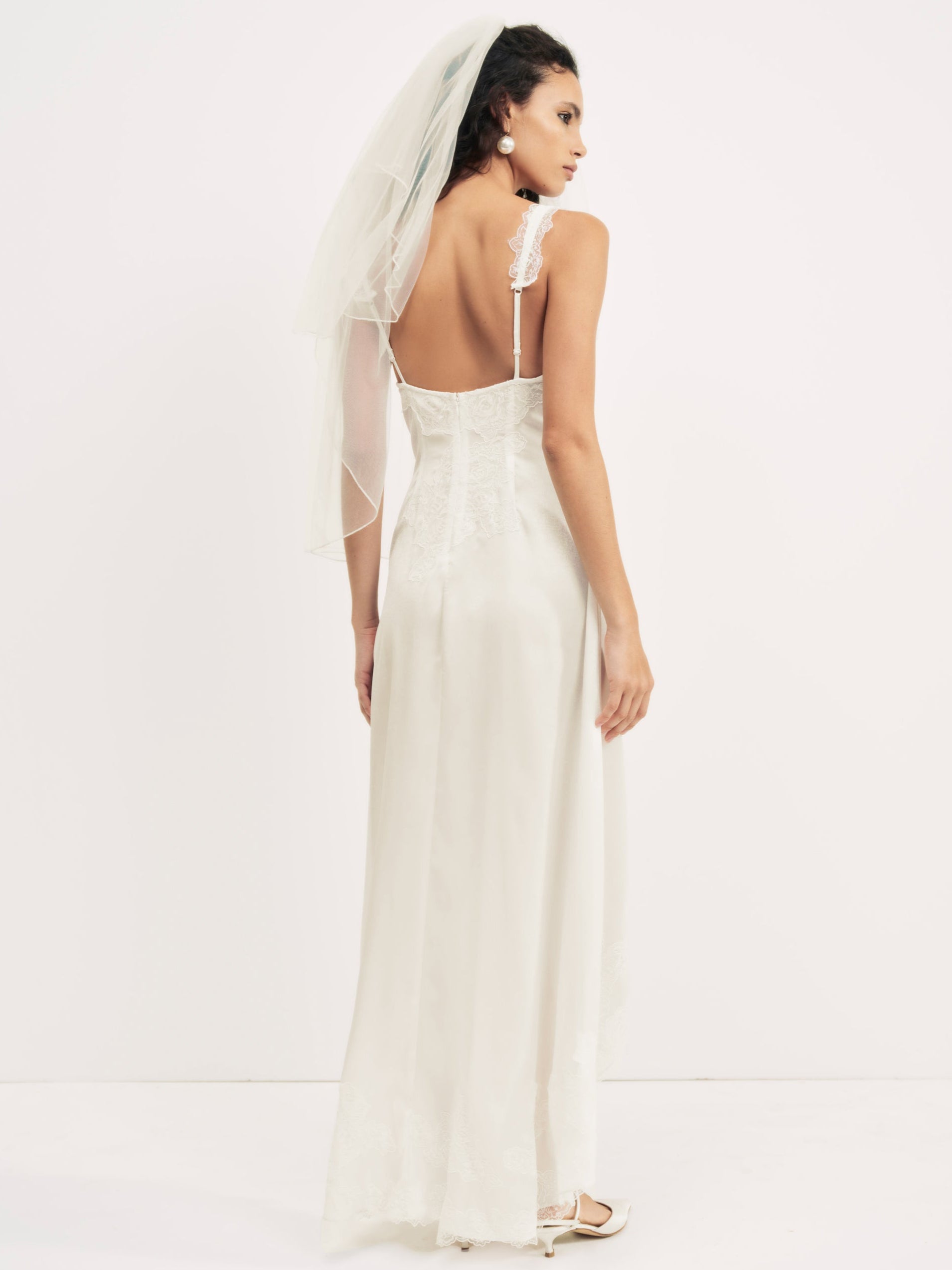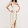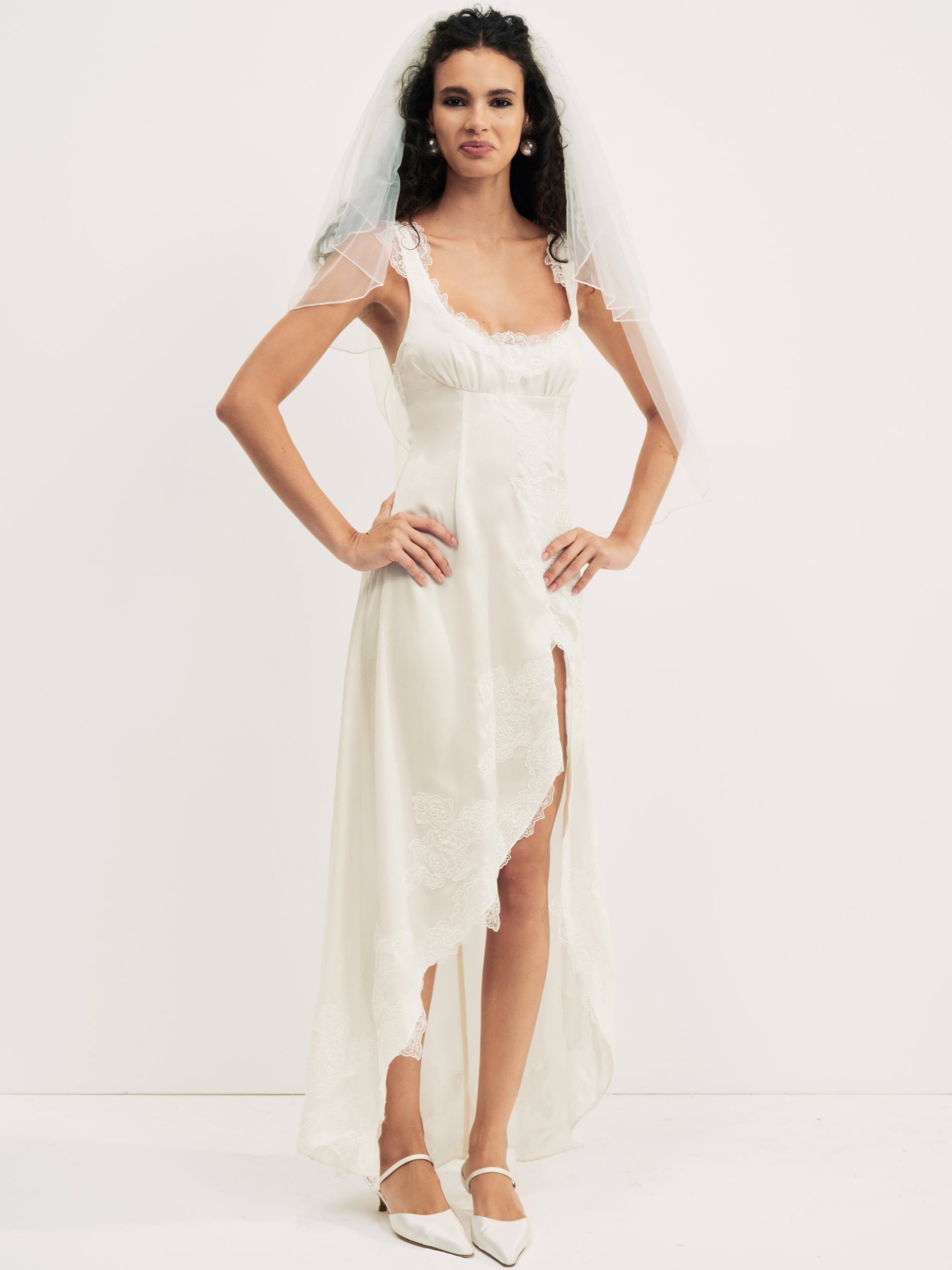 Bring your bridal dreams to life in the ultra-romantic Clemence cream maxi dress. Crafted in a solid luster satin, this bridal dress is adorned with lace appliqués and trims throughout. Breathtakingly beautiful, this evening gown spotlights an empire waist and a hi-low cut skirt with a thigh-high slit.