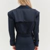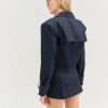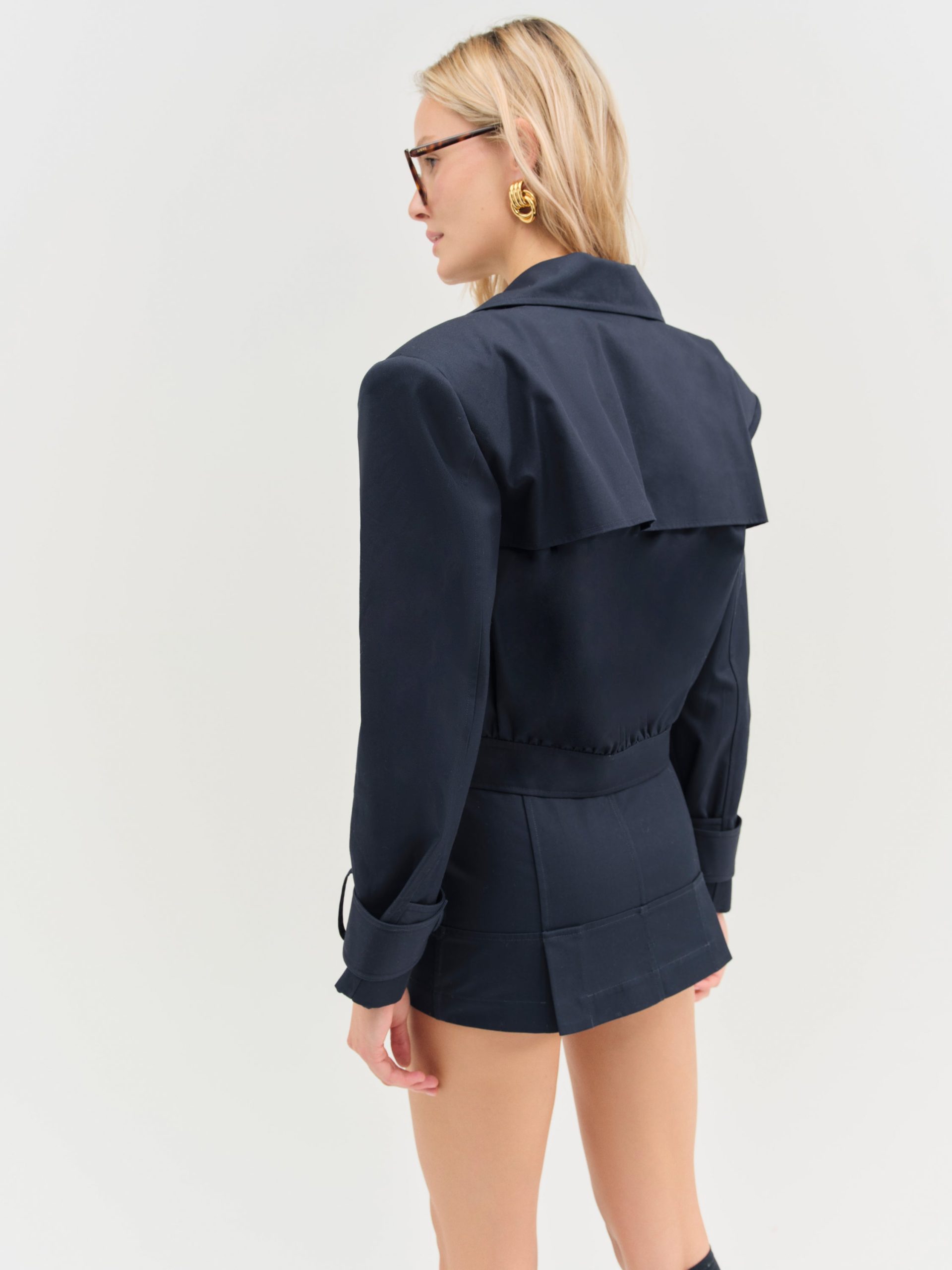 The Cotton Twill navy oversized cropped jacket is a playful nod to a timeless aesthetic. This cropped trench jacket spotlights an oversized, boxy fit with a belted cuff detail, double breasted front closure, and functional welt pockets. Pair it with the Cotton Twill Micro Skort to complete the co-ord set.