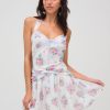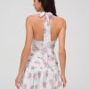 An ode to effortless romance and elegant femininity–the Doily Bouquet floral mini dress is crafted in a sweet floral printed chiffon. Decorated with ethereal ribbon slotted lace trim with a center-front bow, this drop-waist mini dress features a classic functional halter tying neck, a knotted hip overlay detail, and low open back.