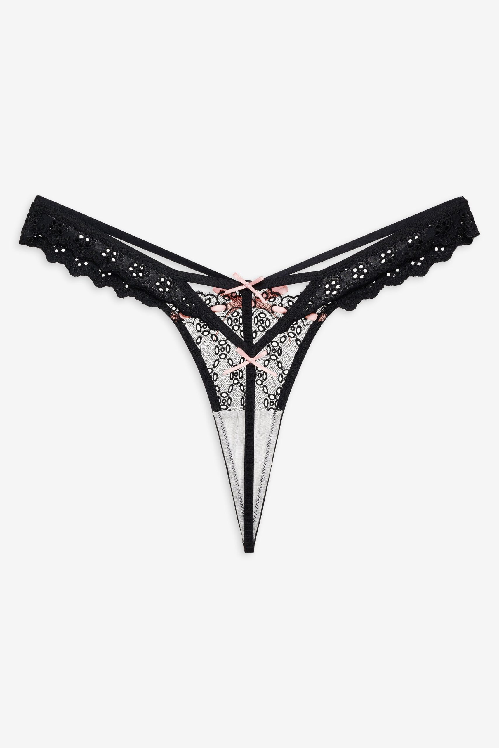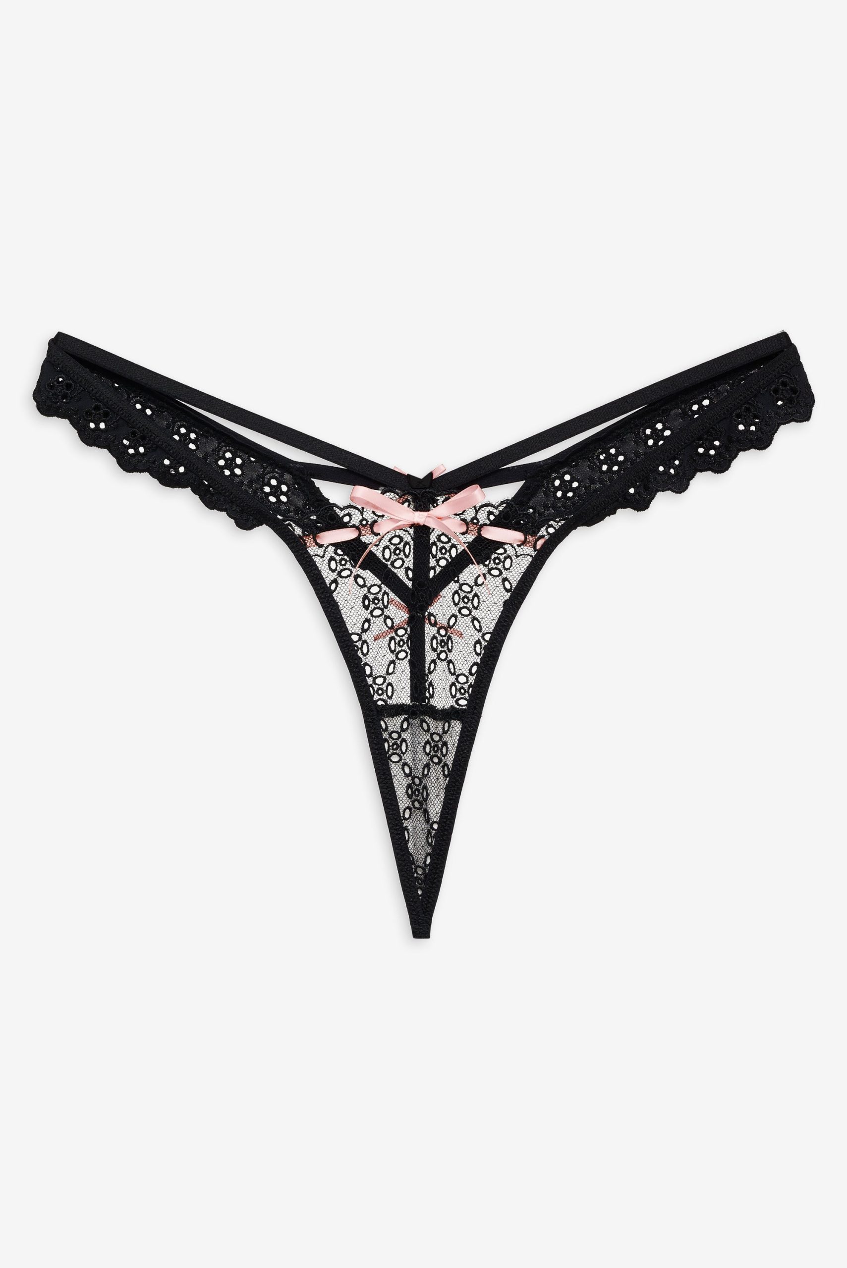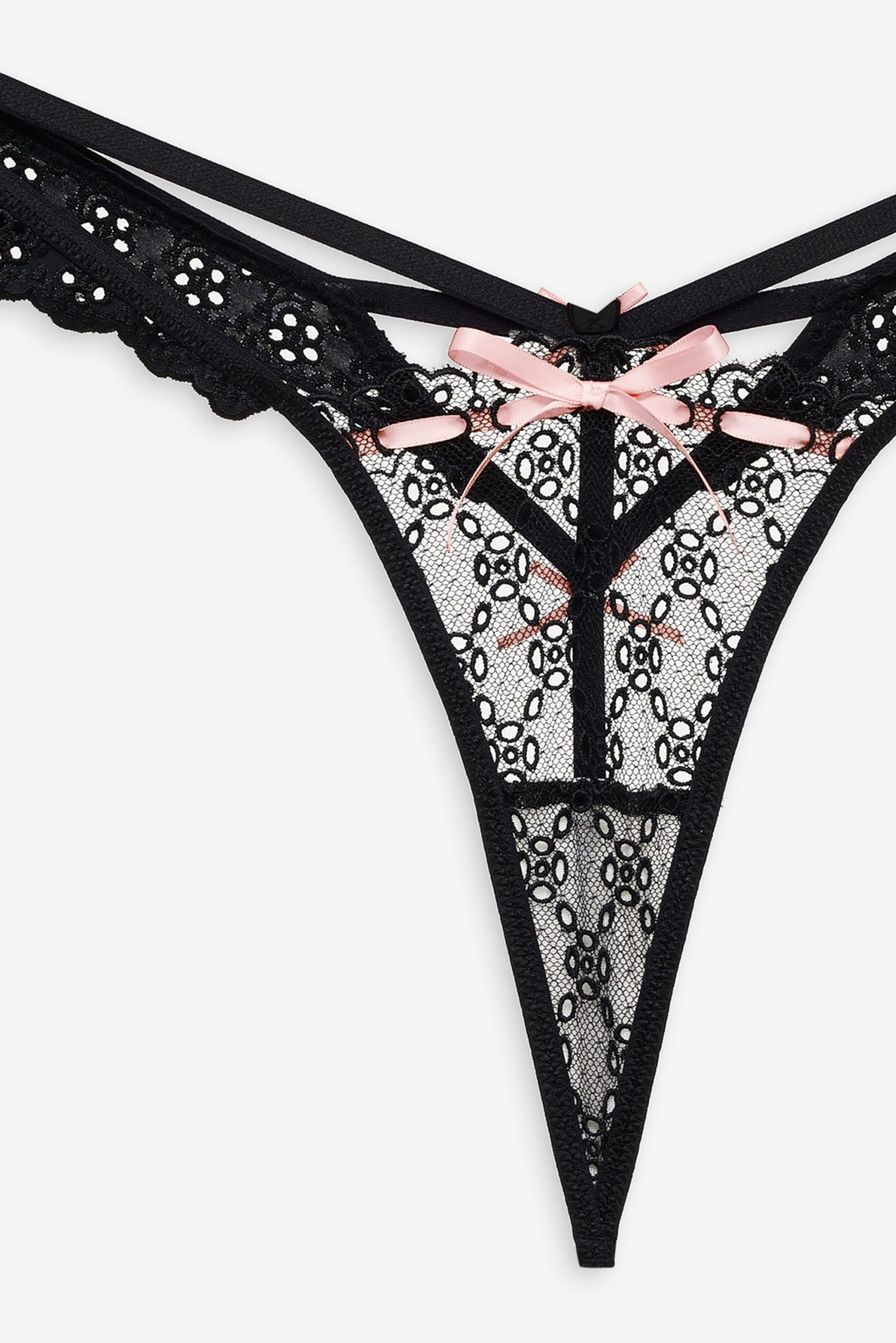 Designed for the sultry Muse, the Elena Eyelet black thong is both elegant and seductive. Crafted in a feminine eyelet, this black g string spotlights a feminine ribbon trim, scalloped straps, and back cut-out details. It’s finished with decorative satin bows.