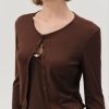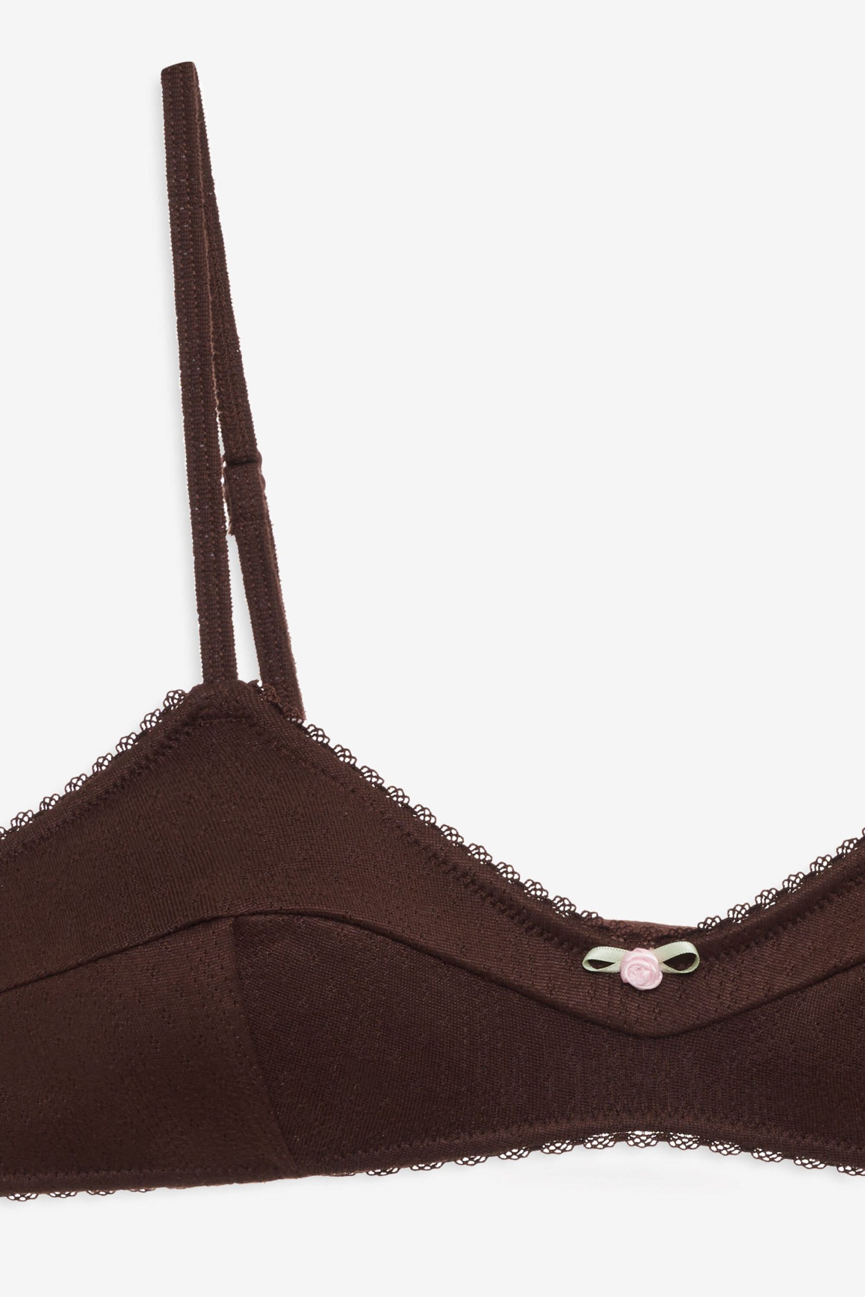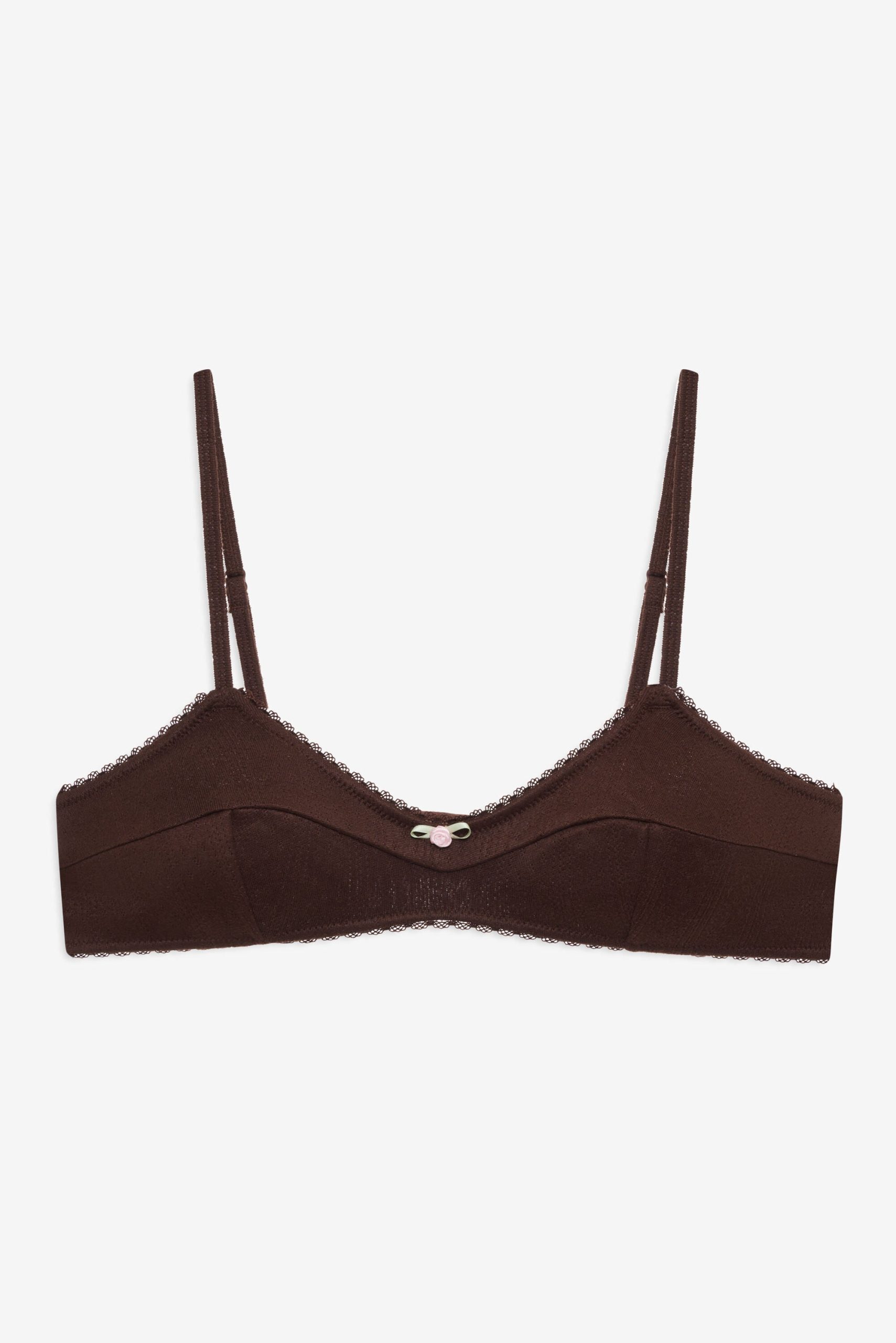 Designed for lounging, layering, and everything in between—the Elliana brown bralette is perfect for cozy days in. This triangle bralette spotlights contoured seams and is adorned with scalloped picot trims and a rosette at the center-front. Pair with the Elliana Thong Panty for the complete lingerie set.