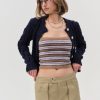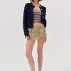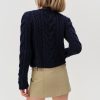 Complete your fall look with the Emily navy cable knit cardigan—a cropped cardigan with shell-like buttons, patch pockets, and classic ribbed trims at neckline, sleeve ends, and hem.