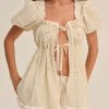 For open-air drives, and long, lazy afternoons by the water, the Erika Babydoll two piece set makes for an ultra-chic summer ensemble. This cream co ord set features a puff sleeve open-front tying top and elasticated bloomer shorts for an effortless look.