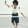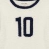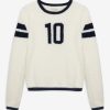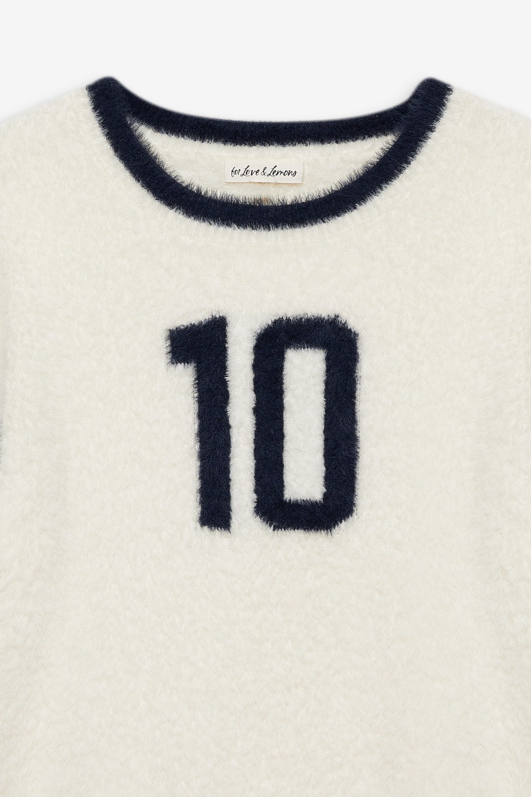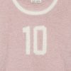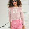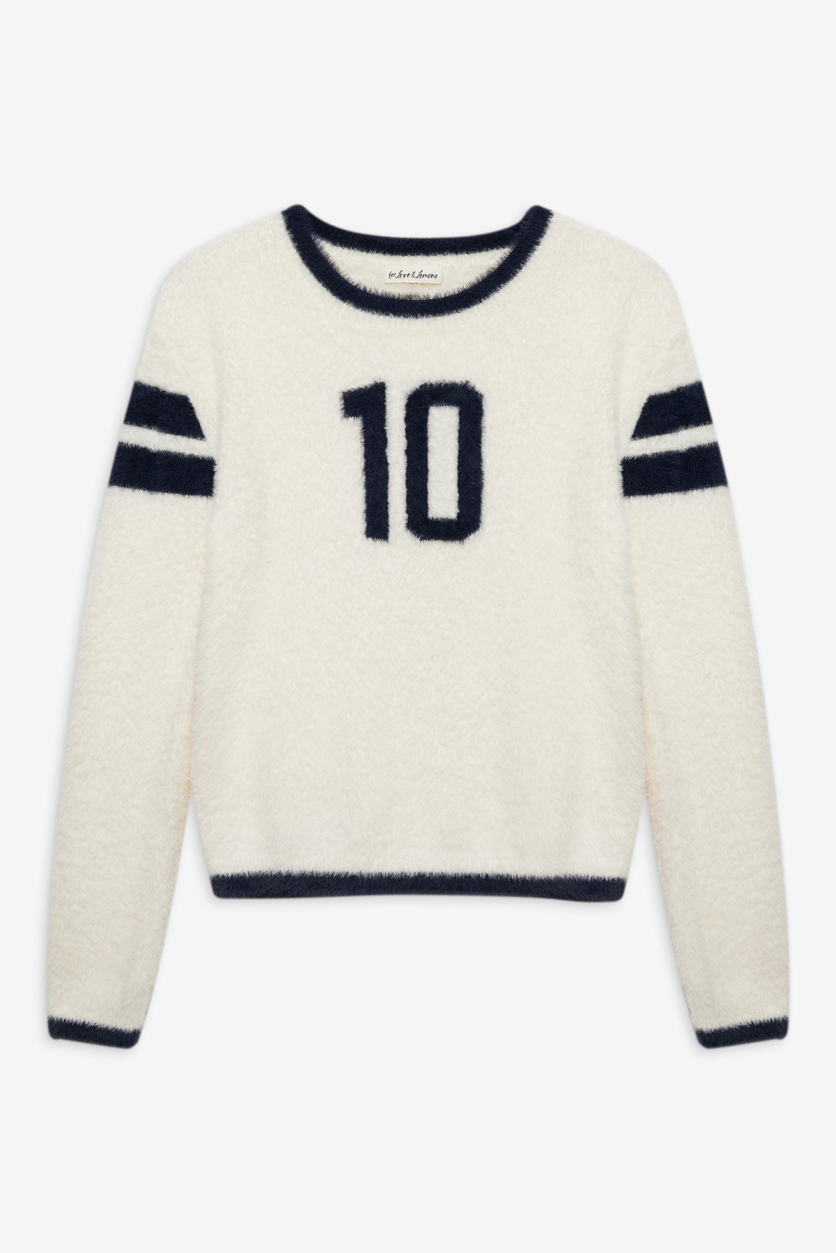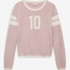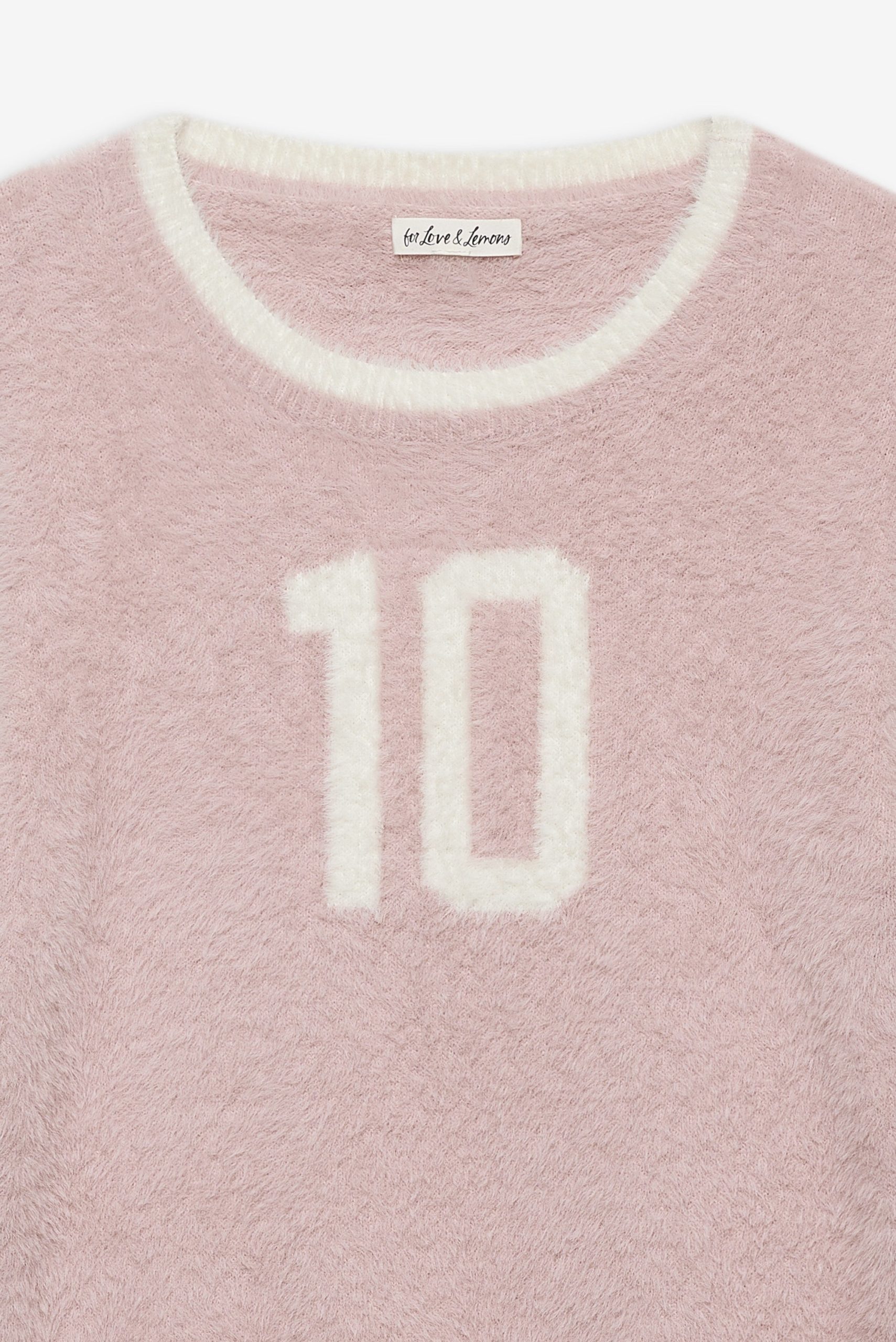 Serve up country club chic with our Founded in ’10 fuzzy sweater. Inspired by vintage varsity styles, this fitted pink sweater is crafted in a fuzzy faux mohair knit and features a contrast colored number 10 and stripes.