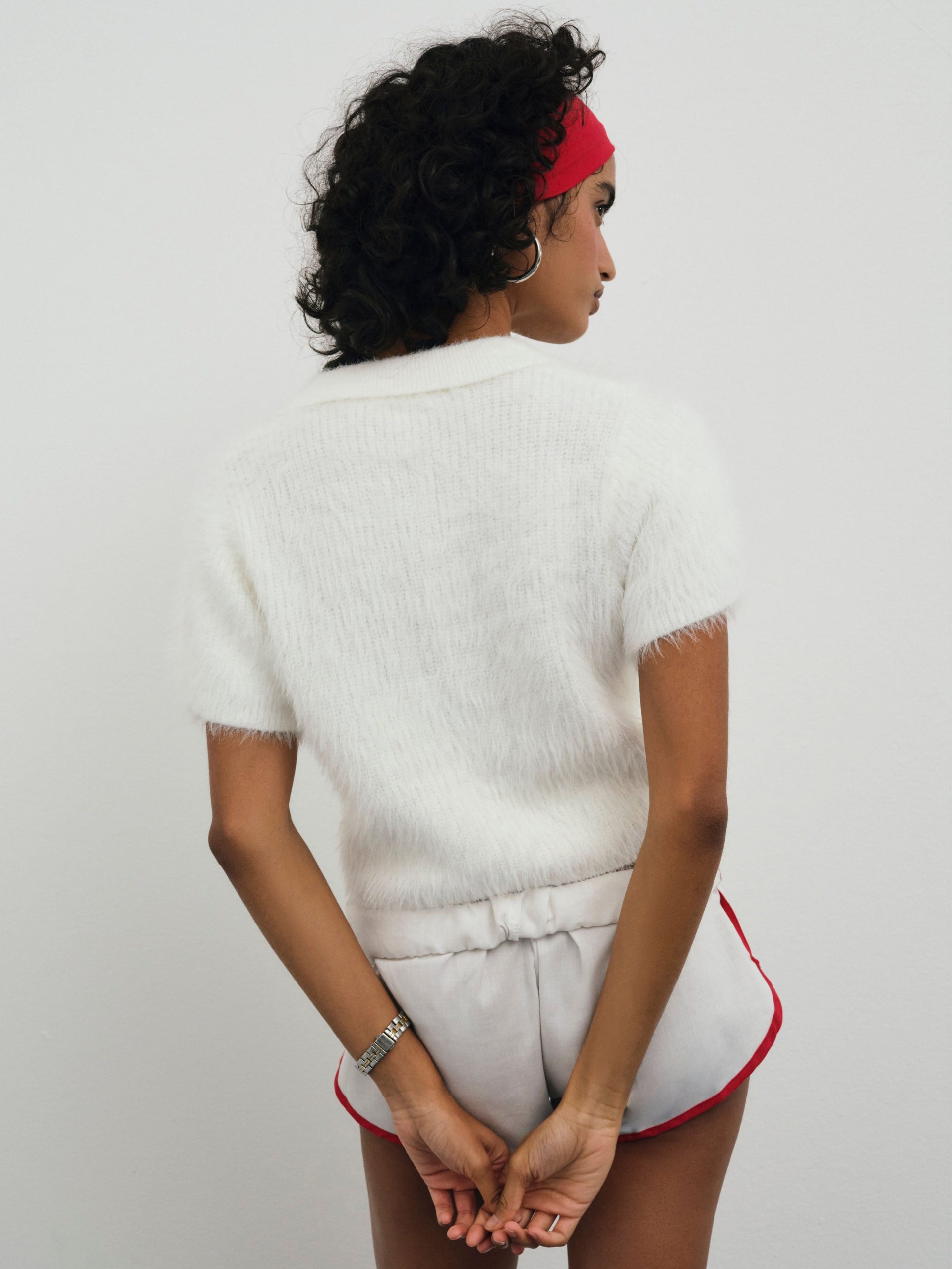 The Fuzzy knit top is designed for a sophisticated preppy look that transitions from court to café, and everywhere in between. Crafted in a fuzzy faux mohair knit, this ultra-chic boxy fit henley sweater spotlights a collared open neckline and falls to a cropped length.