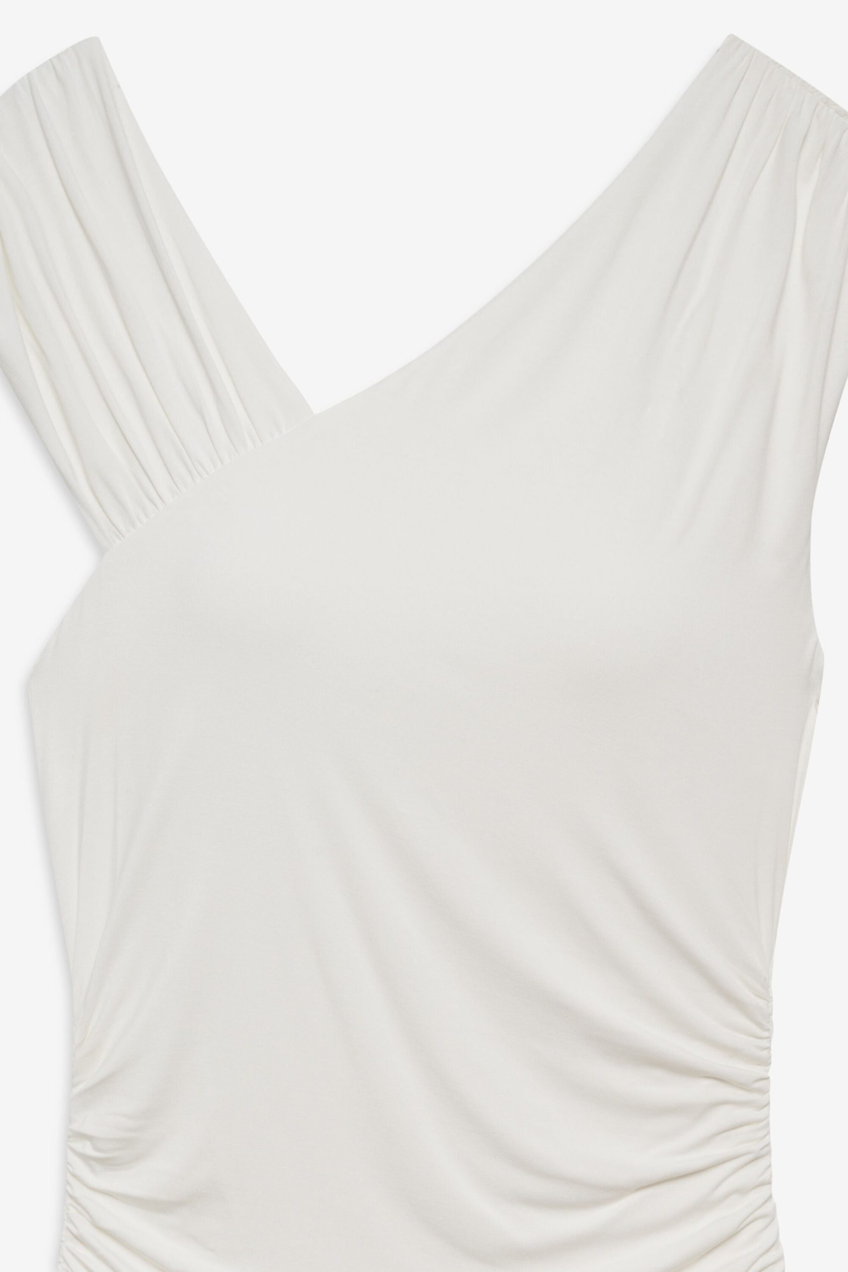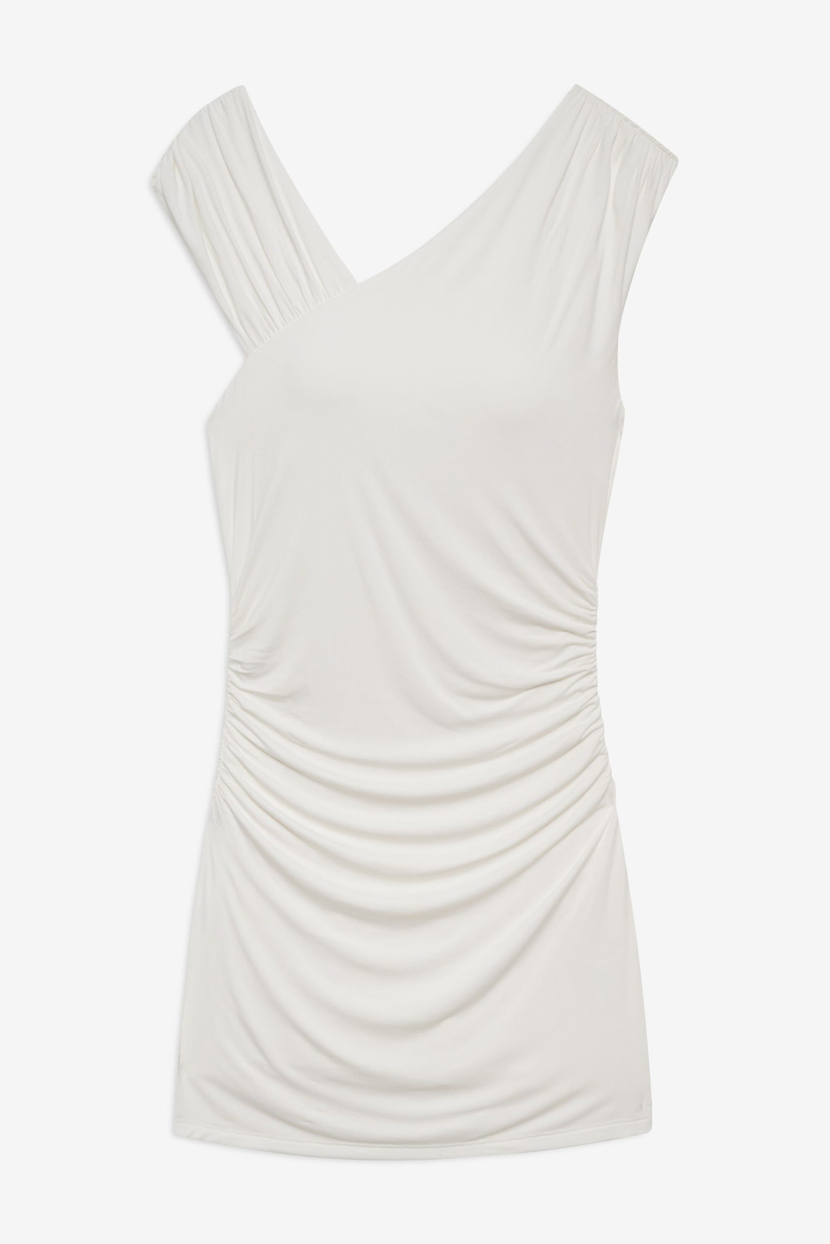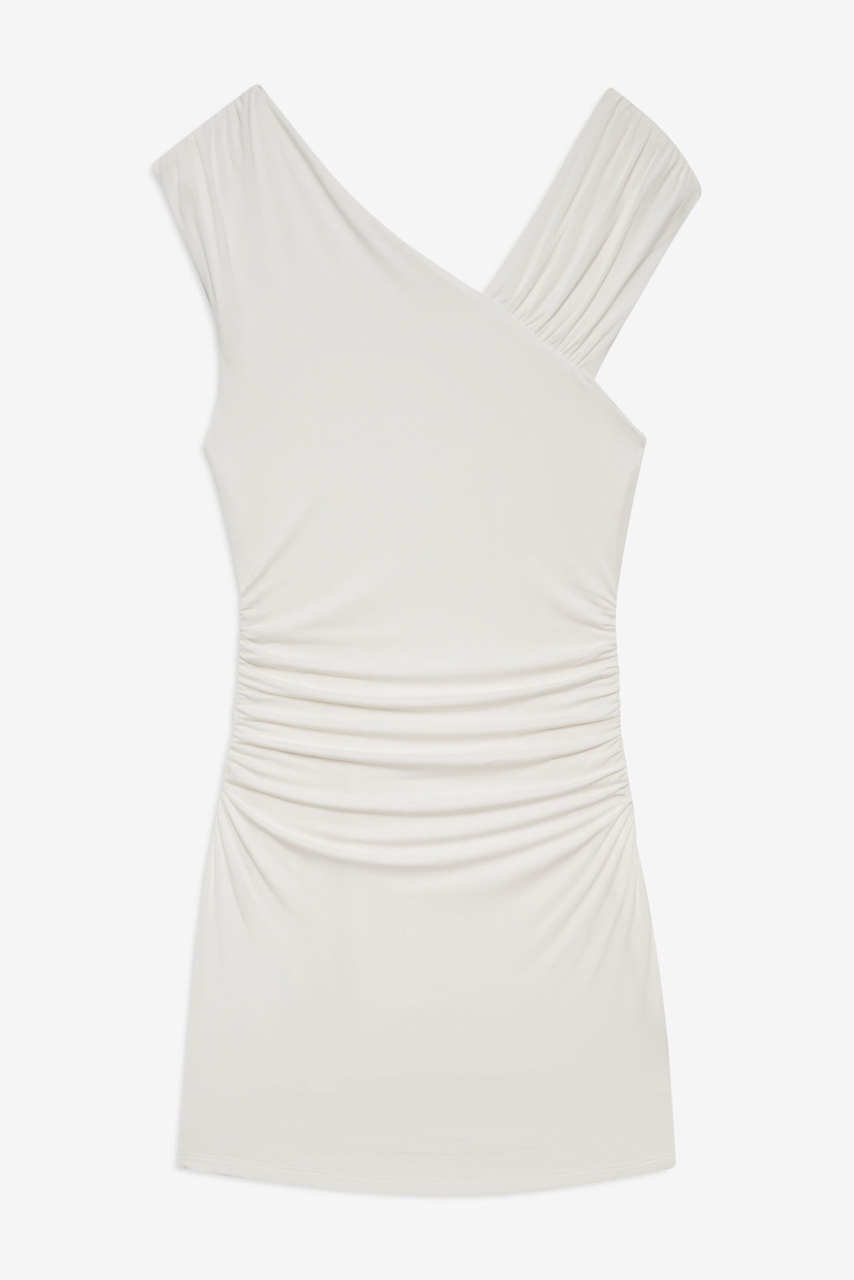 Effortless, elevated, and unmistakably cool—the Genesis white mini dress is crafted in a stretch jersey for a flattering aesthetic. This asymmetrical dress features an off-the-shoulder neckline, bodycon fit, and ruching throughout.