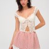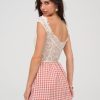 Effortless charm meets vintage inspiration with the Georgia gingham micro mini skirt–a short skirt that sits at the high-waist. Adorned with lace eyelet trims along the hem and a center-front waist bow appliqué, this micro skirt also features side pockets and an interior built-in panty.