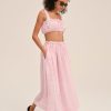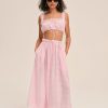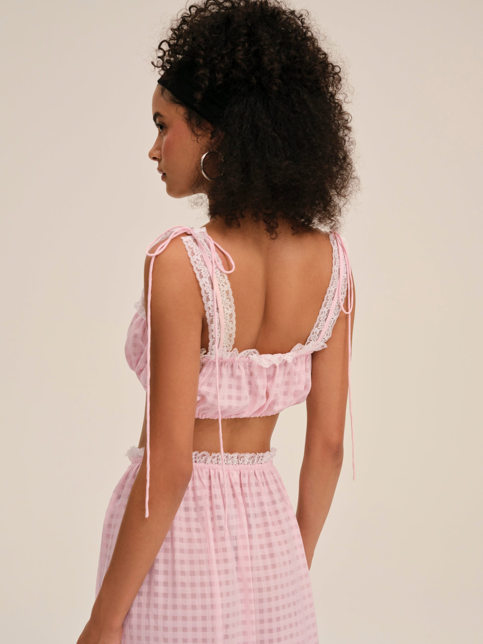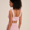 Feminine, romantic, and designed for the outdoor Muse—the Ginny gingham bra top is perfect for sun-drenched days. Crafted in a nostalgic gingham, this pink crop top is adorned with lace trims and features functional drawstrings, center-front buttons, and bows at shoulders.