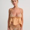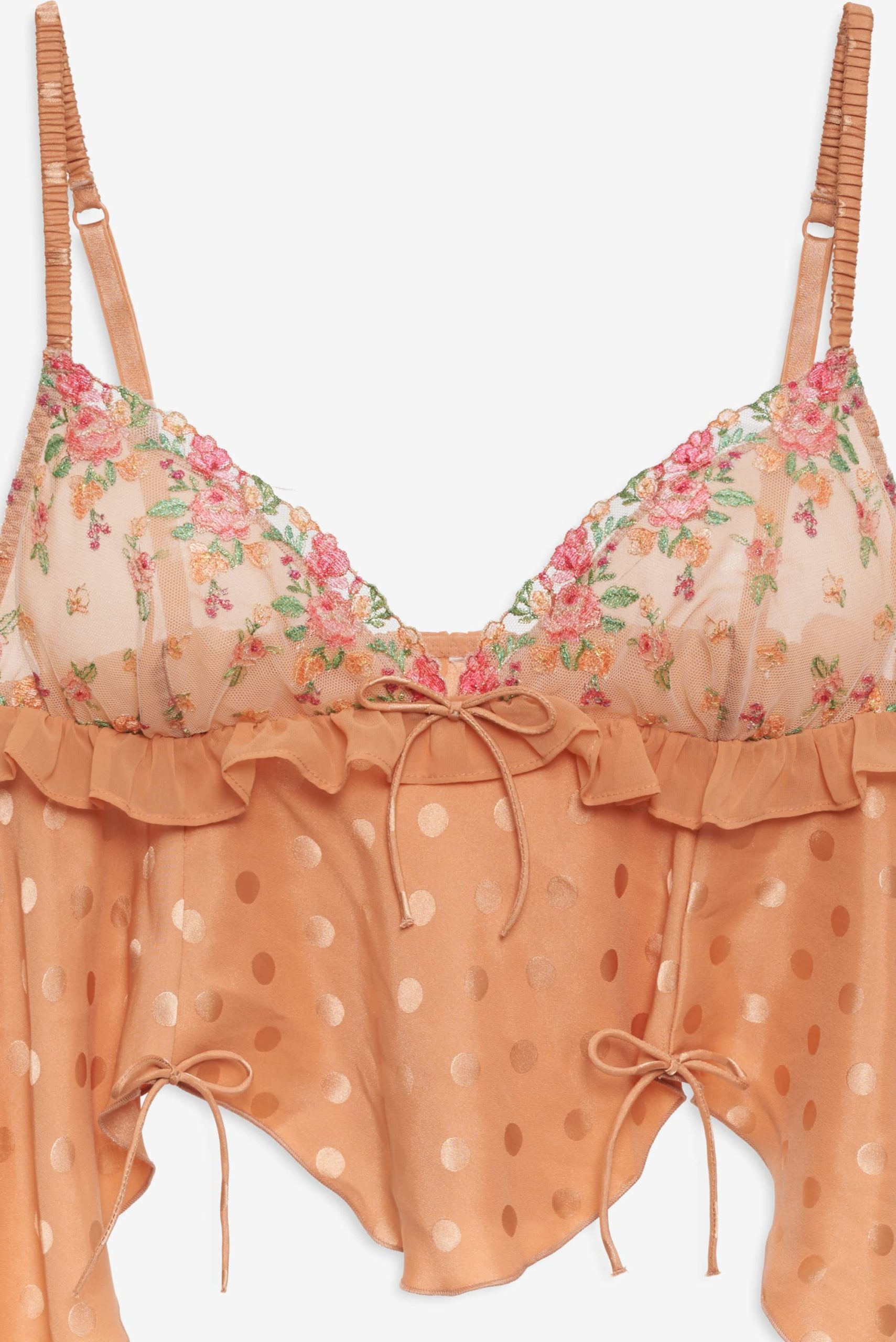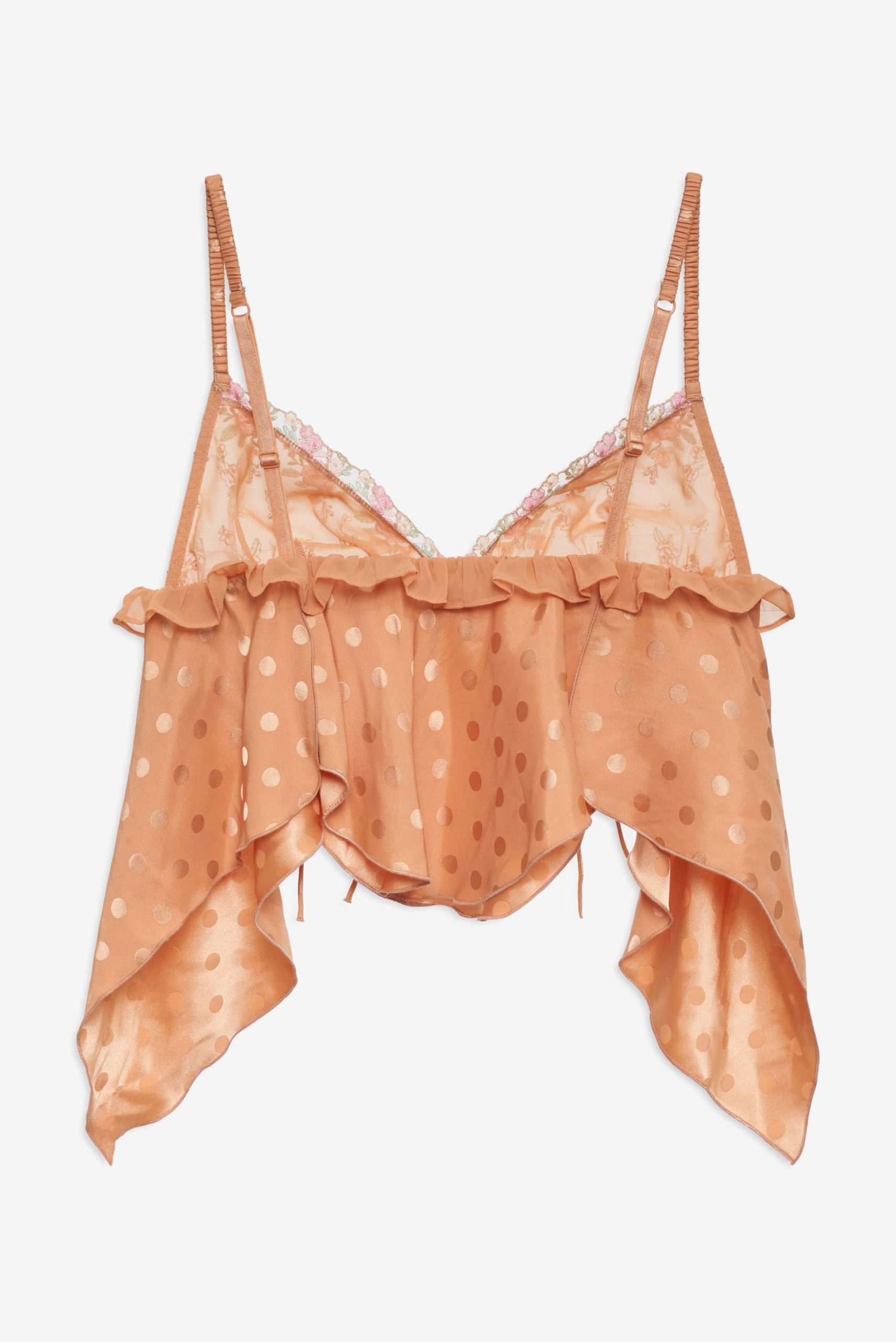 The Glimmer Rosebud polka dot top was designed to take you from the bedroom to brunch in a beat. Crafted in a lightweight dot jacquard, this satin camisole features embroidered triangle cups, scrunchie shoulder straps, an asymmetrical hem, and decorative bows throughout.