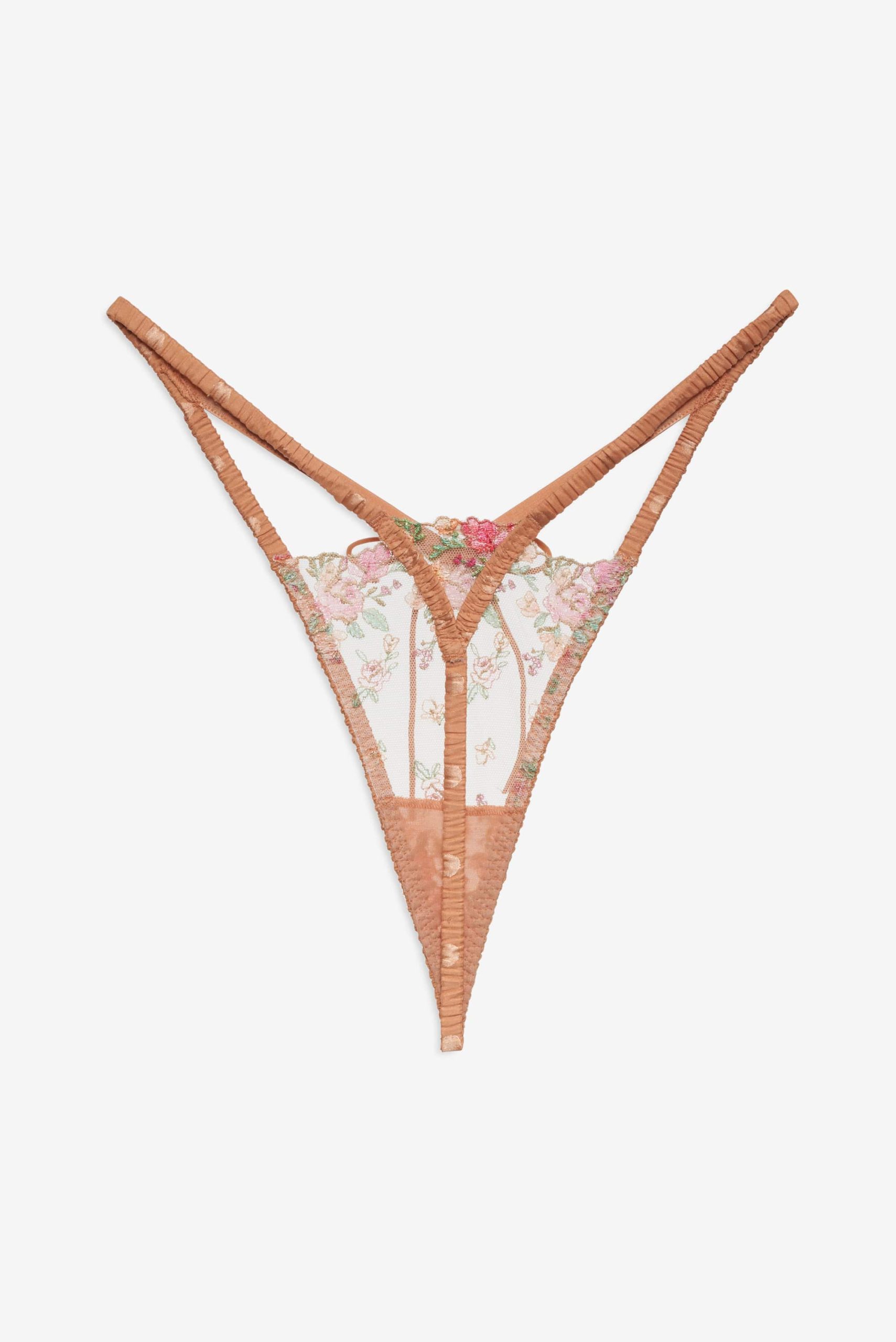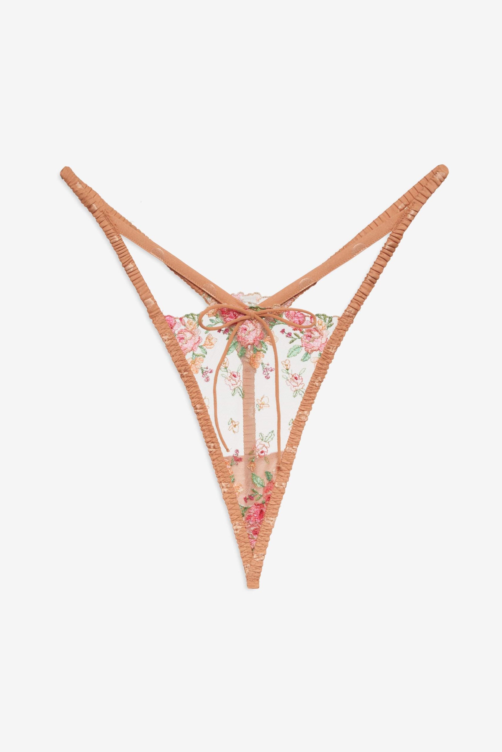 Designed for living, lounging, and layering—the Glimmer Rosebud embroidered thong features flirty cutouts, scrunchie hip straps, and a decorative skinny bow at center-front.