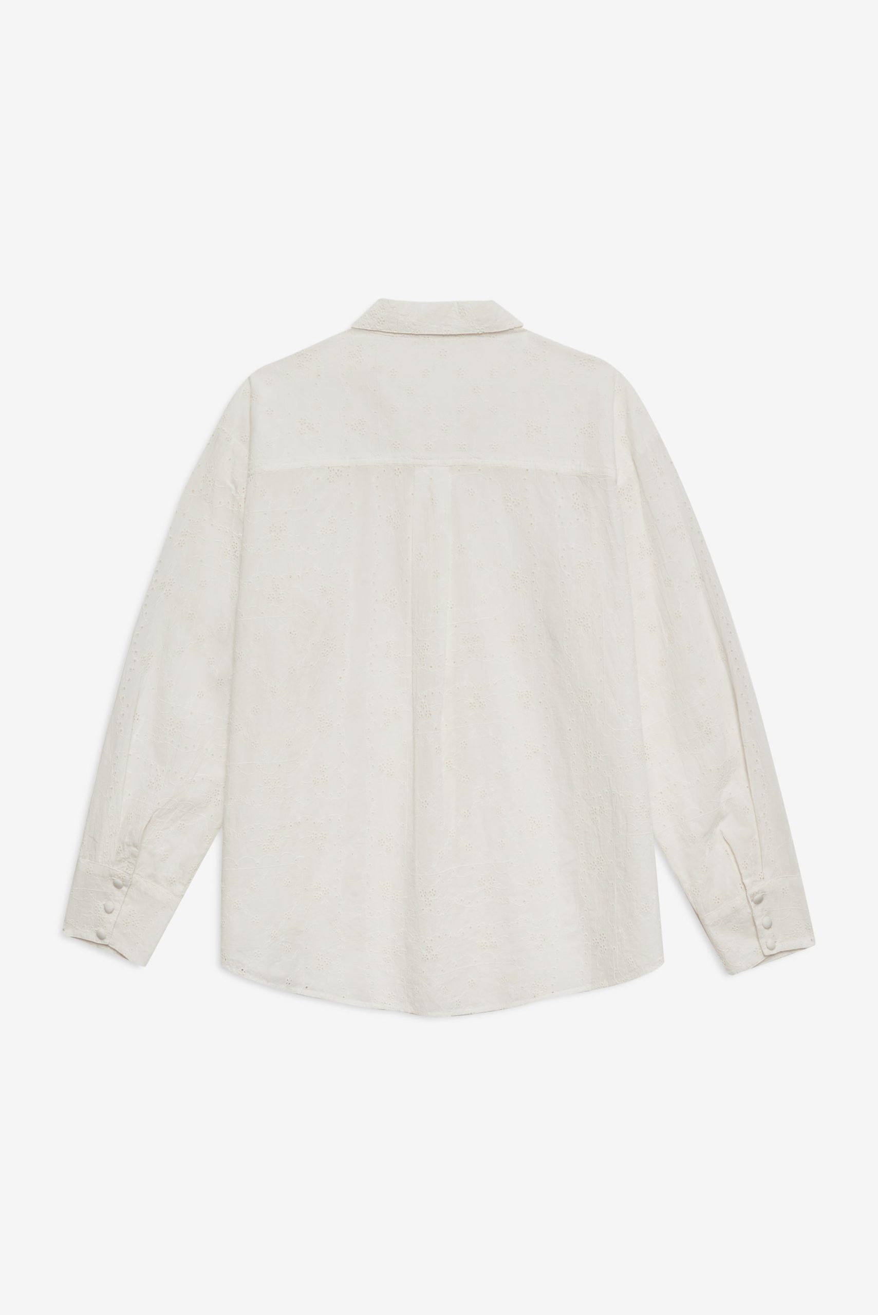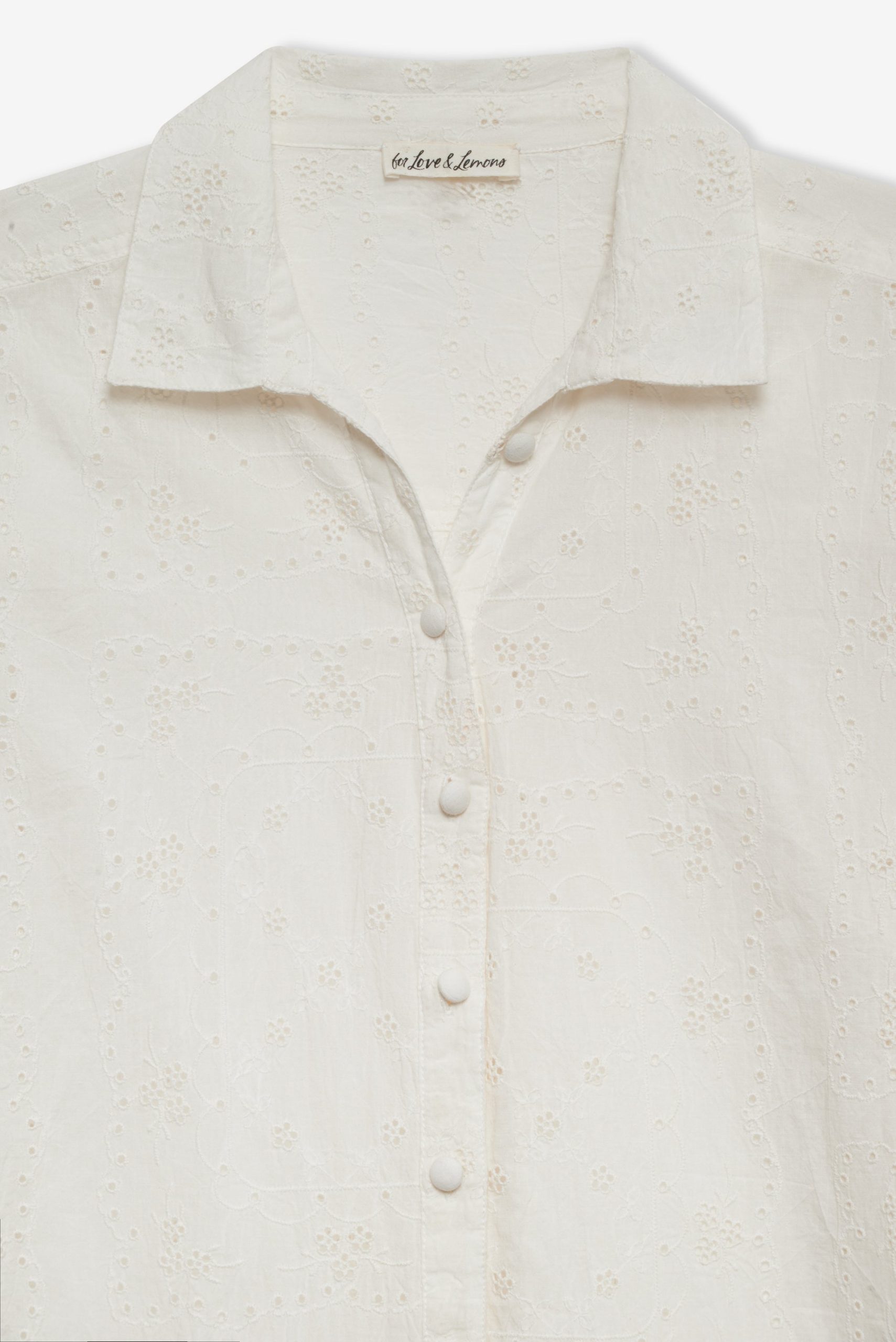 From the dock to the picnic blanket, the Handkerchief white button up shirt was made for the effortless Muse. Crafted in an eyelet cotton, this oversized button down features a standard shirt collar, buttons at sleeve cuffs, and a flowy fit throughout. Pair this cotton button up with the Handkerchief Short for a complete co-ord set.