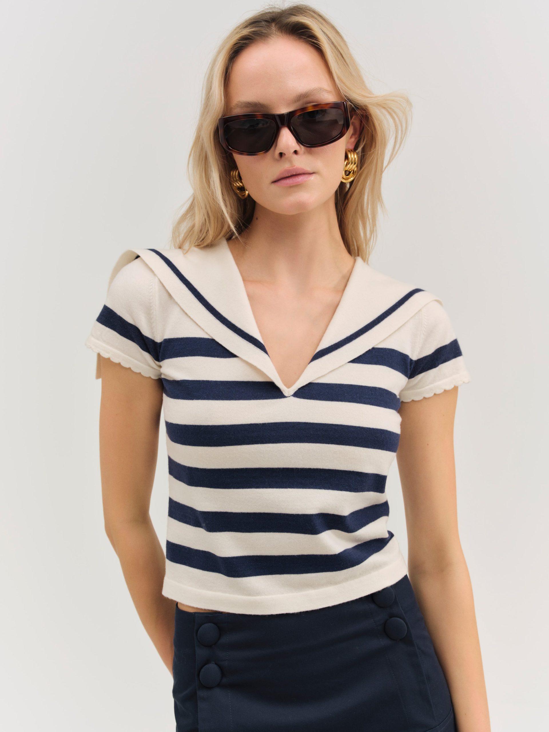 The Harbor Stripe sailor knit top makes a playful nod to a timeless aesthetic. This sweater top is rendered in a classic white and navy palette and features a dramatic contrast stripe sailor collar and scalloped trim sleeves.