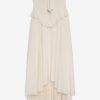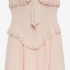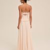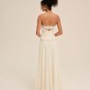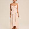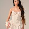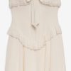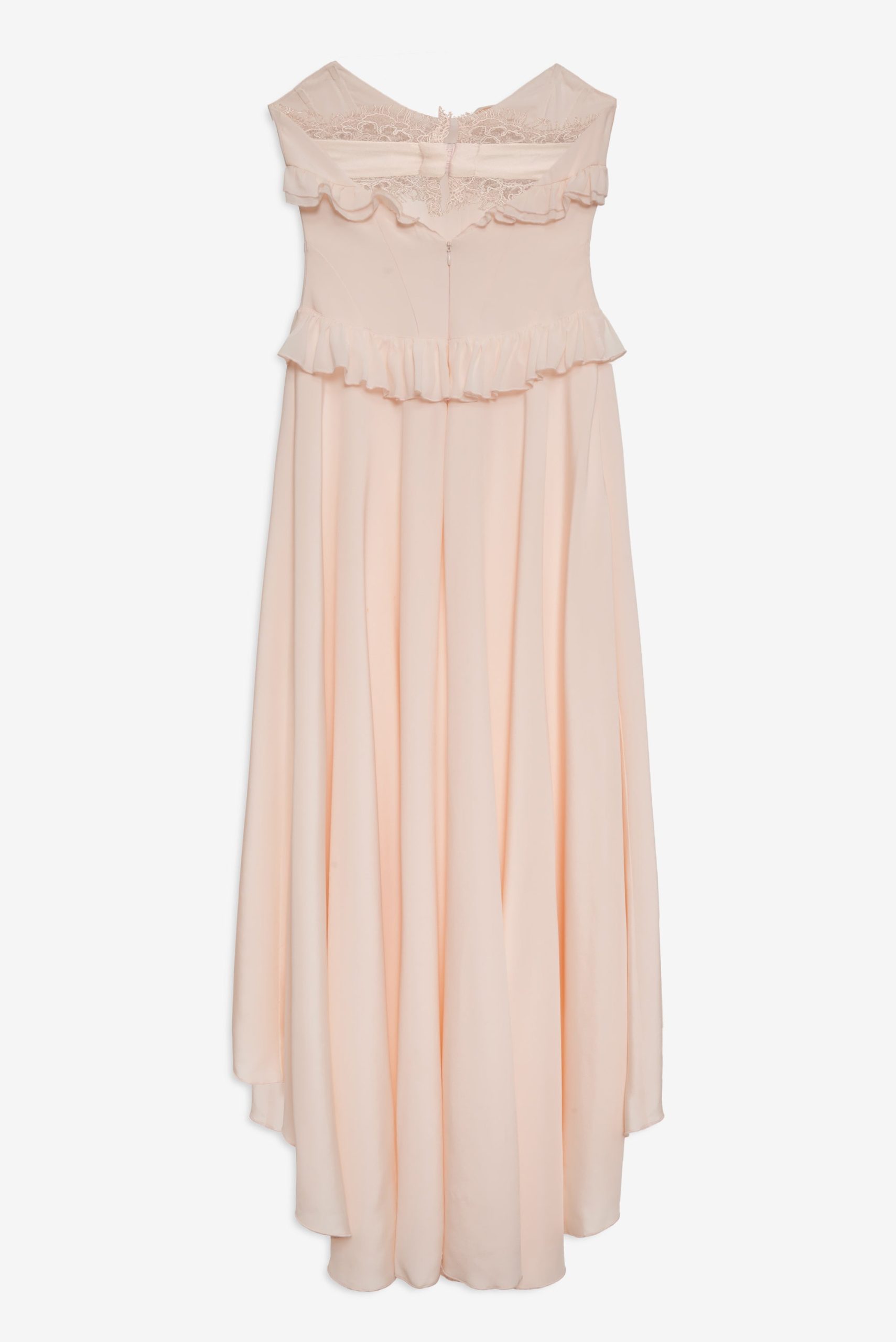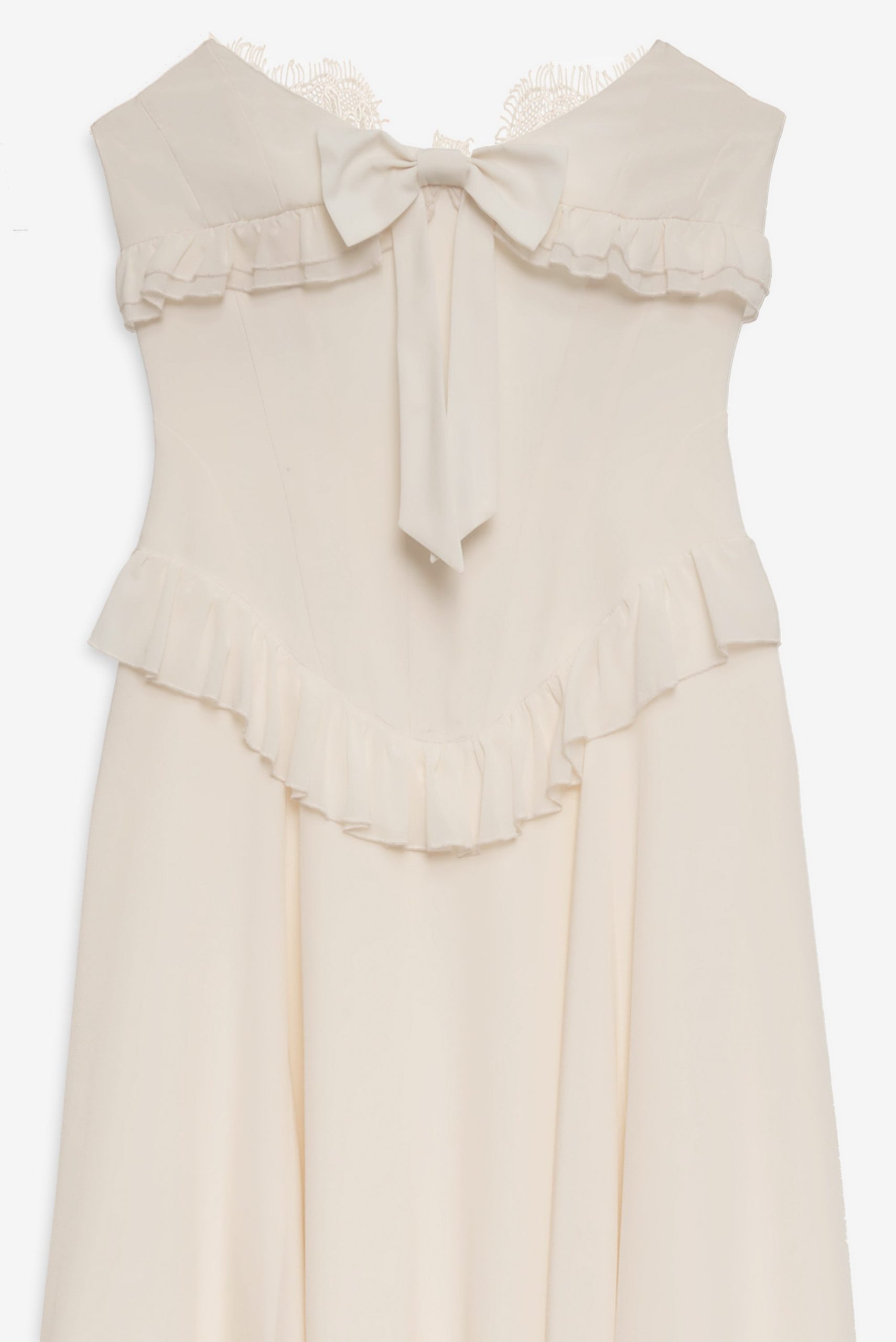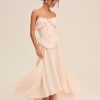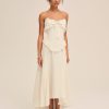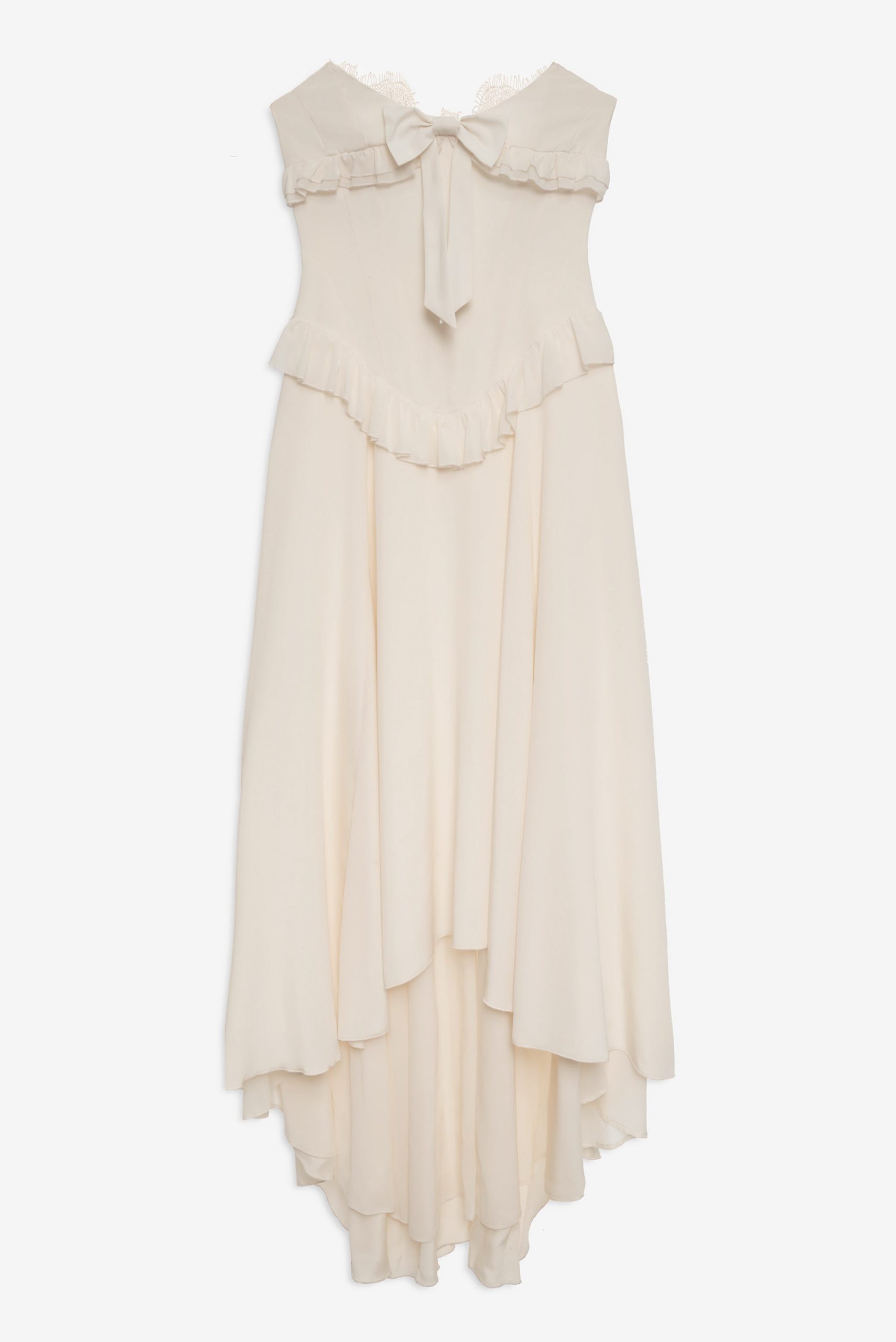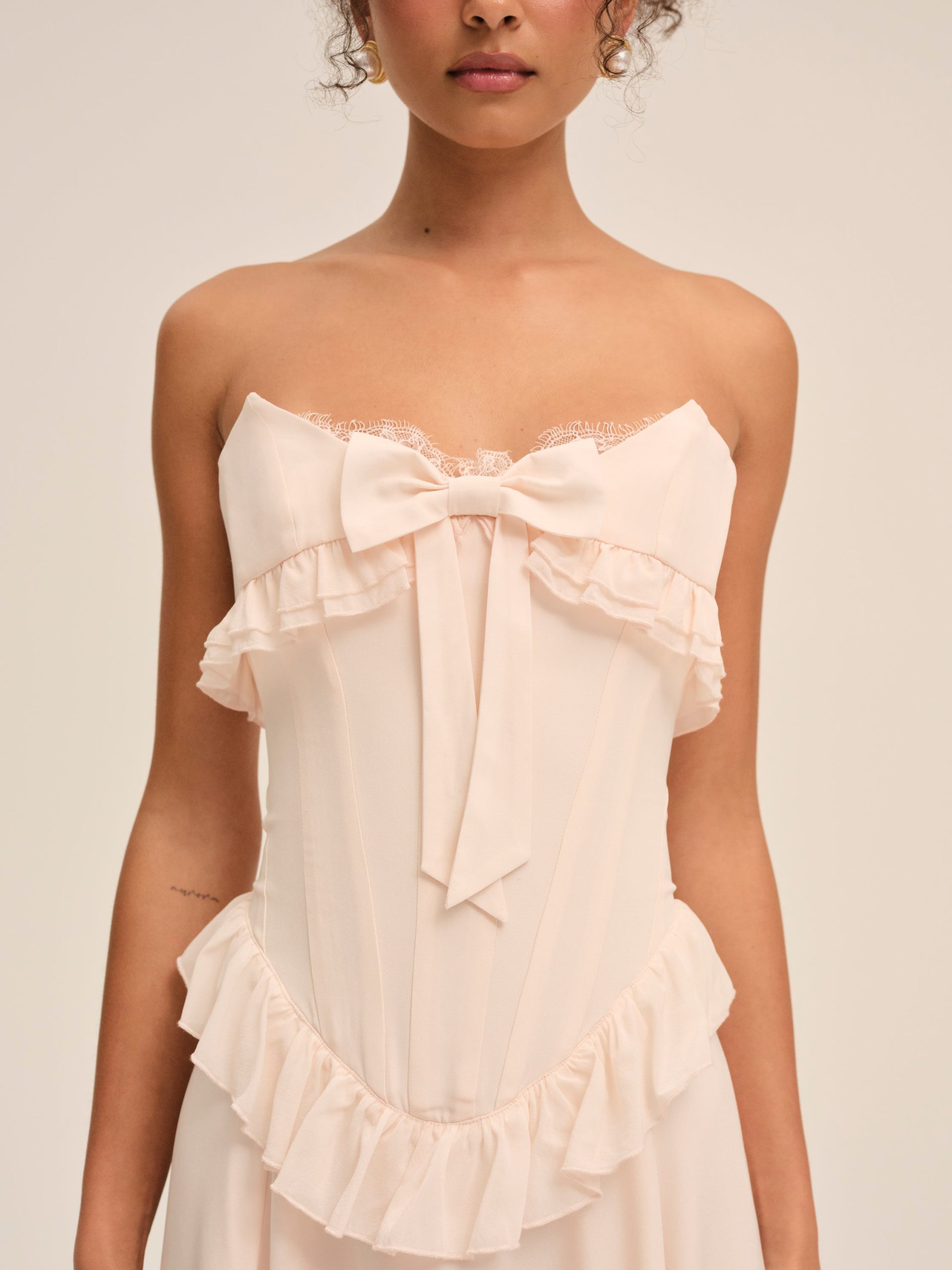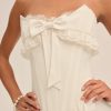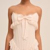 FOR LOVE & LEMONS KEEPSAKES: Capture the ease of barefoot evenings by the shoreline with the Harmony corset maxi dress–a strapless drop waist gown adorned with lace trim at neckline, delicate ruffles at bust and hips, a center-front bow, and a flowing high-low skirt with a small train at back.
