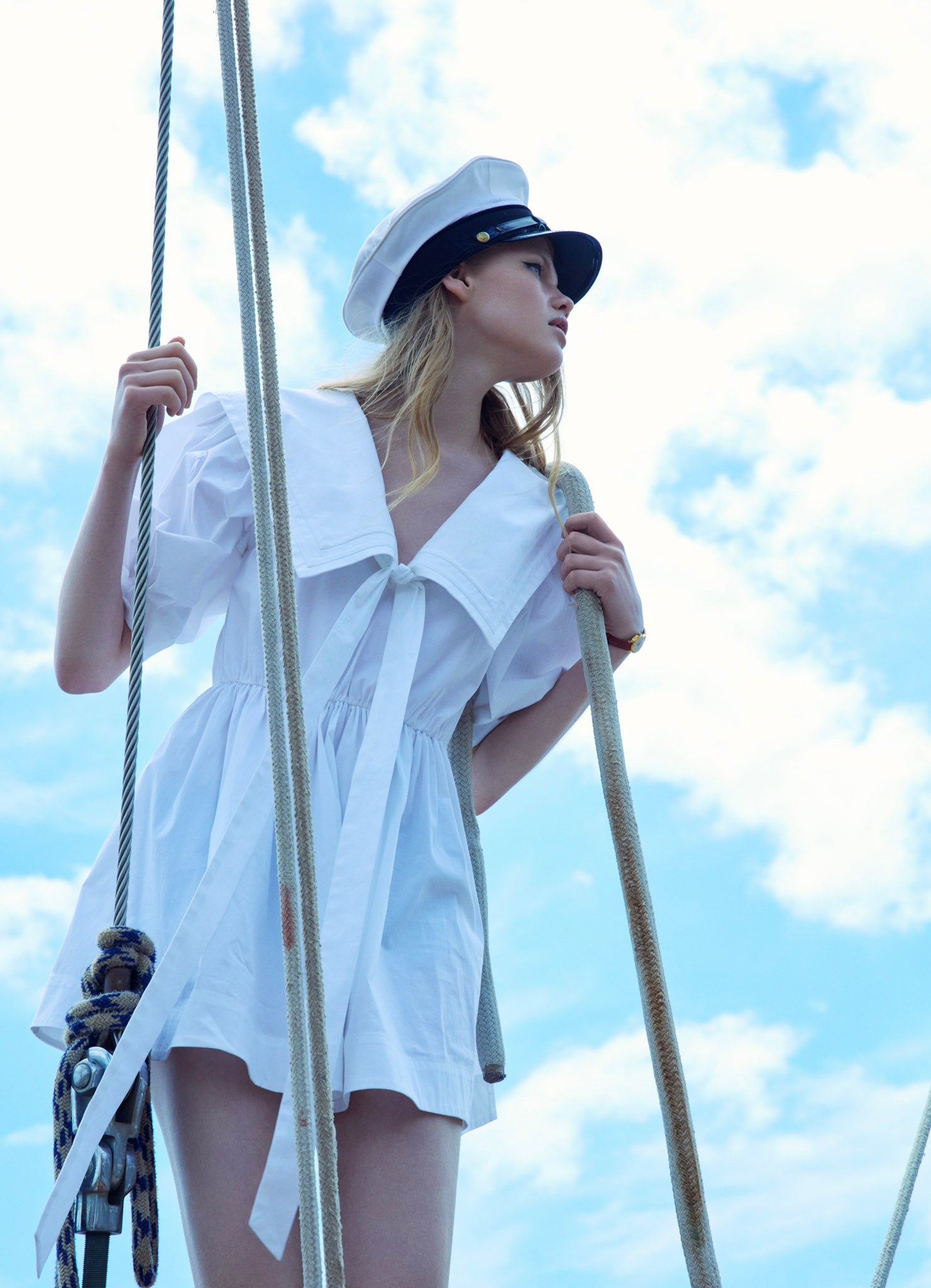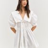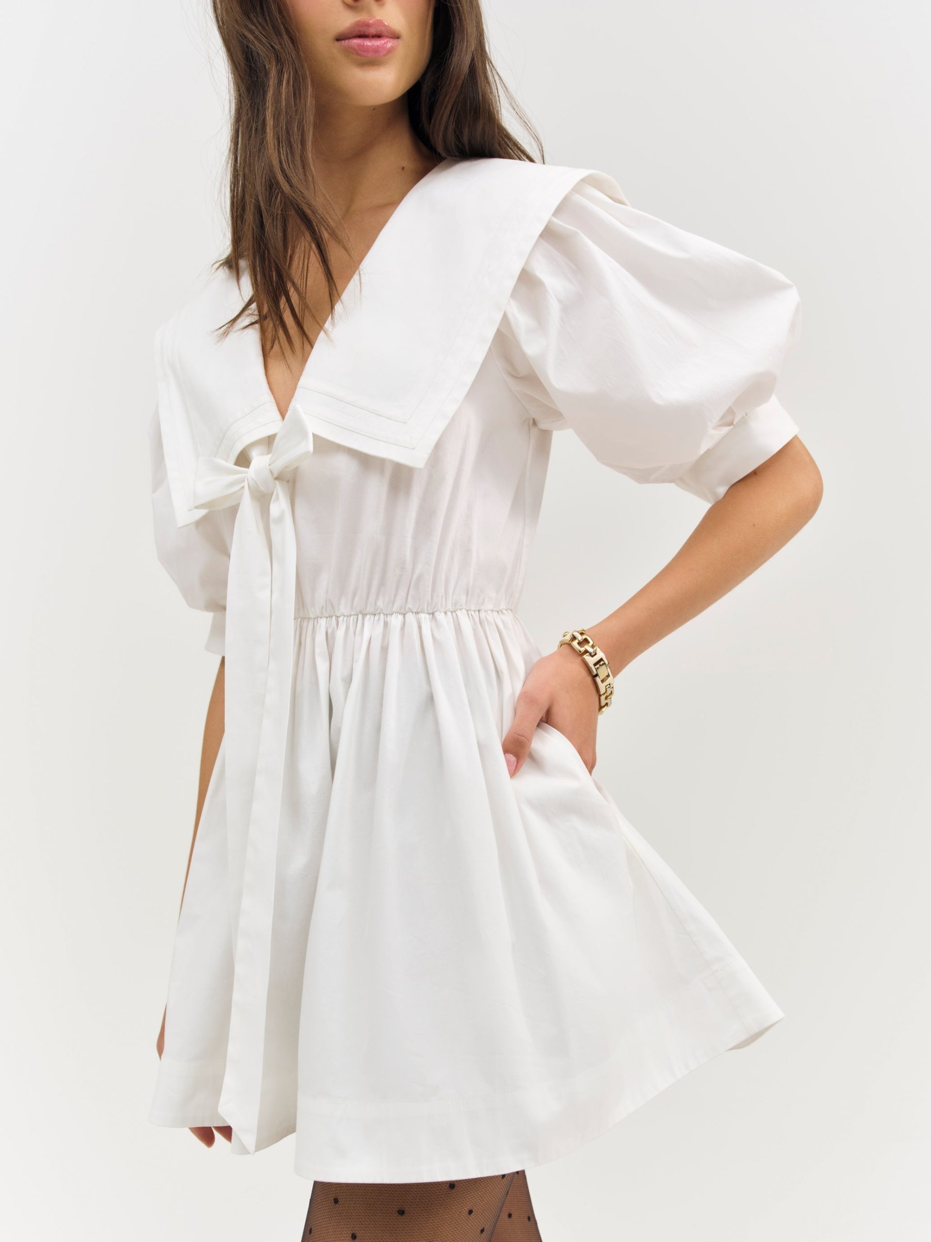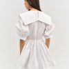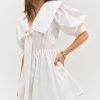 Exuding sailor spirit, the Helena Poplin puff sleeve mini dress charms with its wide square sailor collar and dramatic pleated sleeves. Adorned with a center-front bow, this white mini dress features an elasticated waist for an easy pull-on fit.