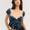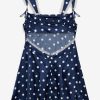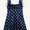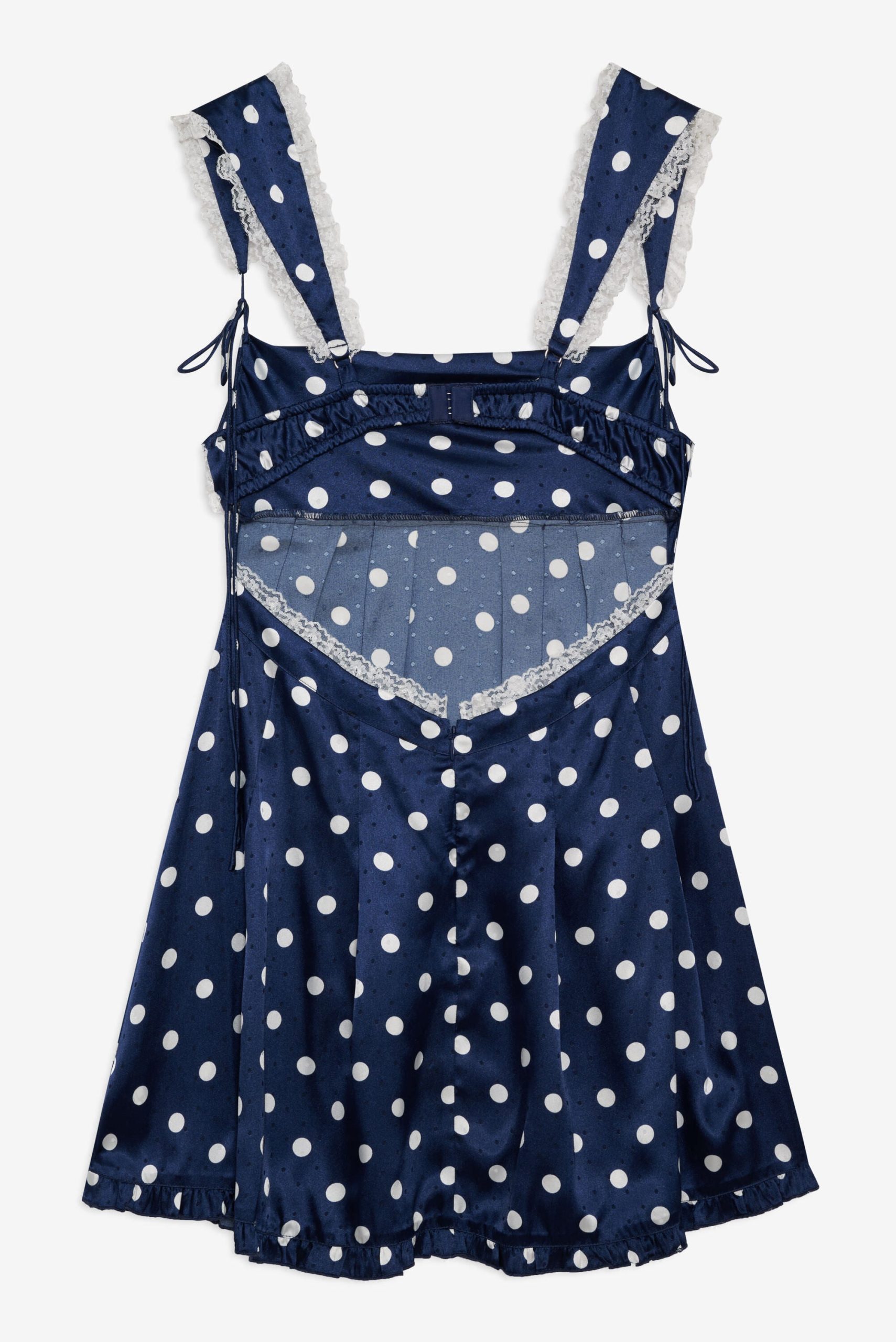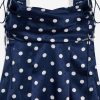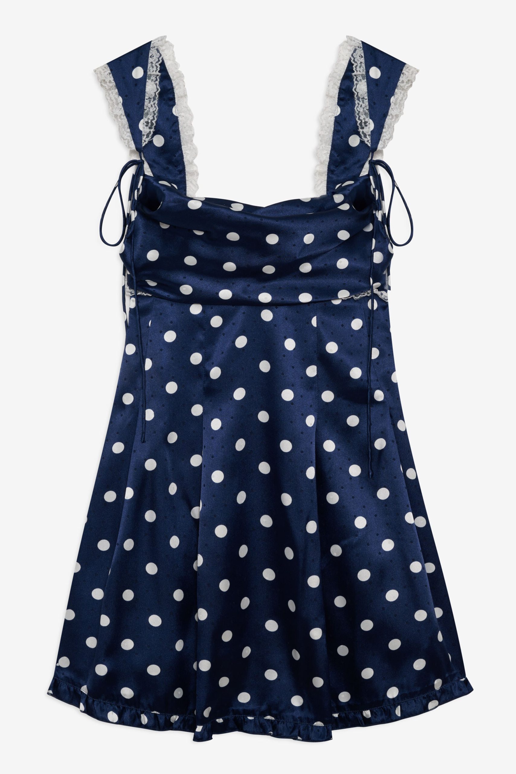 Discover our romantic interpretation of maritime charm with the Holland polka dot mini dress—a navy mini dress that spotlights ruffle-trimmed straps, a cowl neckline, and a skirt that slightly flares out towards the hem.