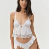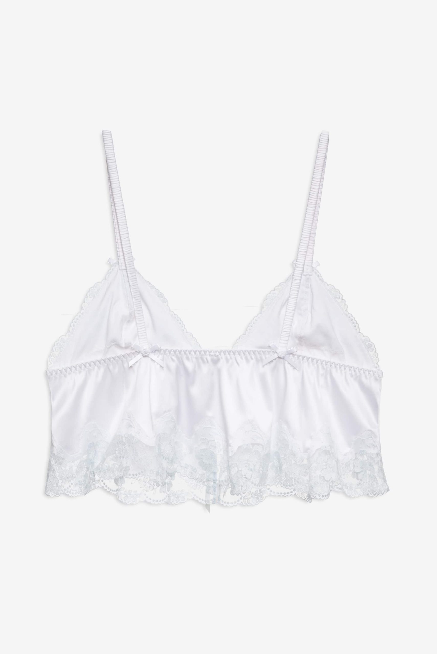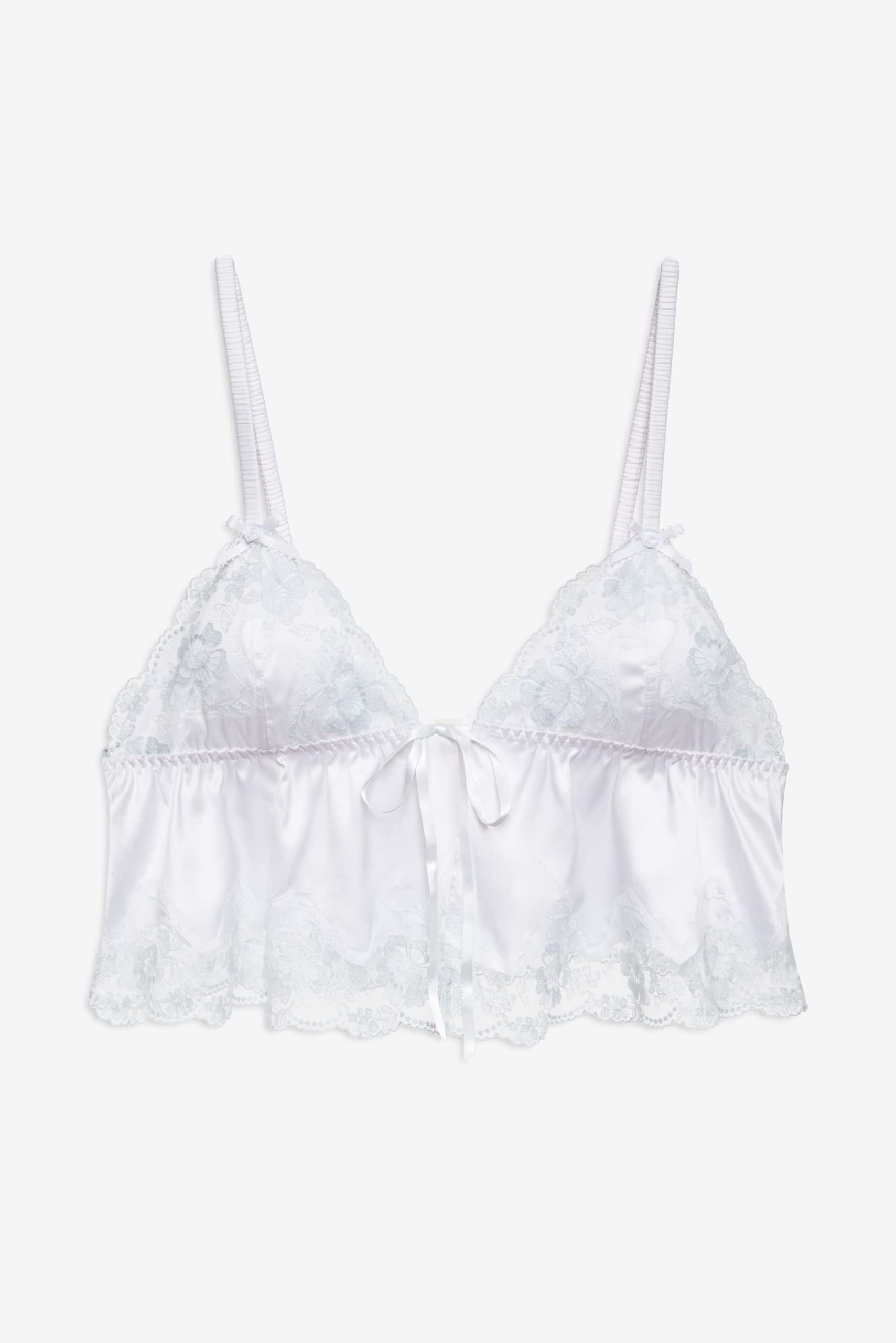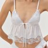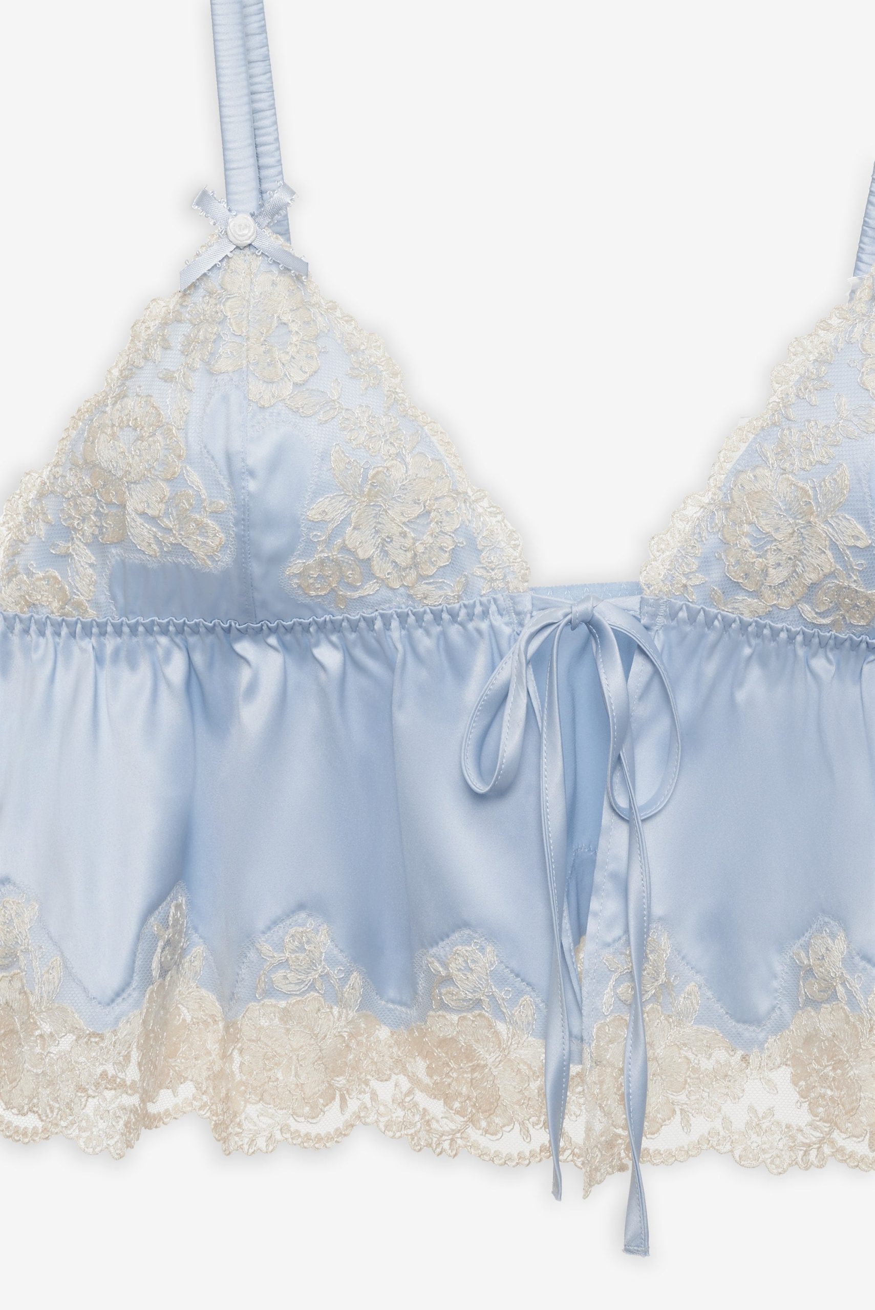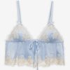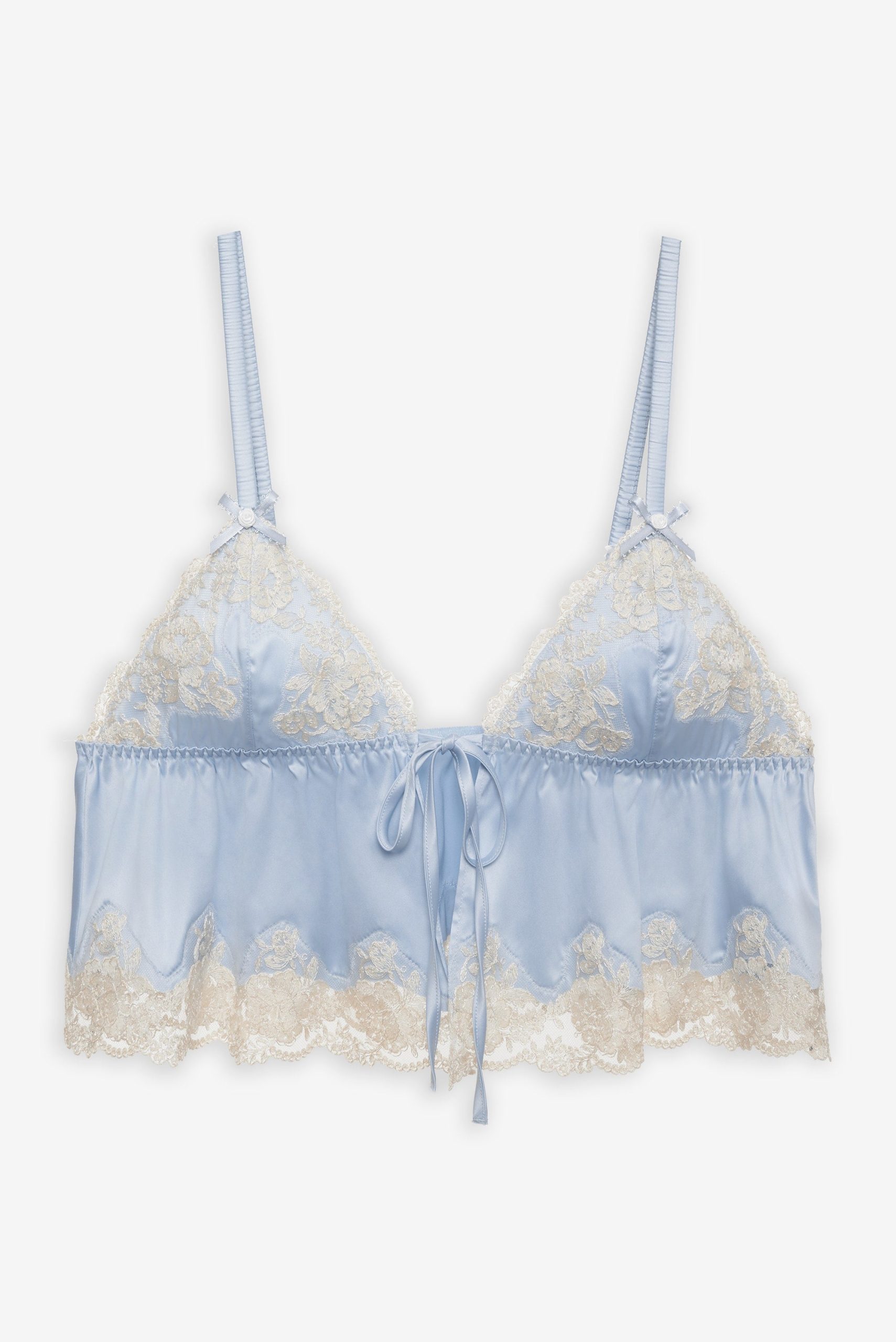 Designed to blur the lines between lingerie and daywear, the Jaden sleep top was made to be worn in and out. This open-front cami is crafted in a sleek satin and adorned with vintage-inspired lace trims and decorative bows.