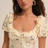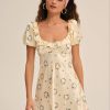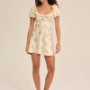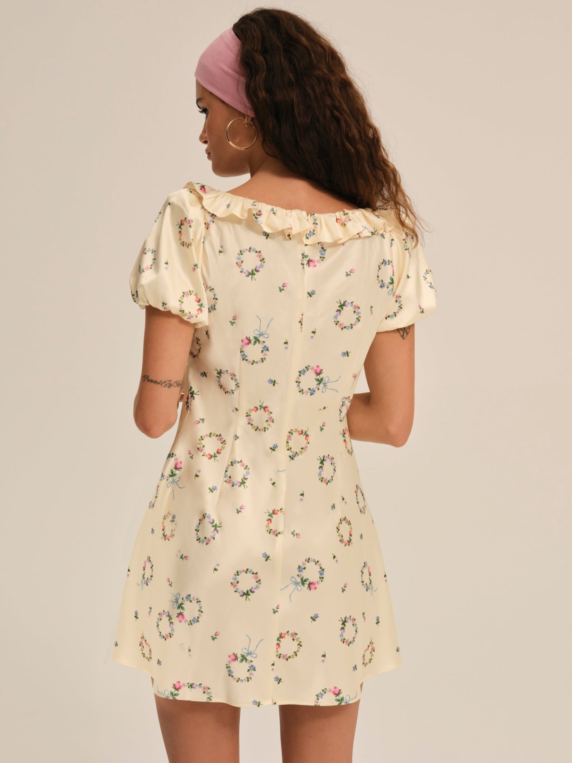 Embrace the warmth and romance of summer with the Jaida floral mini dress–a short sleeve mini dress designed with a ruched bust, a ruffled neckline, and adorned with a center-front bow.