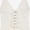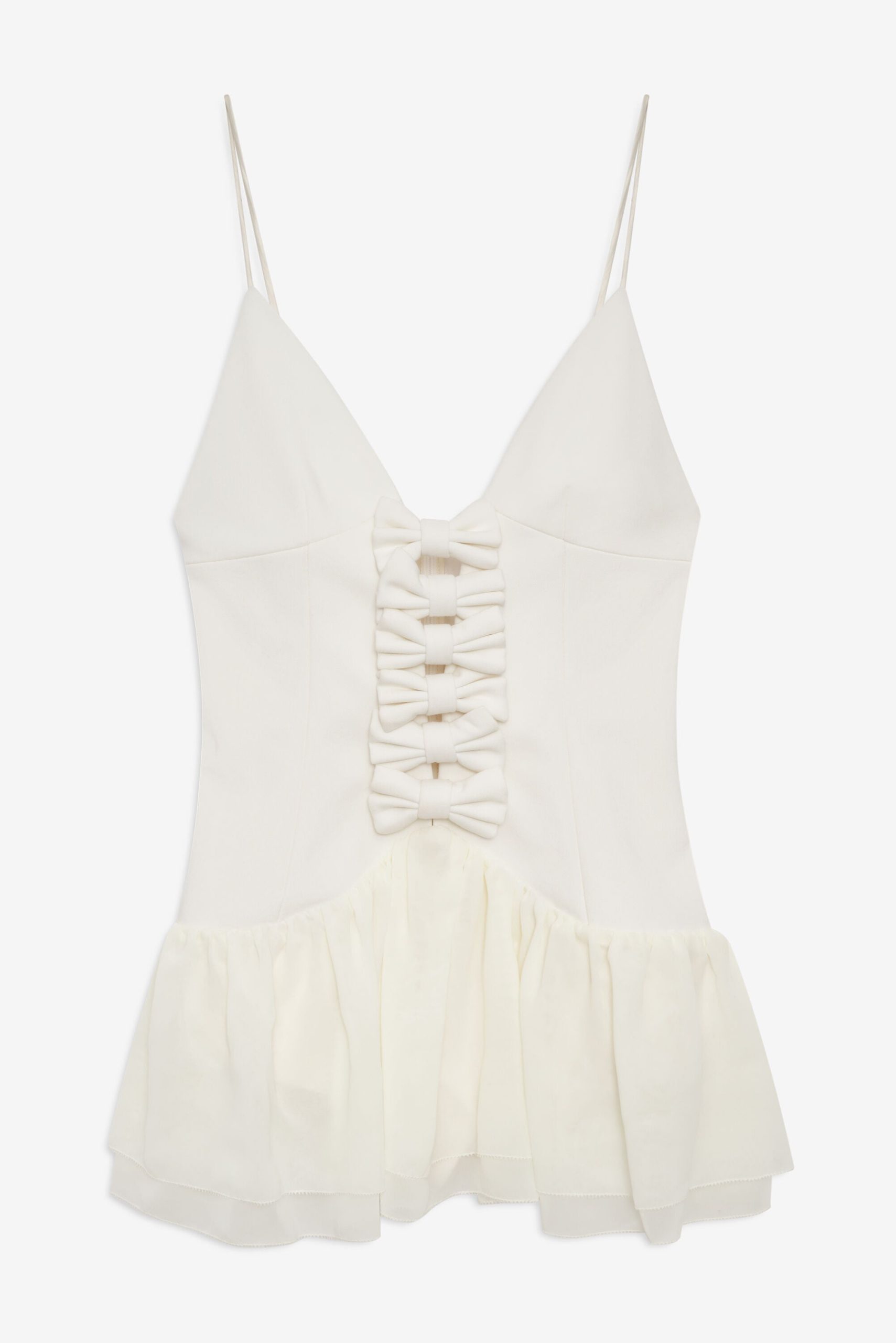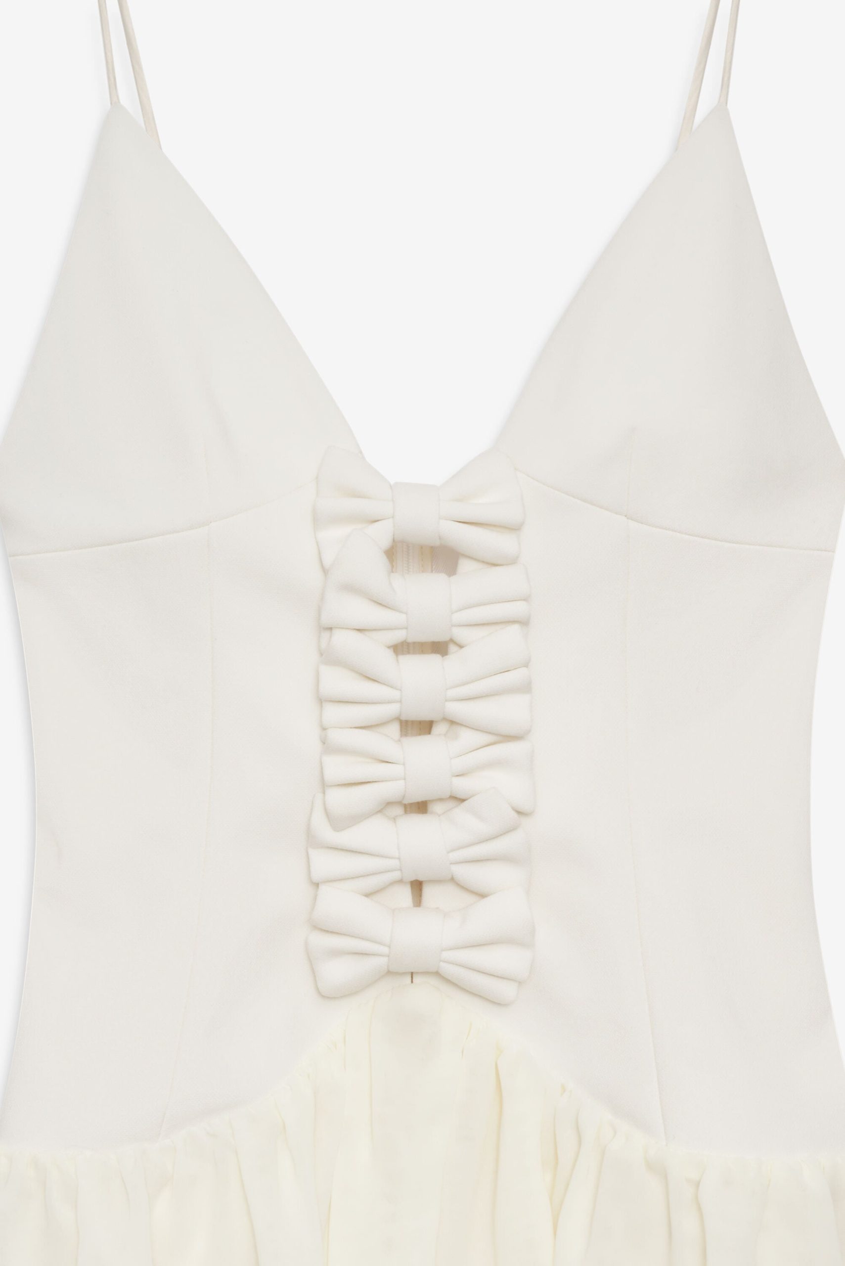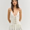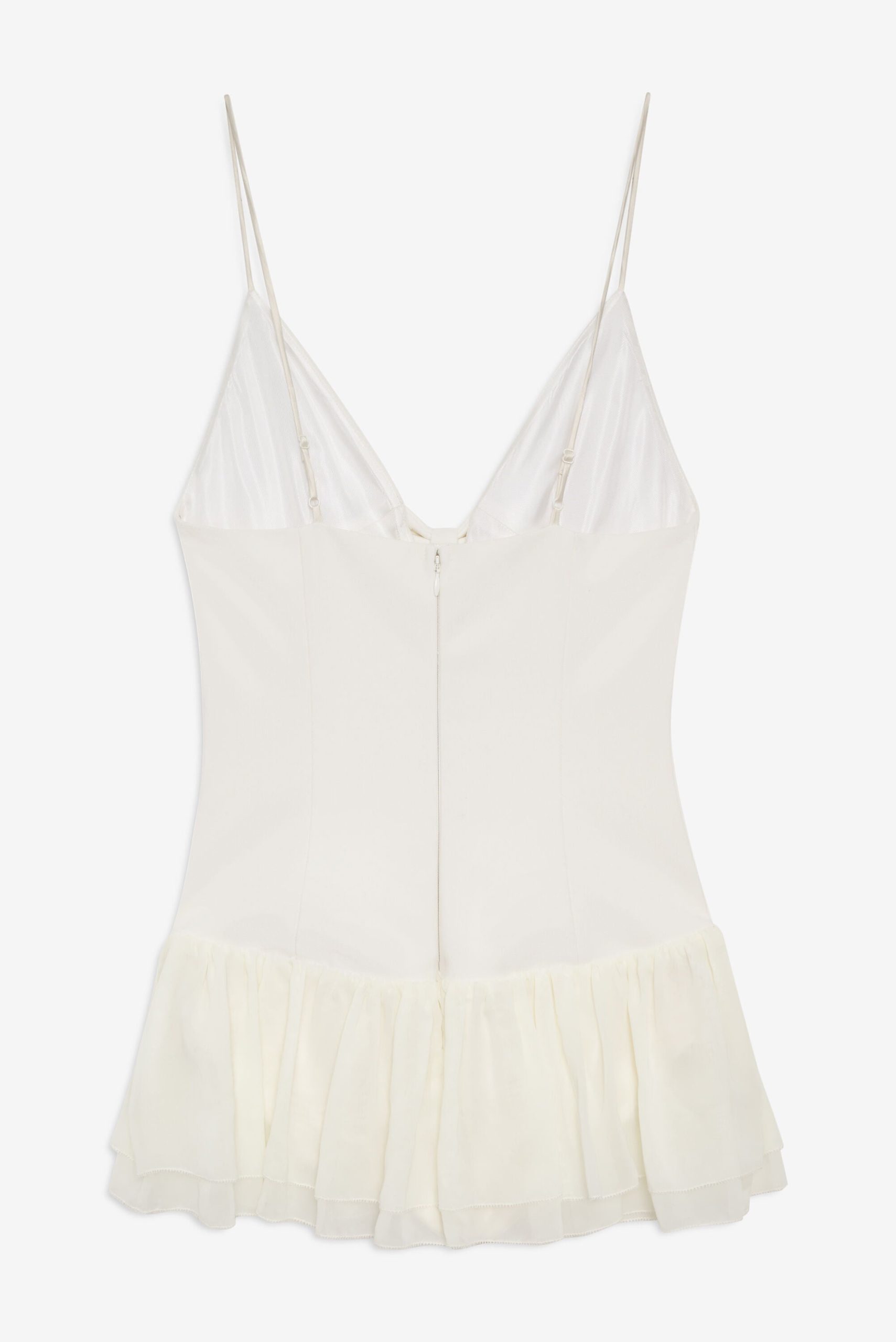 Ultra-feminine and hopelessly romantic, the Josie micro mini dress has a timelessly chic feel. Crafted in a heavyweight satin, this drop waist dress features a plunging neckline, double layer gathered skirt, and decorative bows at the center-front.