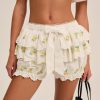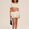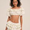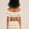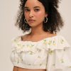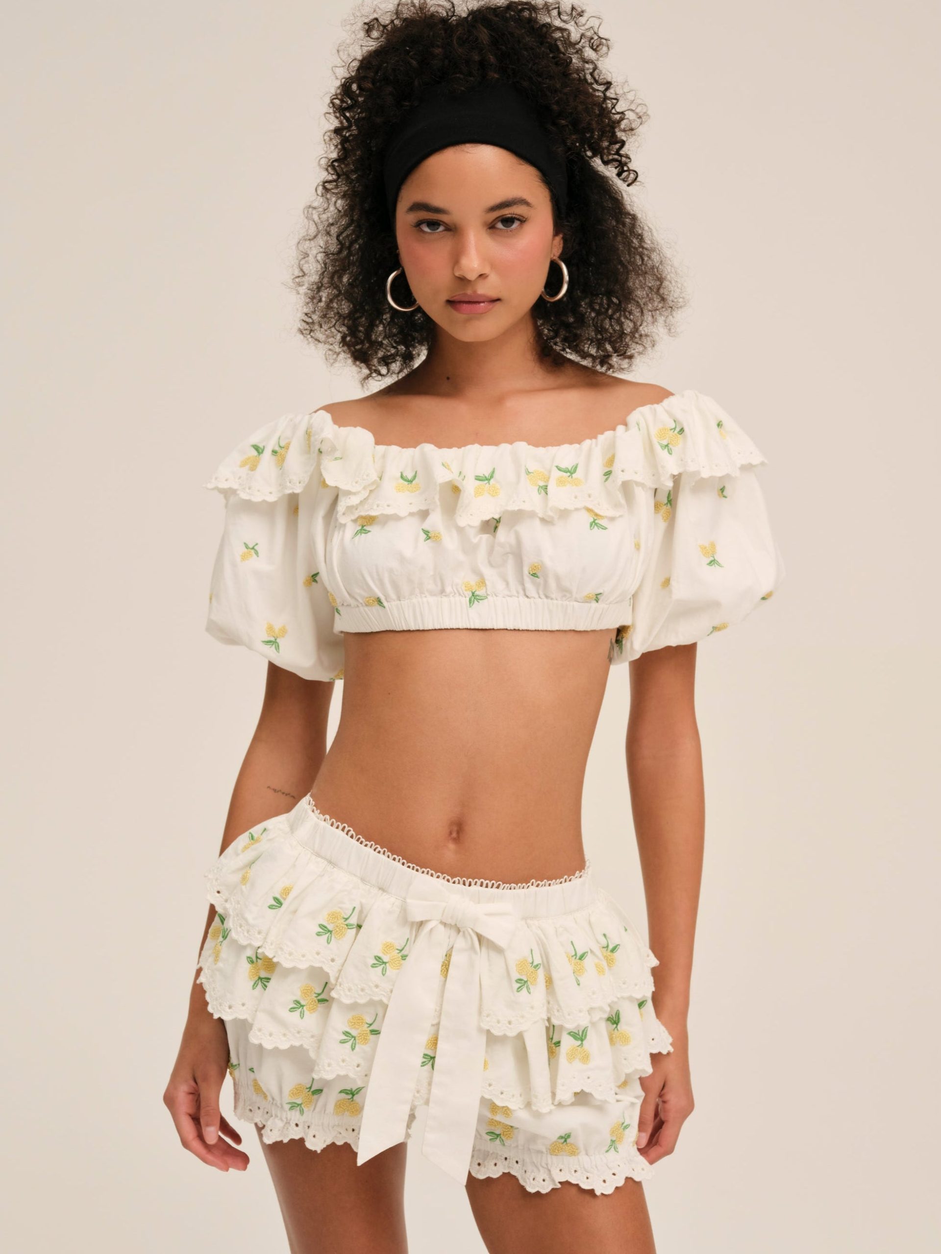 Inspired by iconic vintage silhouettes, the Lemon Spritz white crop top evokes a charming summertime feel. Crafted in 100% cotton, this bra top features a nostalgic lemon embroidered print, ruffled off-the-shoulder neckline and puff sleeves with scalloped edges.