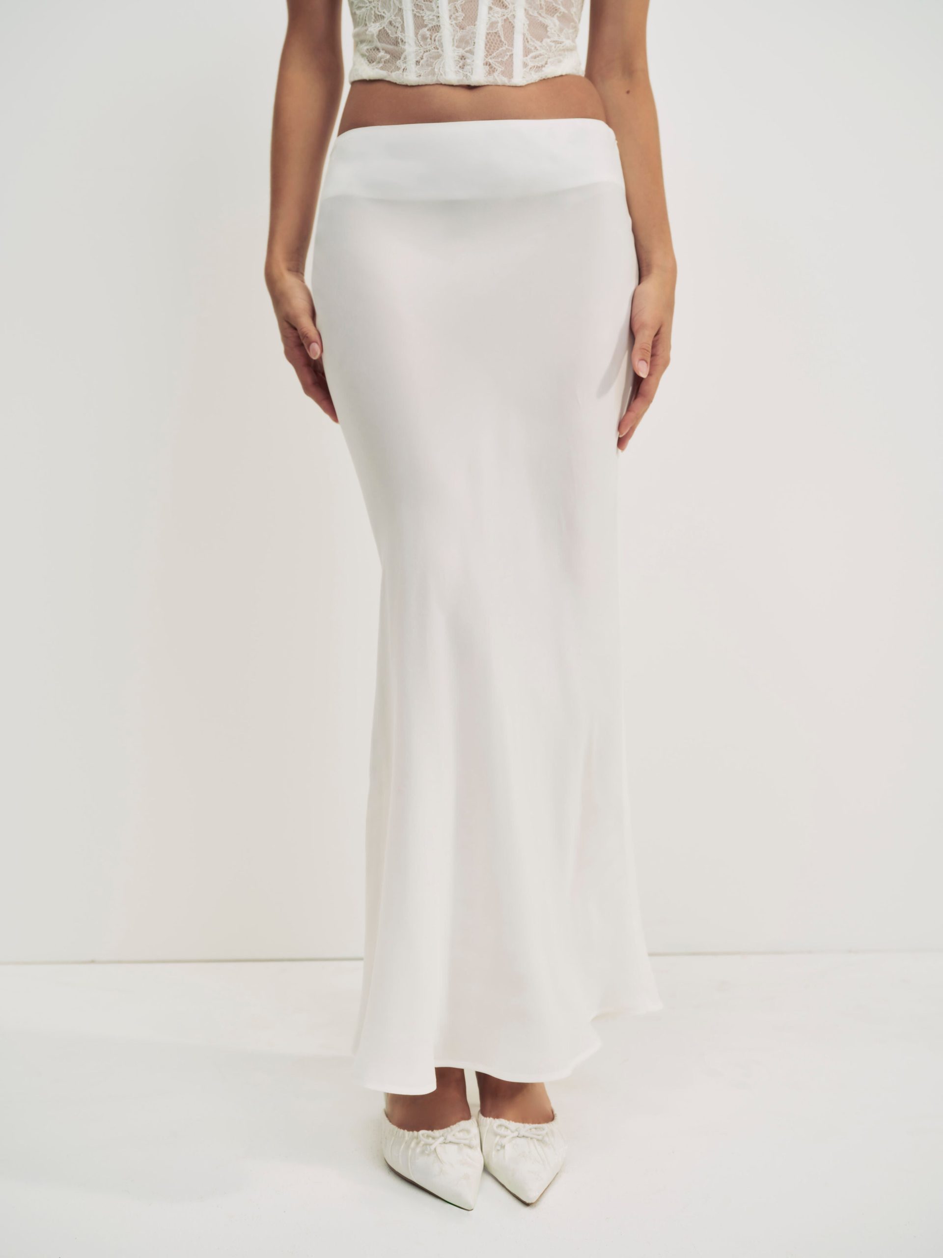 The Lena cream maxi skirt was made for every chapter of your “I do”. This low-waisted bridal skirt is bias-cut and flares out hem for an ultra-flattering fit.