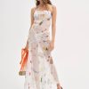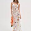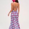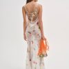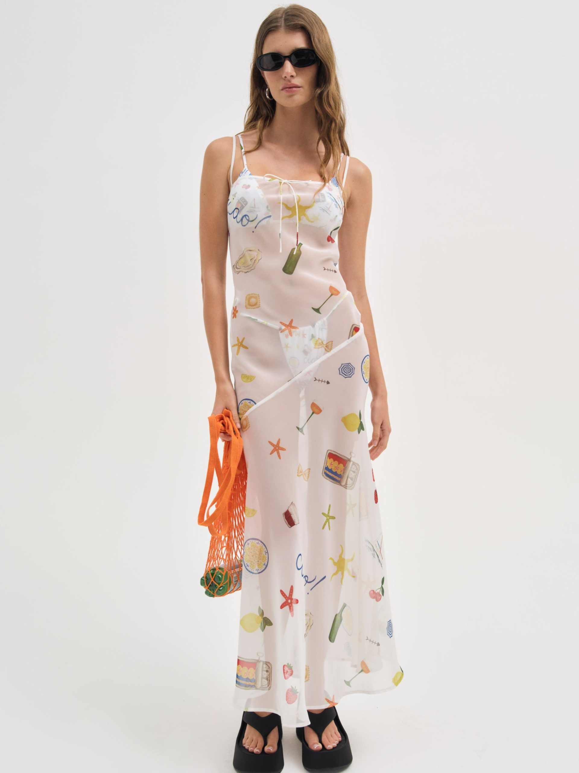 Embrace the summer spirit with the Marina printed maxi dress–a bias cut maxi dress crafted in a lightweight chiffon featuring a charming Positano “ciao” print by artist Keely Murphy that captures the essence of summer living. This white maxi dress features an alluring low open back and square front neckline with center-front bow detail.