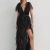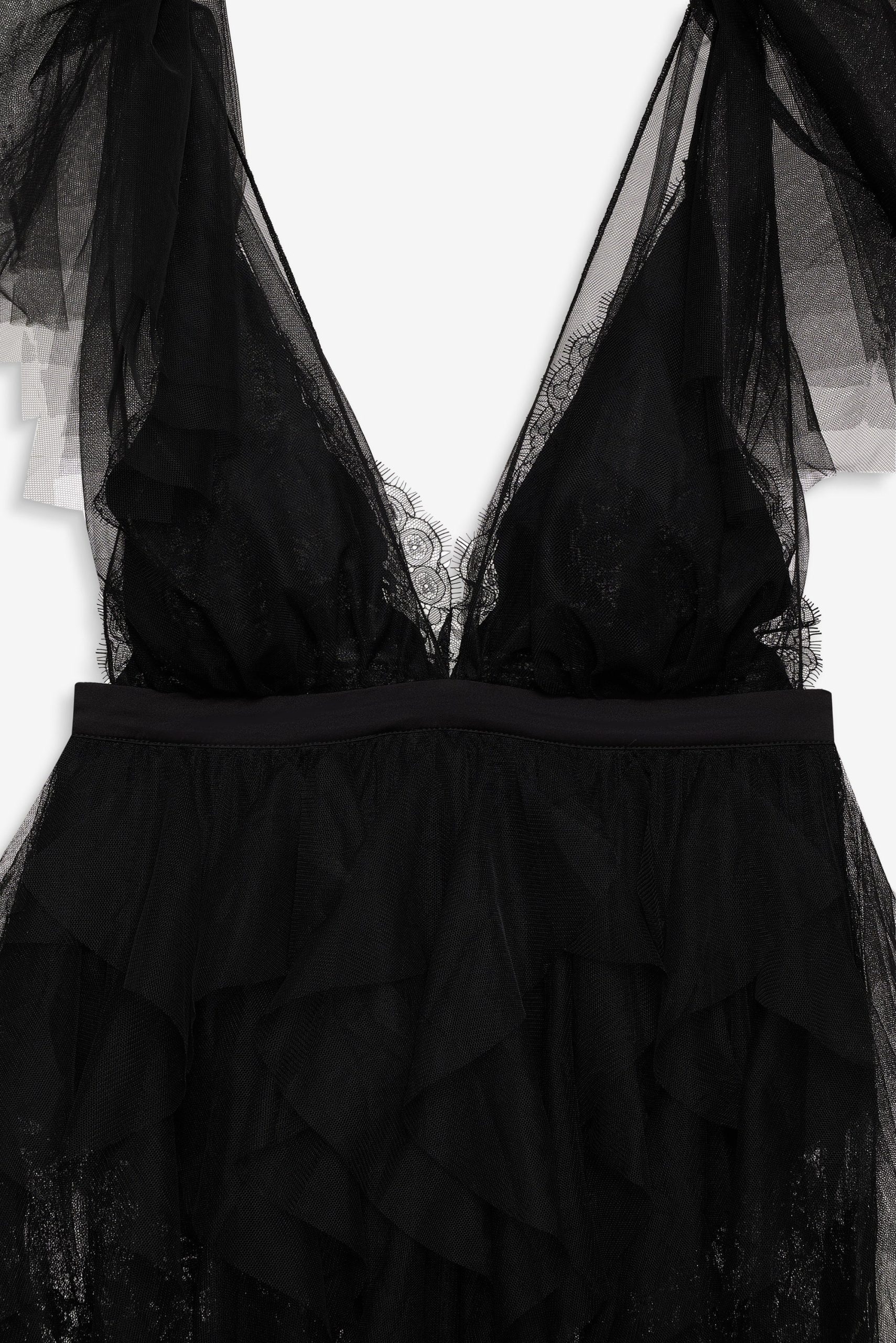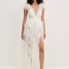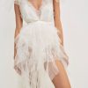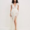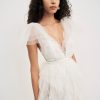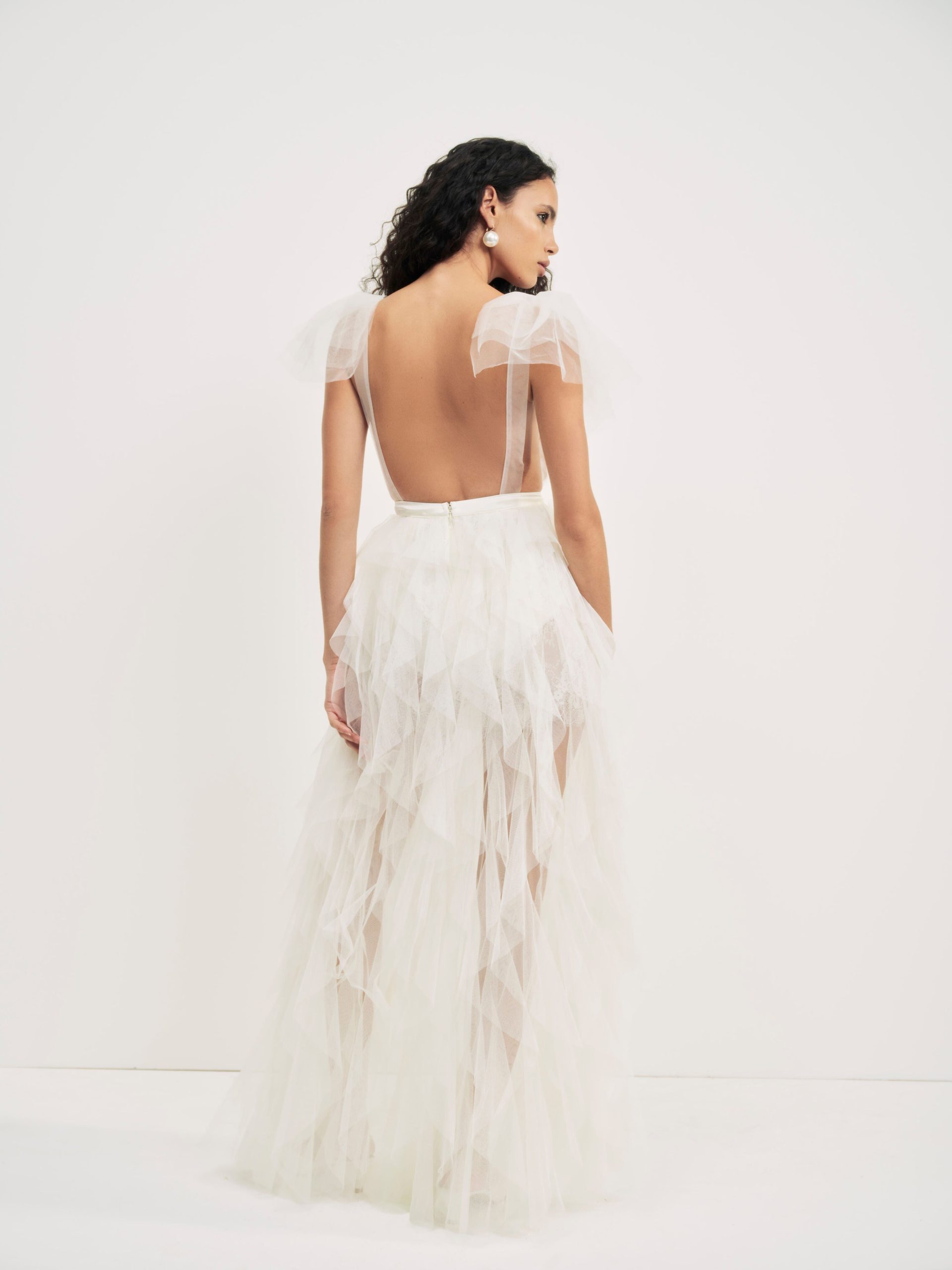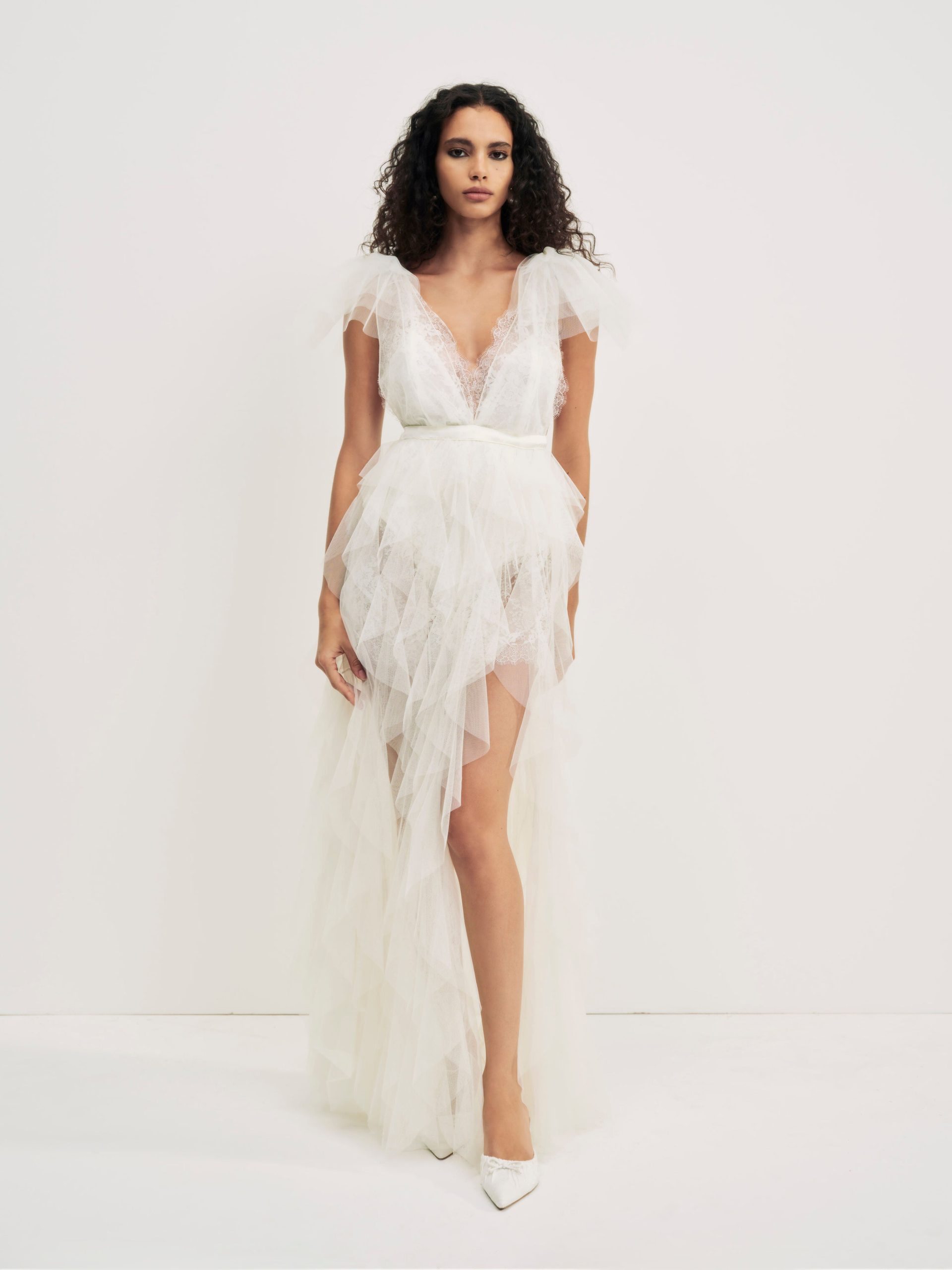 The perfect blend of ethereal elegance and detail-driven romance—the Maxine white gown is a true show-stopper. Crafted in a dramatic soft tulle, this bridal gown spotlights an alluring plunge neckline, a low open back, and cascading gathered ruffle tulle atop a floral lace underlay bodice and mini skirt.