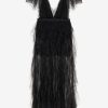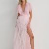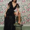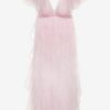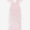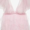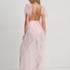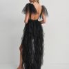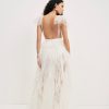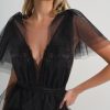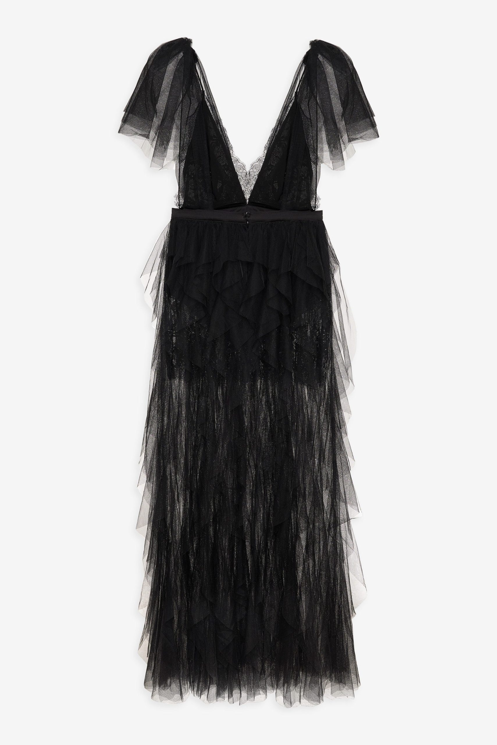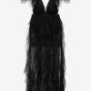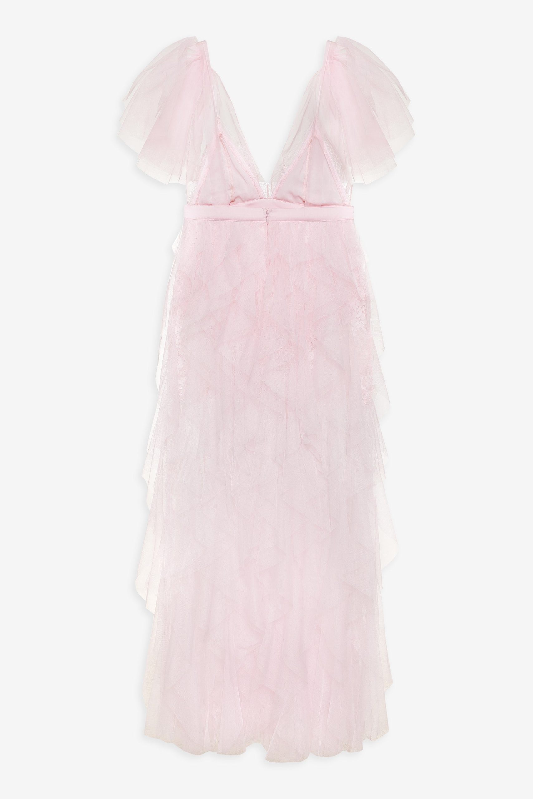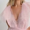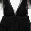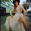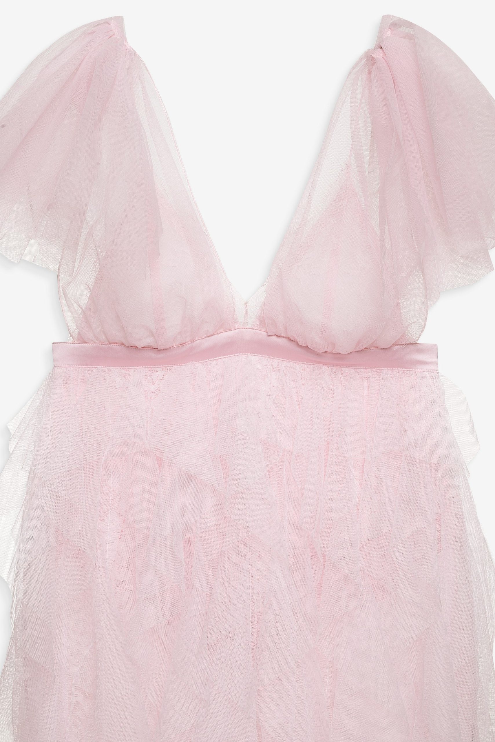 The perfect blend of ethereal elegance and detail-driven romance—the Maxine white gown is a true show-stopper. Crafted in a dramatic soft tulle, this bridal gown spotlights an alluring plunge neckline, a low open back, and cascading gathered ruffle tulle atop a floral lace underlay bodice and mini skirt.