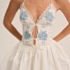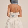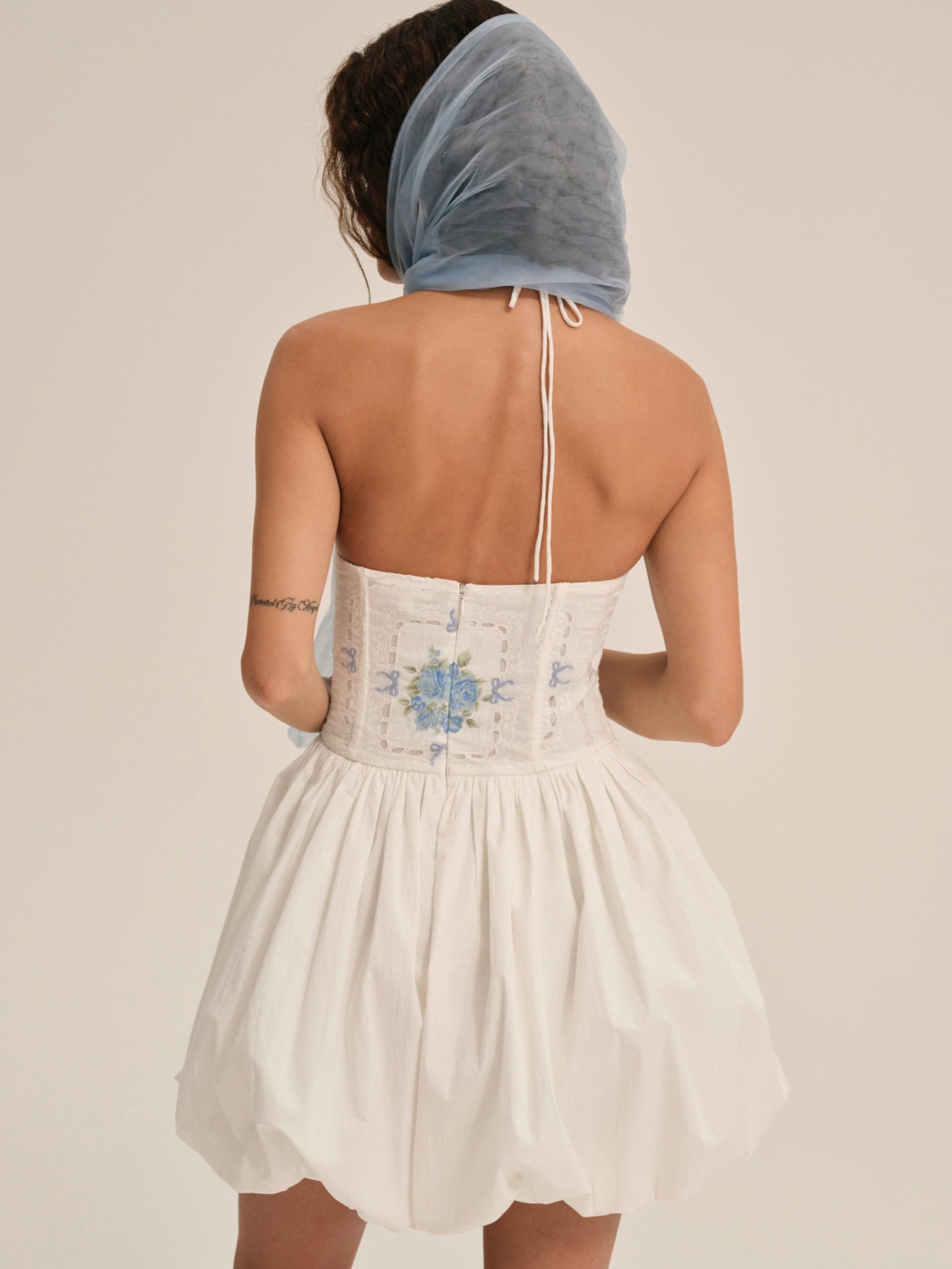 The McKinley white mini dress is the perfect floral dress for a summer by the water. Crafted in a cotton poplin and adorned with blue floral embroidery and lace trims, this mini dress with a puff skirt features a functional halter tying neckline, and boning at the side and princess seams.
