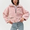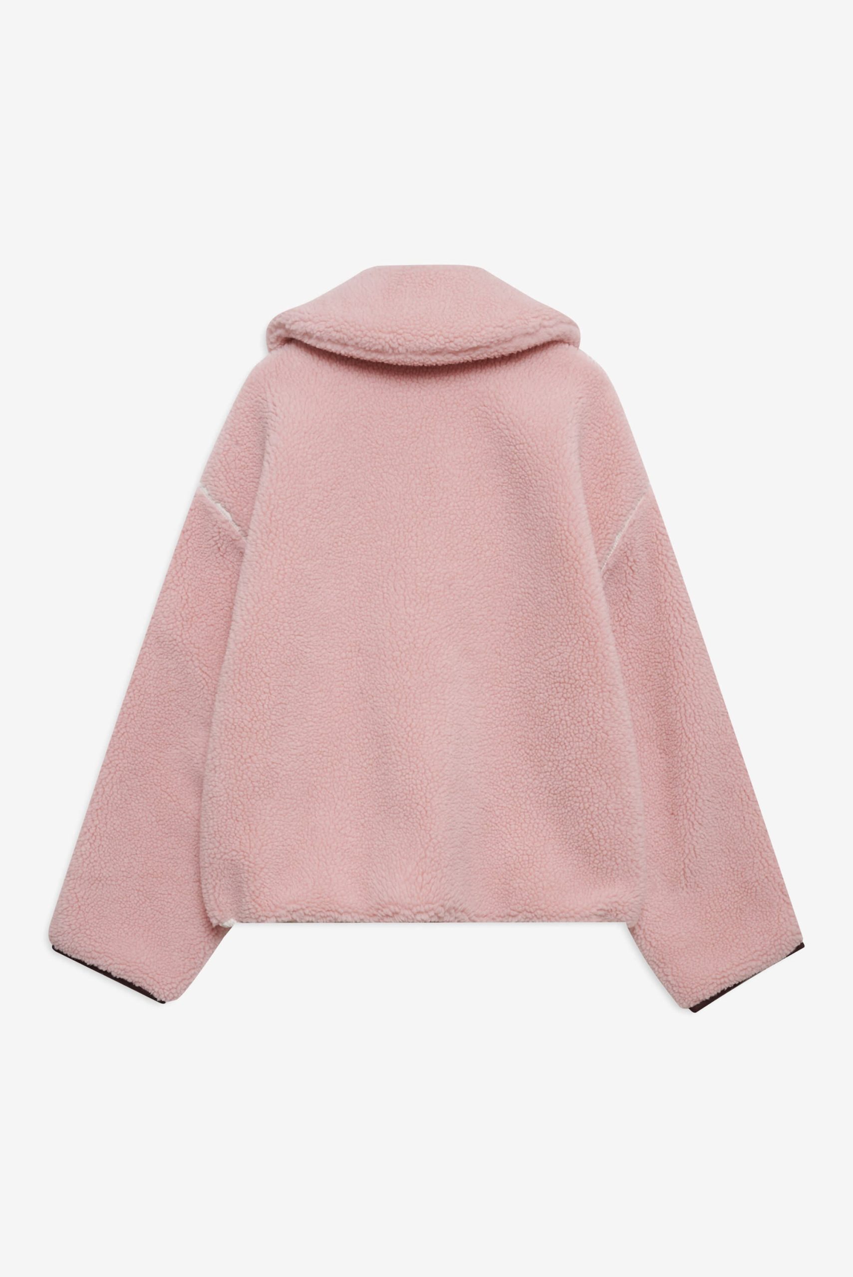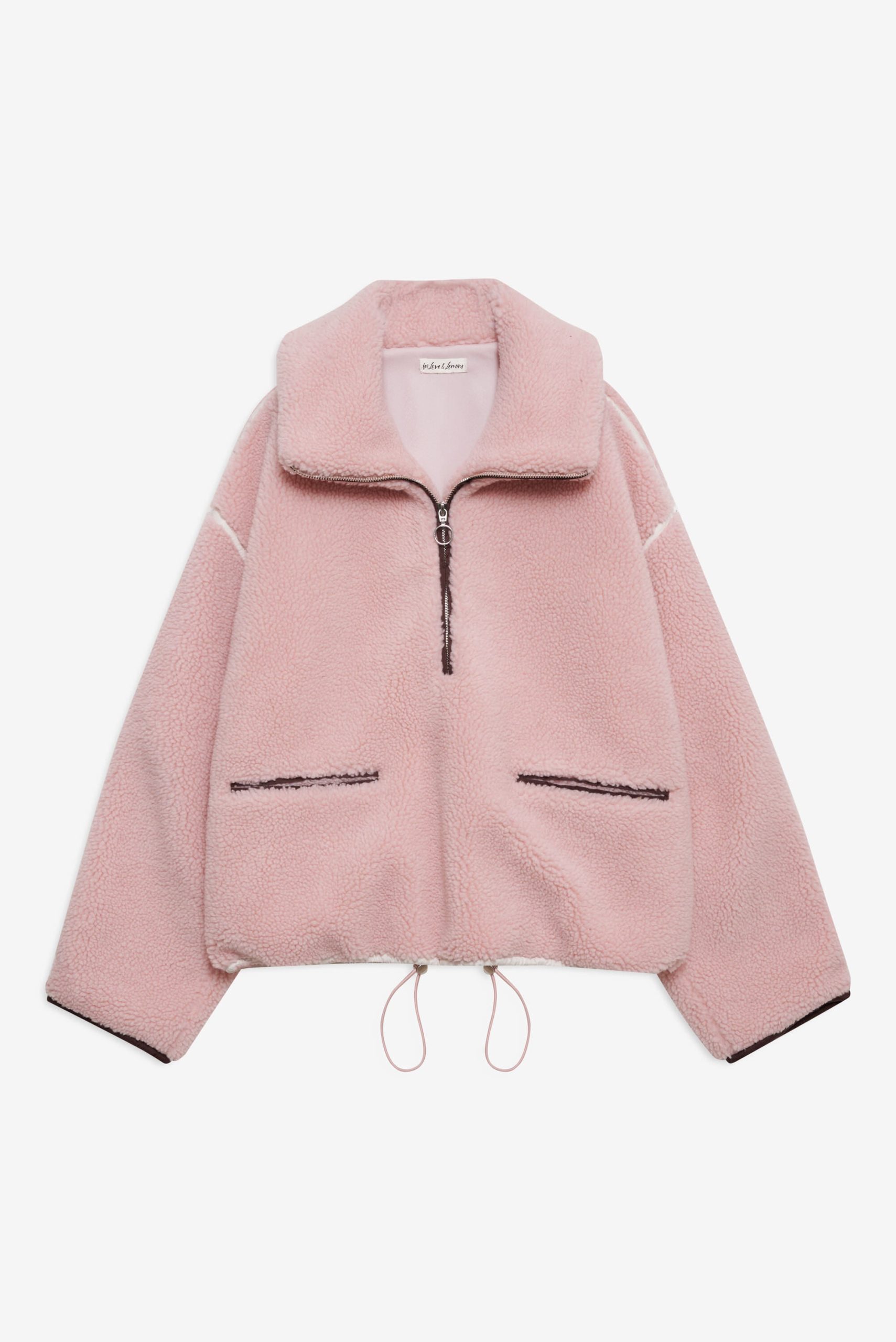 Embrace the cozy days ahead with the Melody pullover sherpa jacket—a pink fleece jacket cut to an oversized boxy fit with a functional half-zip detail, front welt pockets, and contrast brown and white bindings throughout.