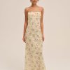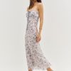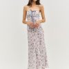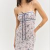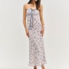 From the sea to the city, the Midsummer bias cut dress is perfect for any and all of your late summer destinations. This maxislip dress is rendered in a nautical-inspired printed chiffon and adorned with a slotted lace ribbon trim and a functional tie at the neckline.