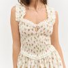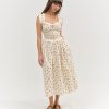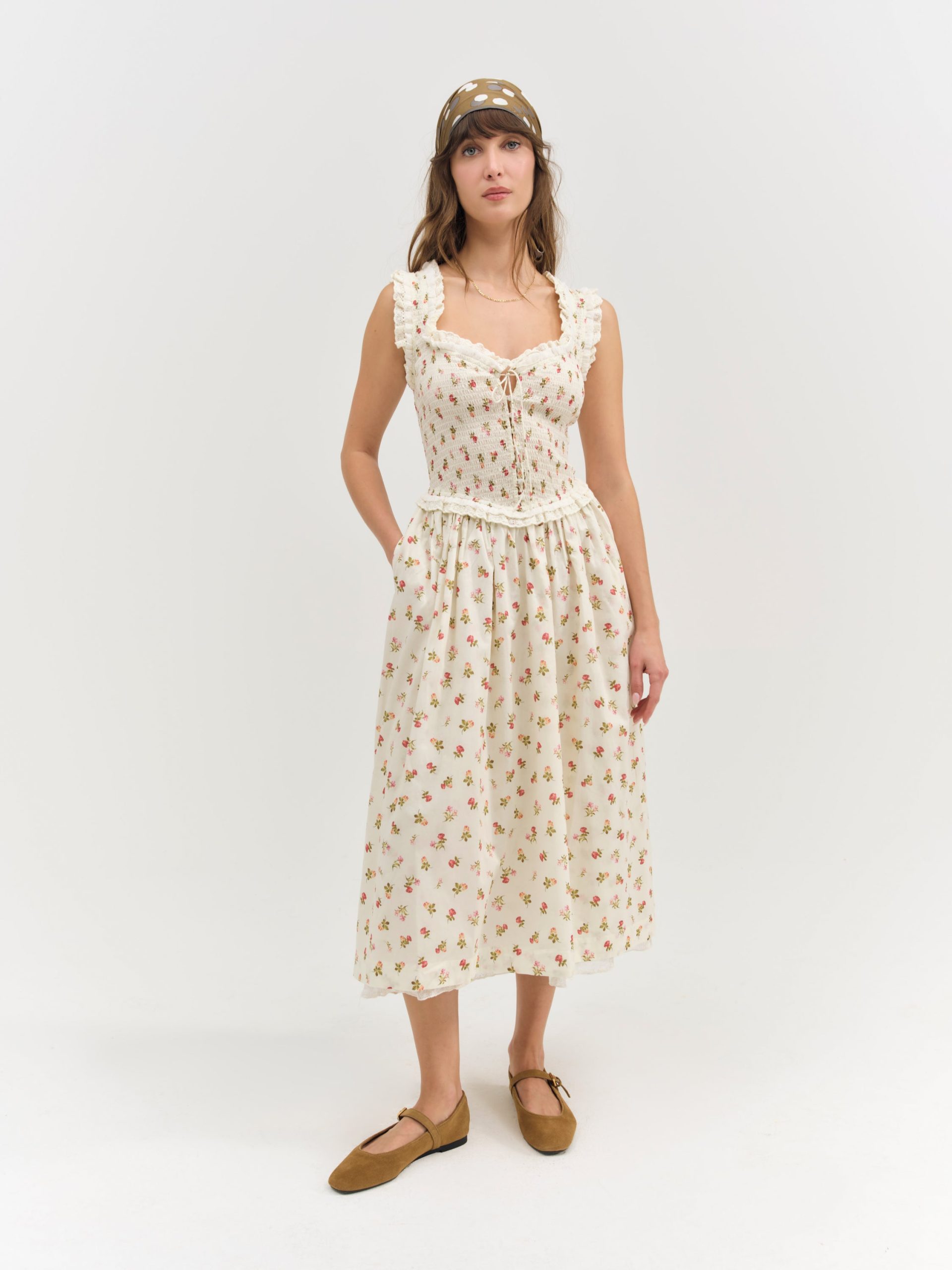 With its charming vintage-inspired silhouette, the Morgan cream midi dress is the perfect piece to bridge the seasons beautifully. Featuring an ultra-flattering smocked bodice—this floral dress has a feminine gathered skirt and is adorned with ruffled eyelet trim.