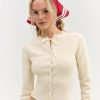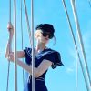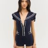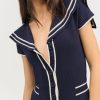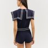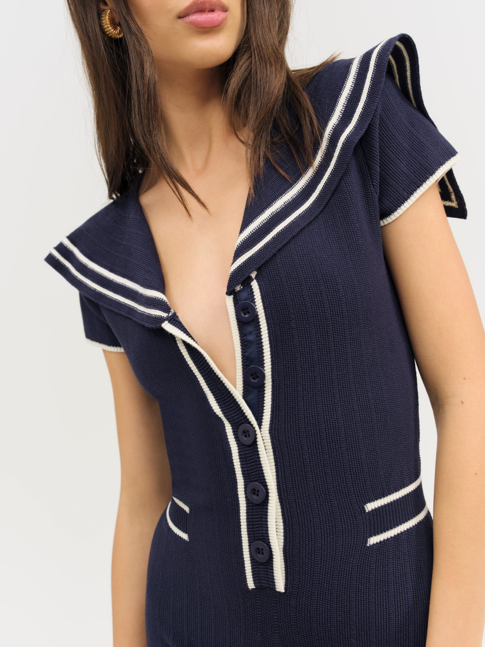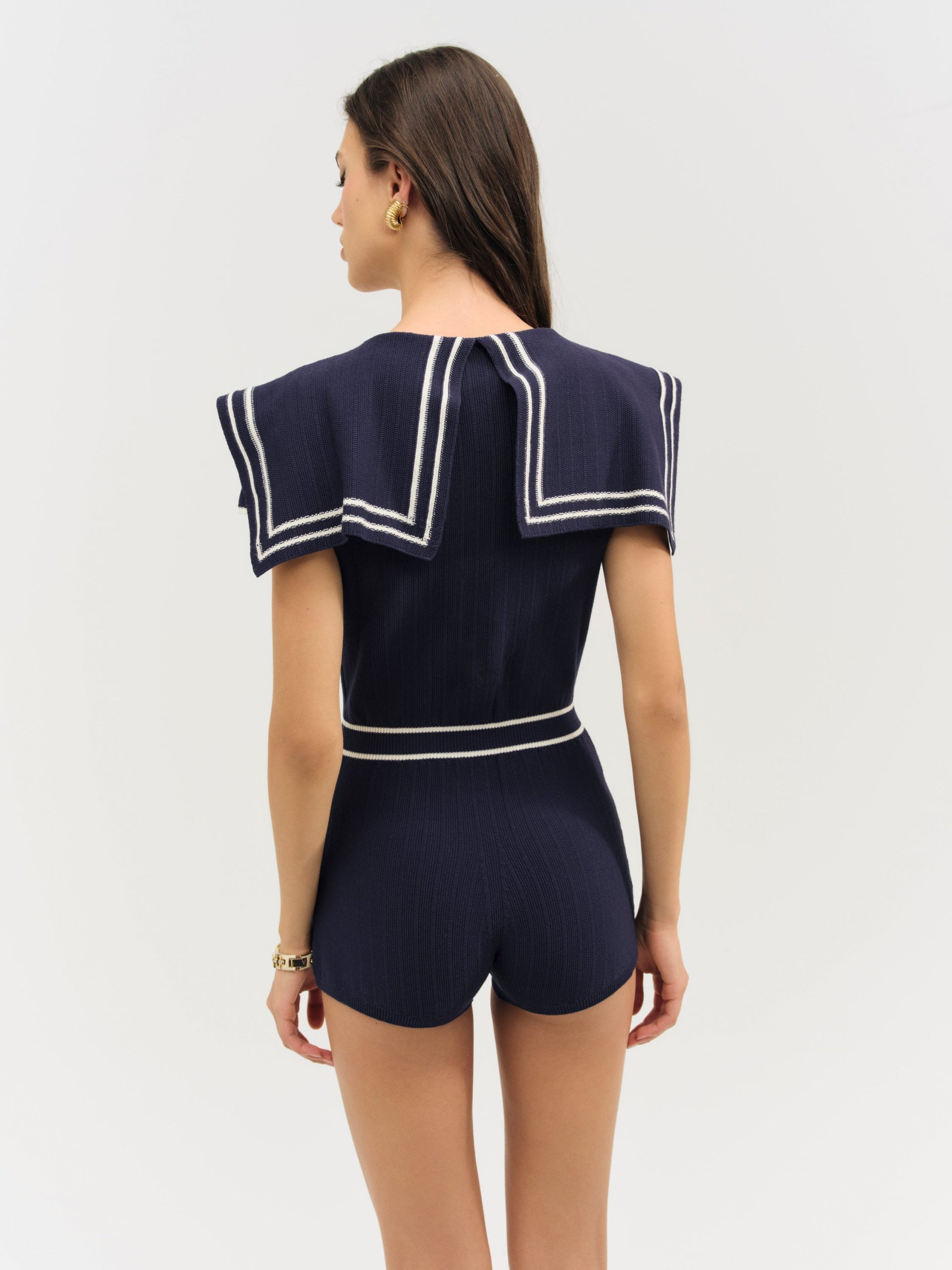 Embrace sailor girl fall with the Naomi knit romper—a cozy navy knitted jumpsuit that spotlights nautical-inspired contrast knit stripes, a dramatic sailor collar, short sleeves, and shell buttons at the center-front.