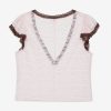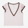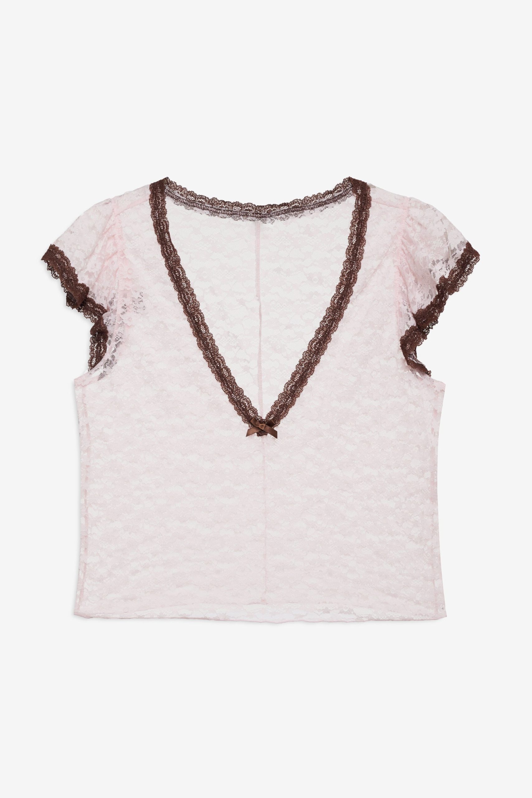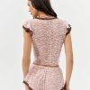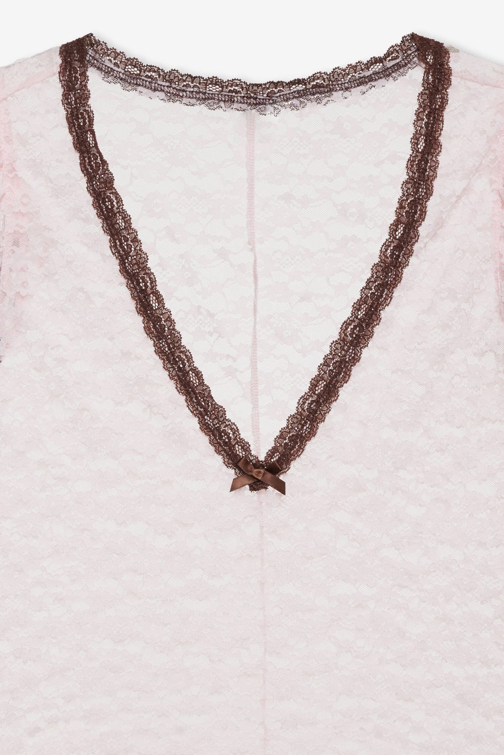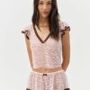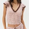 Bring ease and elegance to your everyday with the Pamela lace top. Effortless, pretty, and personal, this sleep top is crafted in an allover stretch lace and spotlights a v-neckline, flutter sleeves, and is adorned with contrast lace trims, a lettuce hem, and decorative bow at neckline. Pair this pink crop top with the Pamela Sleep Short for the complete pajama set.