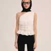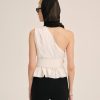 For a polished, minimal effort look, the Quinne white top exudes vintage charm. Crafted in a crisp poplin, this one shoulder top features a gathered bodice, ruffled detail at hem, and includes a wide belt.
