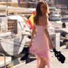 Made for sun-drenched days and yacht-side soirees, the Raspberry Rose ruffle mini dress is crafted in a dainty rose jacquard that exudes femininity. This pink mini dress is adorned with cascading ruffles throughout and an asymmetrical fringe hem.
