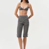 We’re falling for the Savannah capri pants this season—a pair of mid-rise cropped pants crafted in a check suiting fabric with side seam slits and a chic decorative bow.